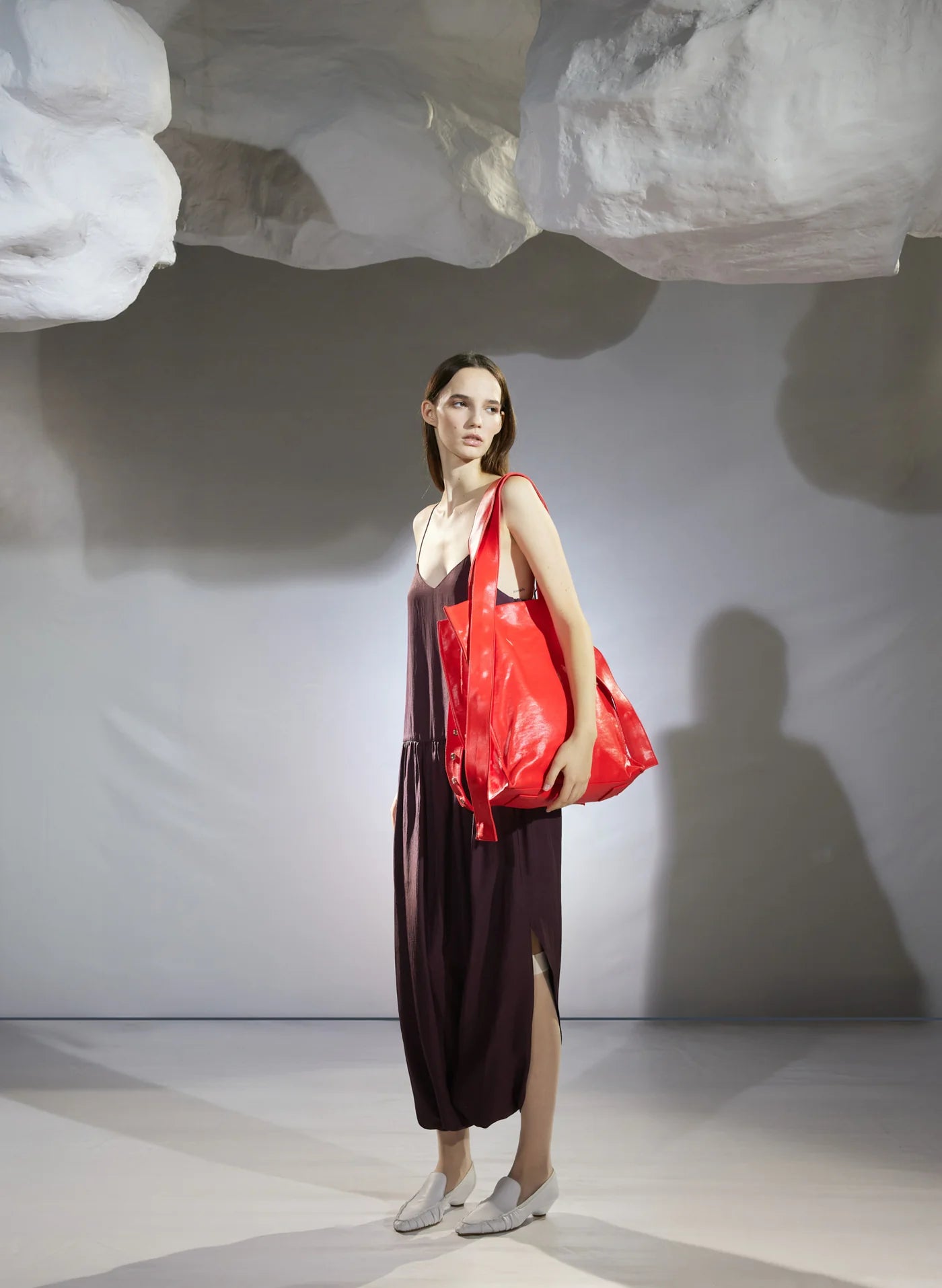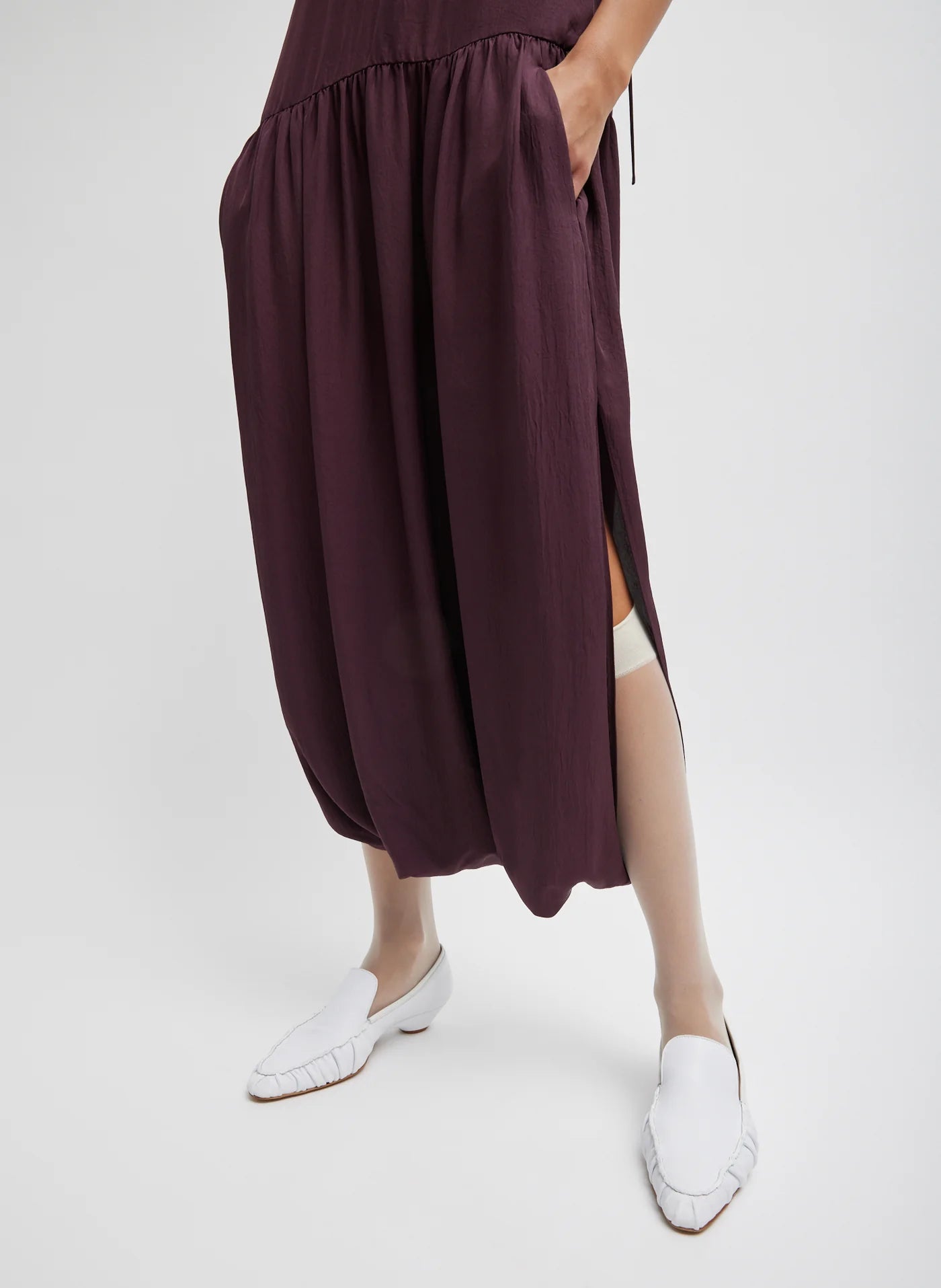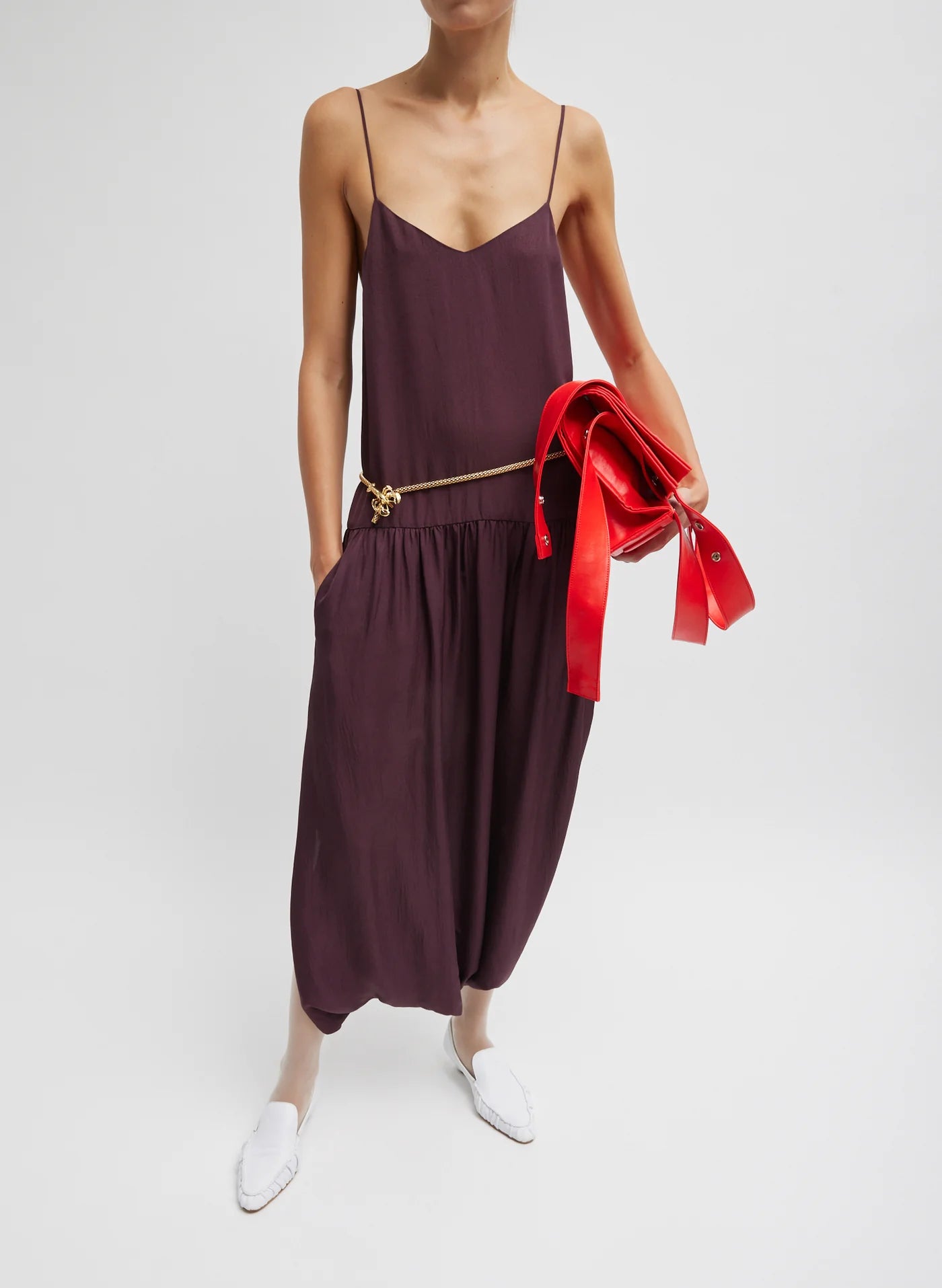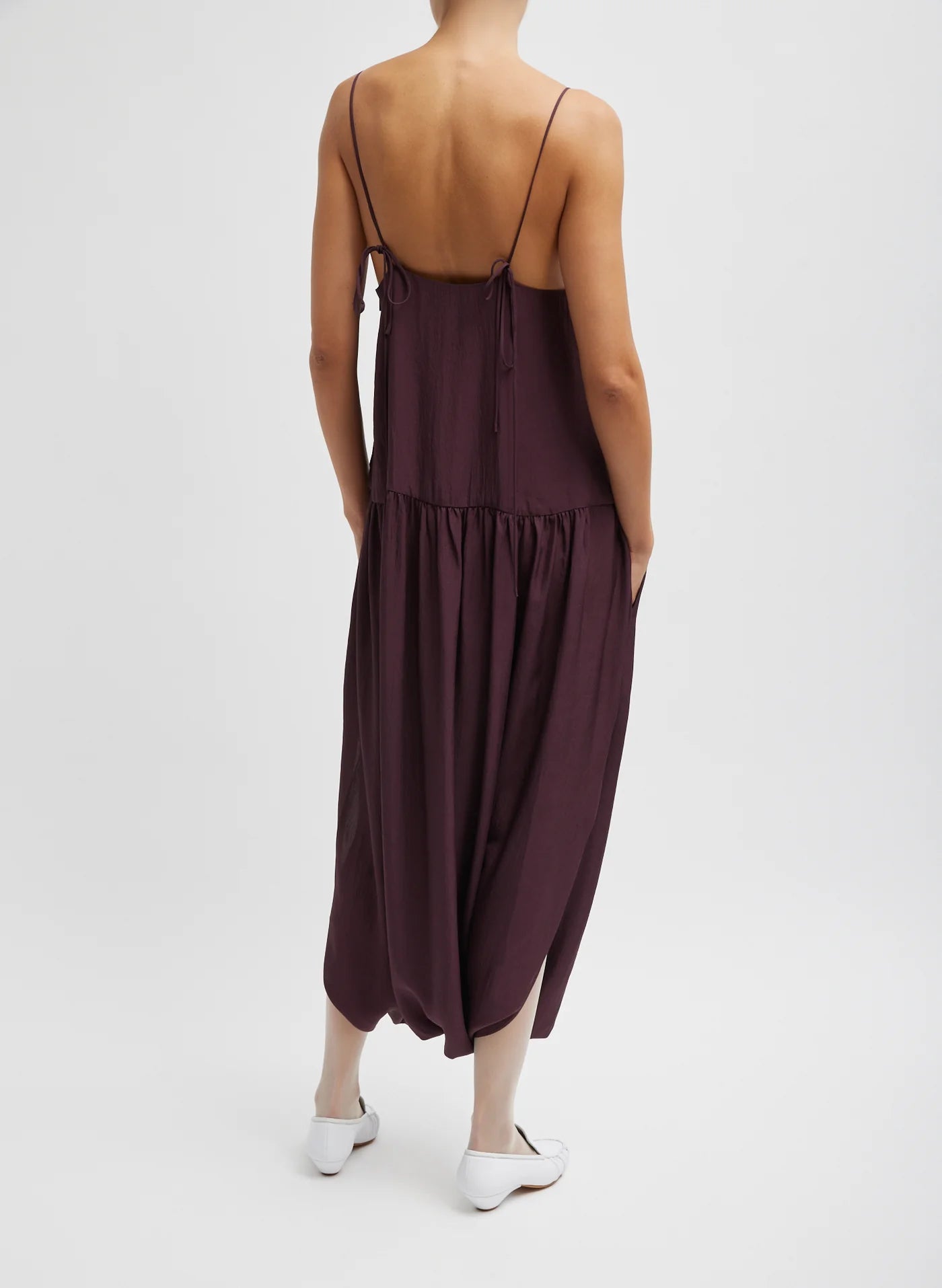 The Spring Acetate Strappy Jalouise Dress, crafted from lightweight Japanese acetate twill, redefines what it means to be Chill, Modern, and Classic. Adjustable tie straps allow for multiple styling options, while a drop waist and gathered hem create a pant-like silhouette that breaks away from traditional dress codes. Perfect for day-to-night dressing.