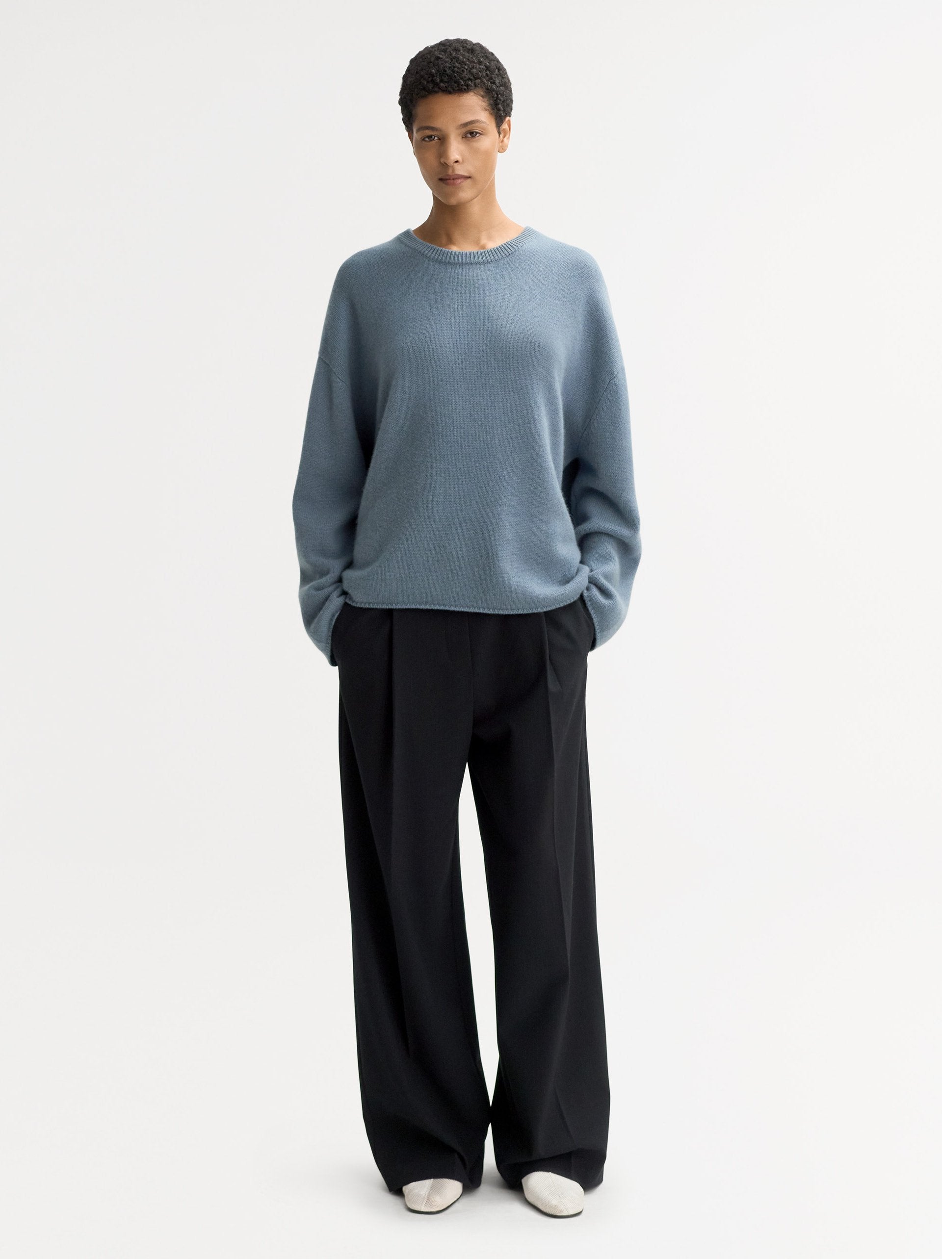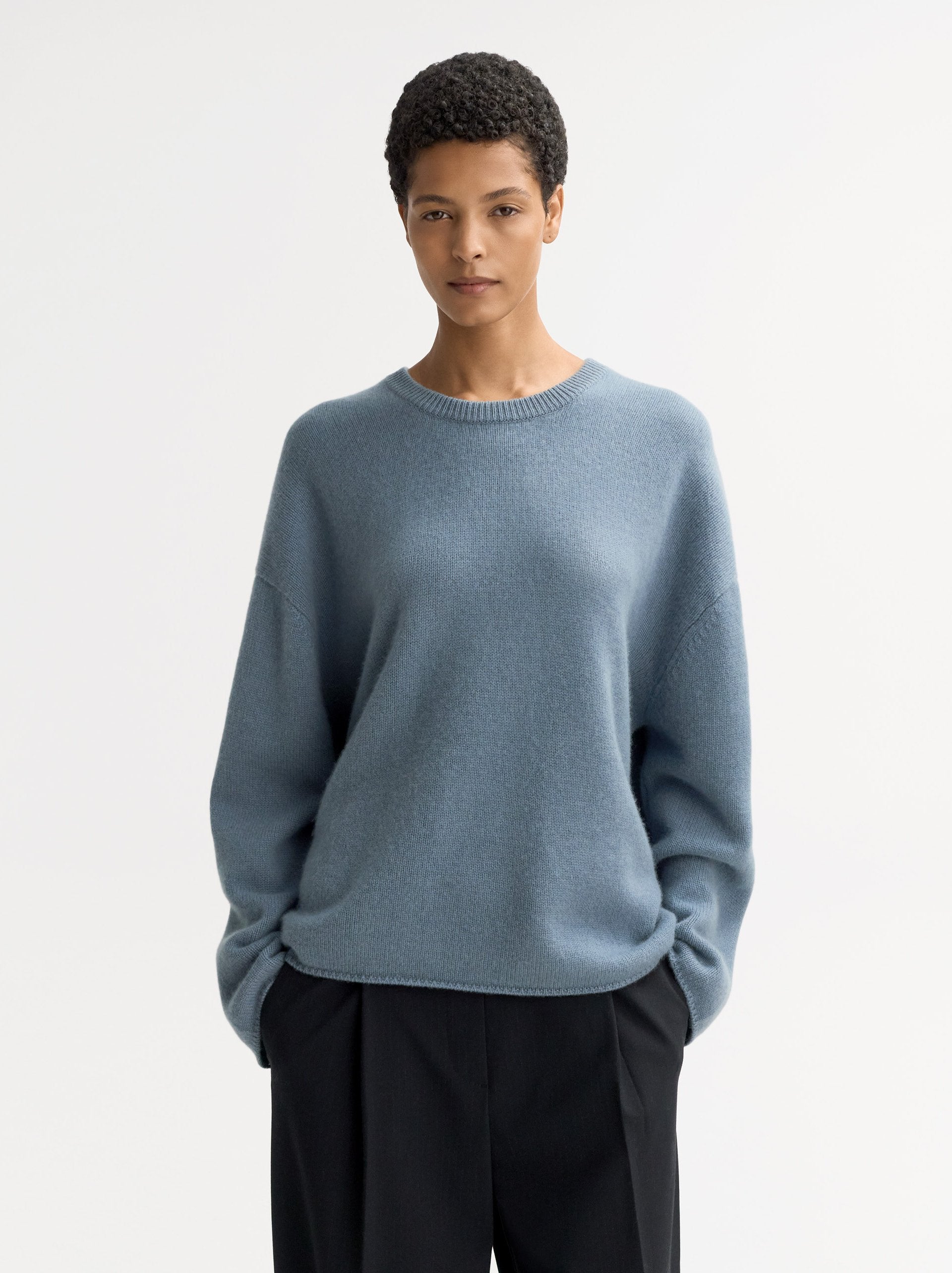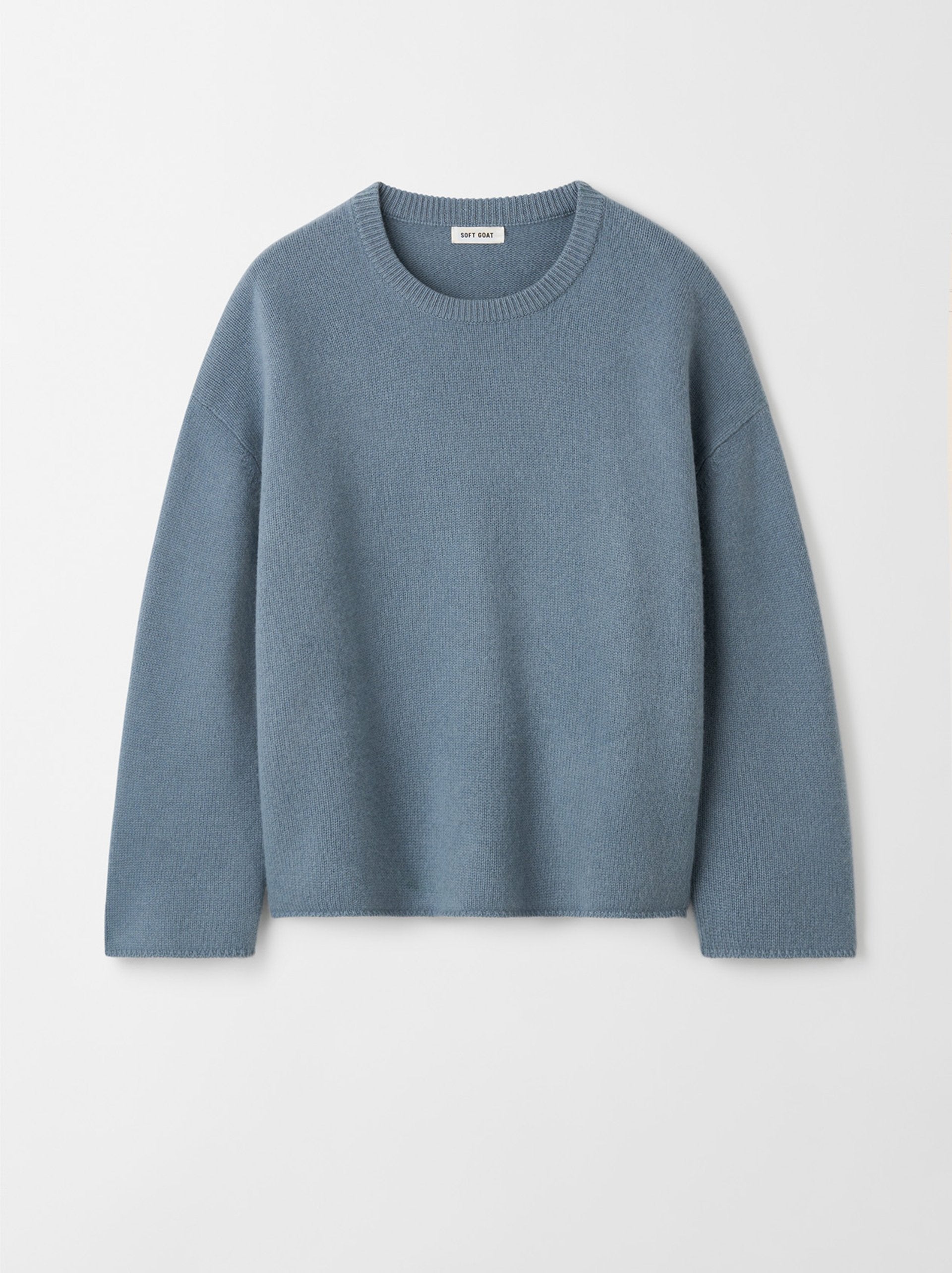 Wrap yourself in luxurious comfort with this Relaxed Fit Cashmere Crewneck Sweater from Soft Goat. Crafted from 100% premium-quality cashmere, this timeless piece combines understated elegance with everyday ease. The relaxed, slightly boxy silhouette offers a flattering fit, while the finely ribbed cuffs and hem provide subtle structure. Its versatile grey tone makes it an essential layering piece for any wardrobe — perfect for dressing up or down.