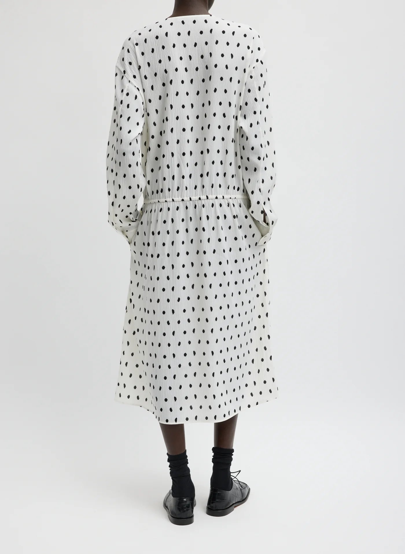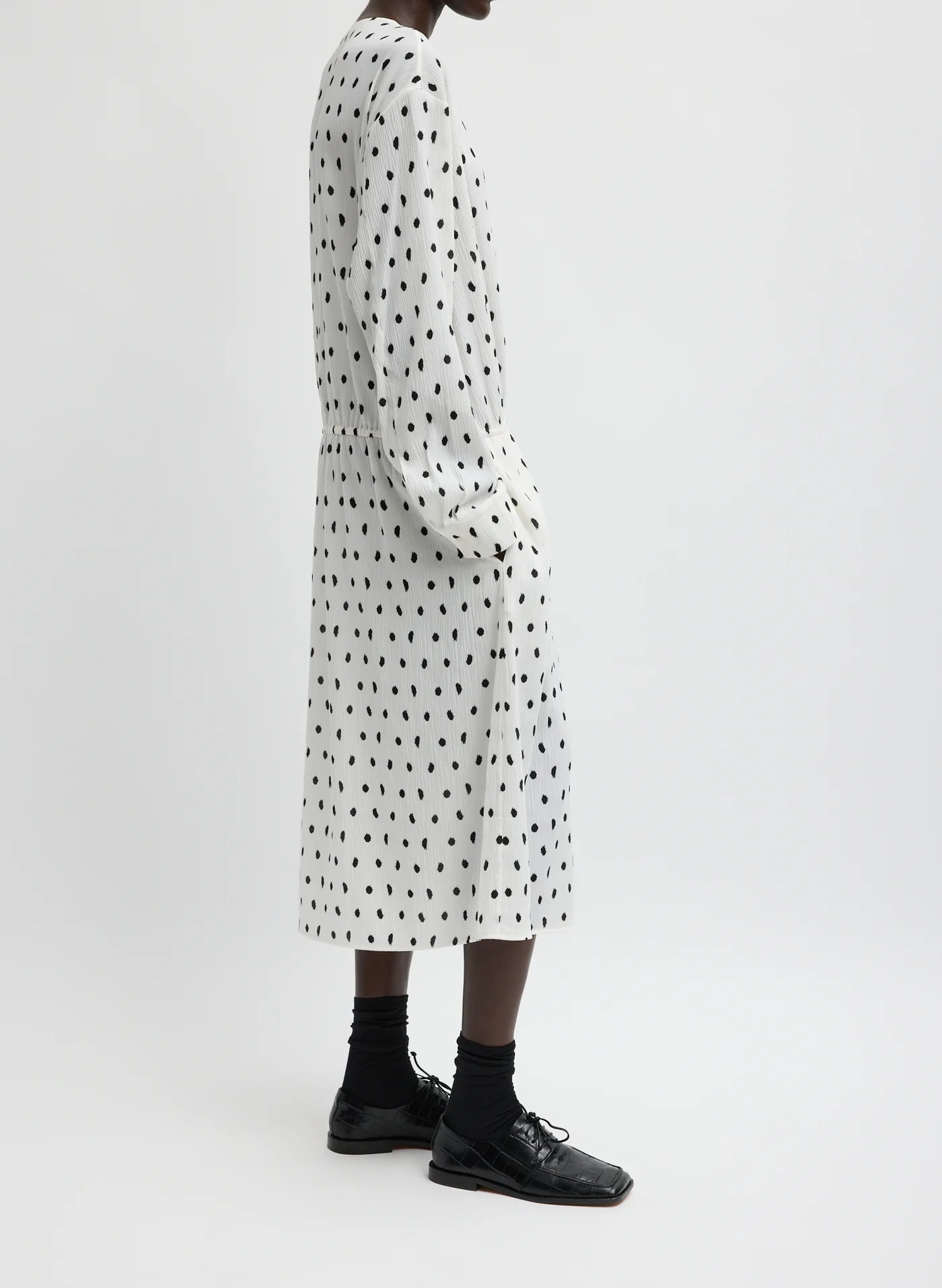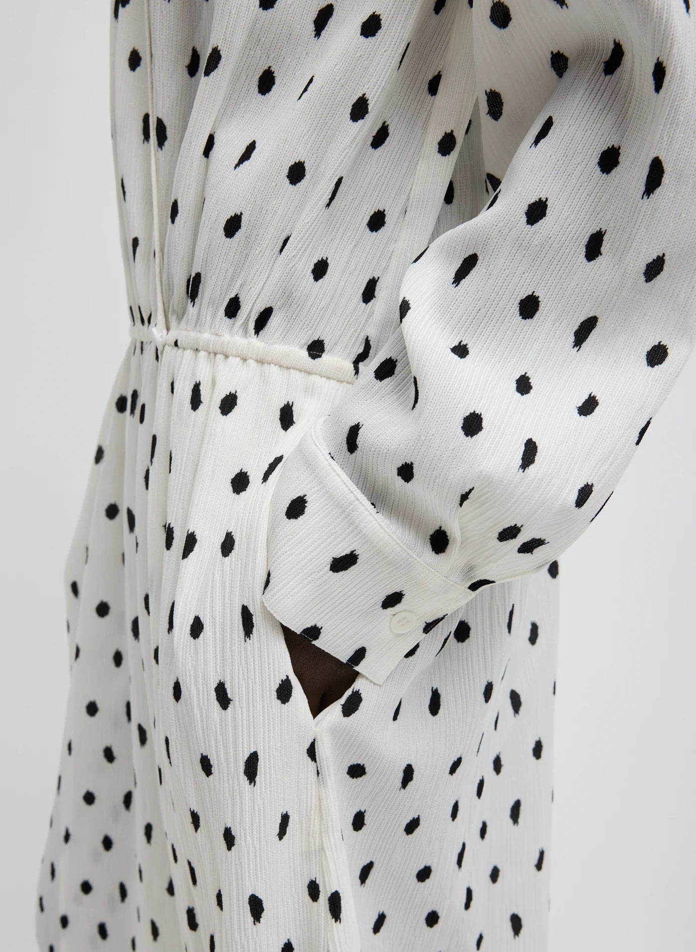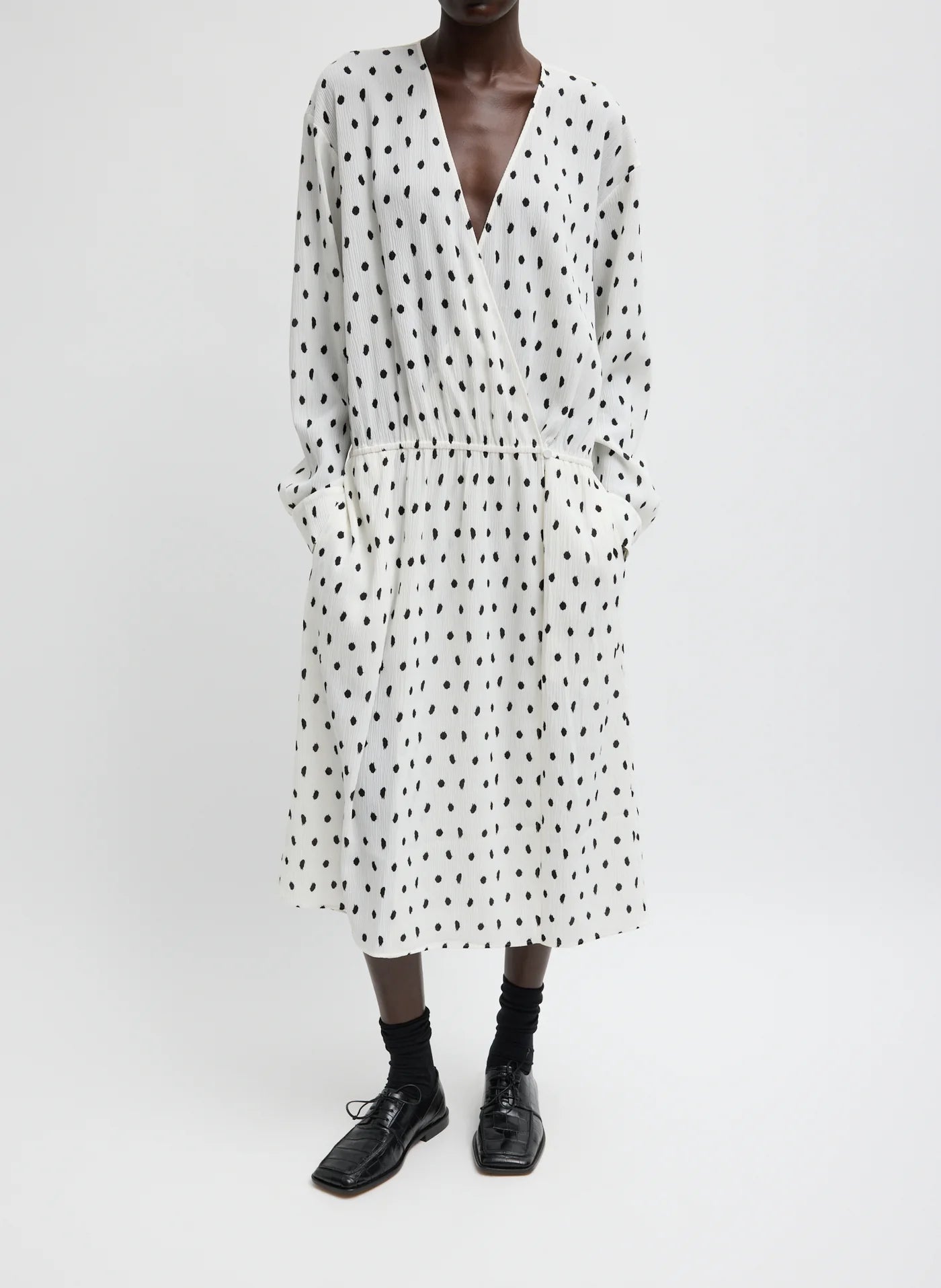 The Scribble Dot Print Stretch Plissé Wrap Dress introduces a new expression of versatility. Crafted in recycled nylon and featuring a custom Tibi digital print, this style includes an elastic waistband and button closure for effortless adjustability. Lightweight and polished, it moves seamlessly from day to night—wear it to the beach over a swimsuit or dress it up with a heel for a modern take on occasion dressing.