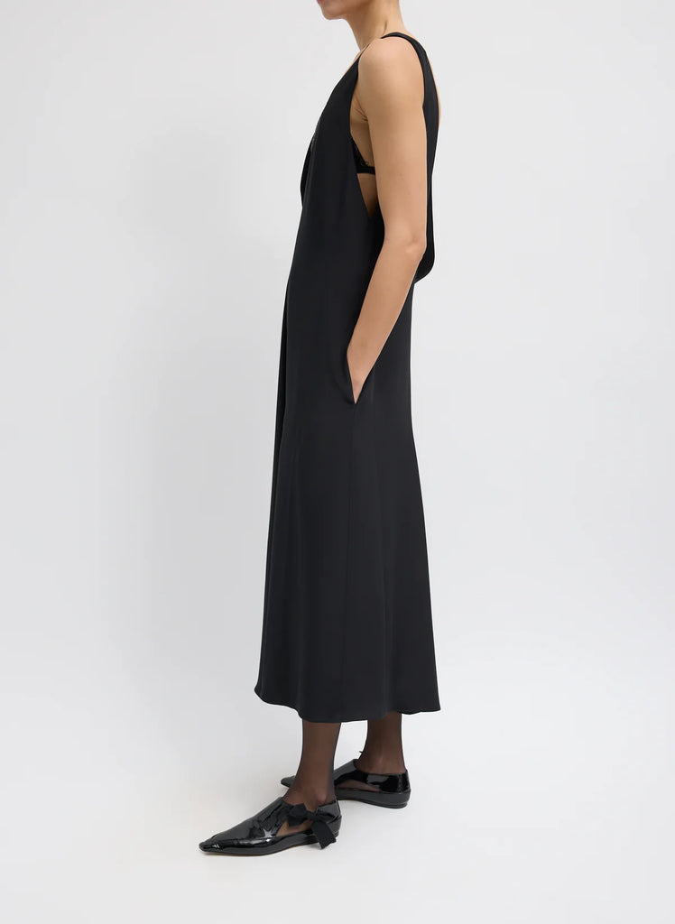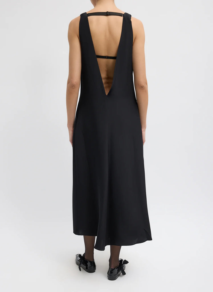 Dressing with intention becomes effortless when you have the right tools. The 4 Ply Silk V Neck Dress is designed to be that MVP. Sustainably produced with precise tailoring, it features a deep V at the front, back, and sides to reveal a sequin bralette, a tank, or any chosen layer. An adjustable detachable strap at the back provides security while side pockets add pragmatic function. In Rings 1 or 2, it works seamlessly with monochromatic hosiery and a Milbourne Heel for a holiday moment or a Janos Flat for laid back sophistication.