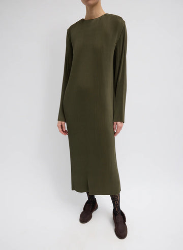 An exploration of texture and movement. The Plissé Midi Dress is cut in custom pleating on an ultra light stretch base with a softly wrinkled finish that is equal parts ease and intrigue. Designed with an exaggerated shoulder and clean shift shape, the pleats catch the light and create dimension with every step. Offered in three hero shades across the Color Wheel, Ring 2 Dark Navy, Ring 3 Green, and Ring 4 Red, it adapts to mood and setting. Ground with monochromatic hosiery and a heel for polish, or style with the Harry Boot for nonchalant ease.