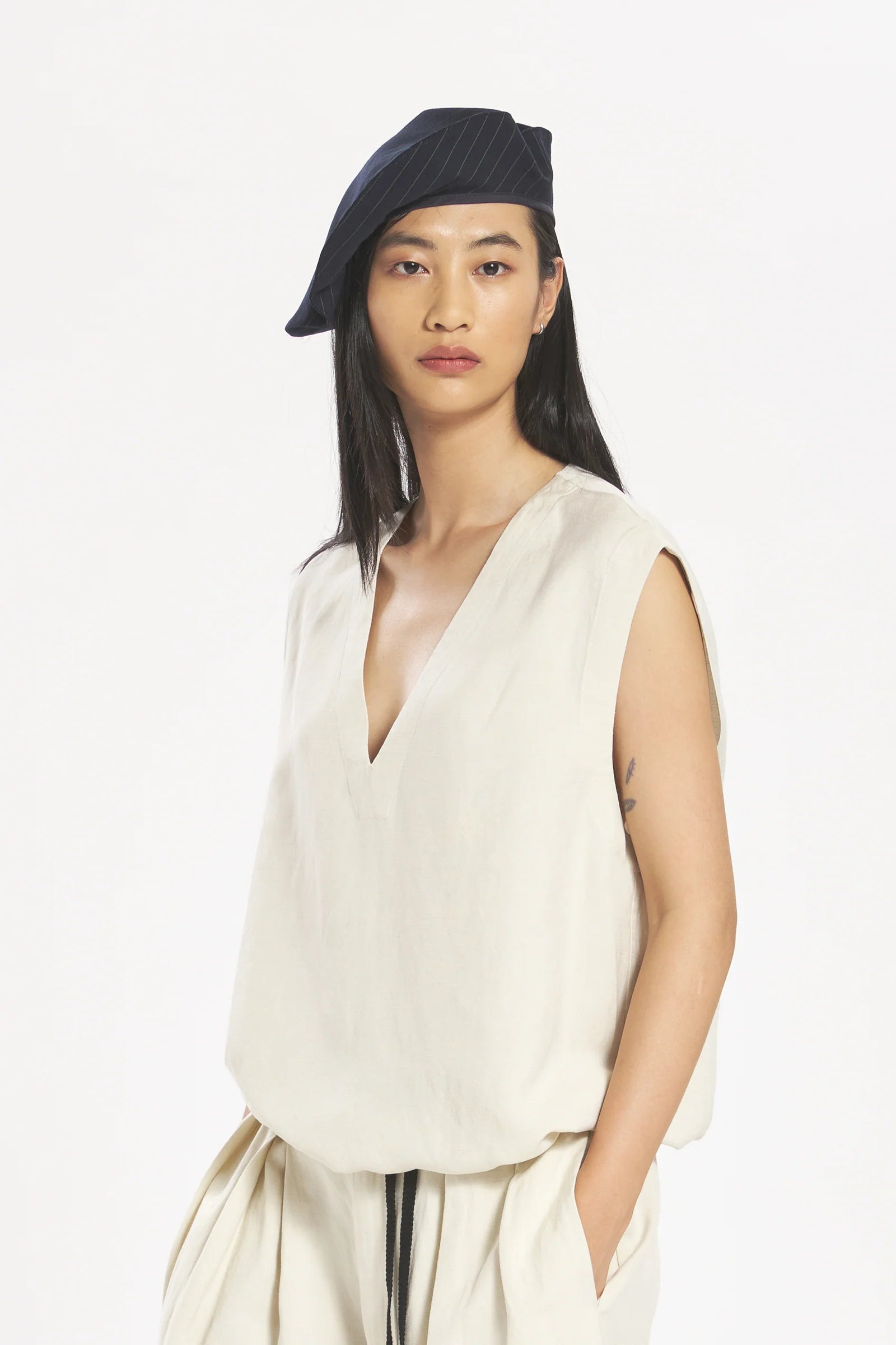 Light, fluid linen–viscose canvas shapes this relaxed V-neck sleeveless top, complete with an inner adjustable drawstring at the hem. Composition: 70% Viscose, 30% Linen