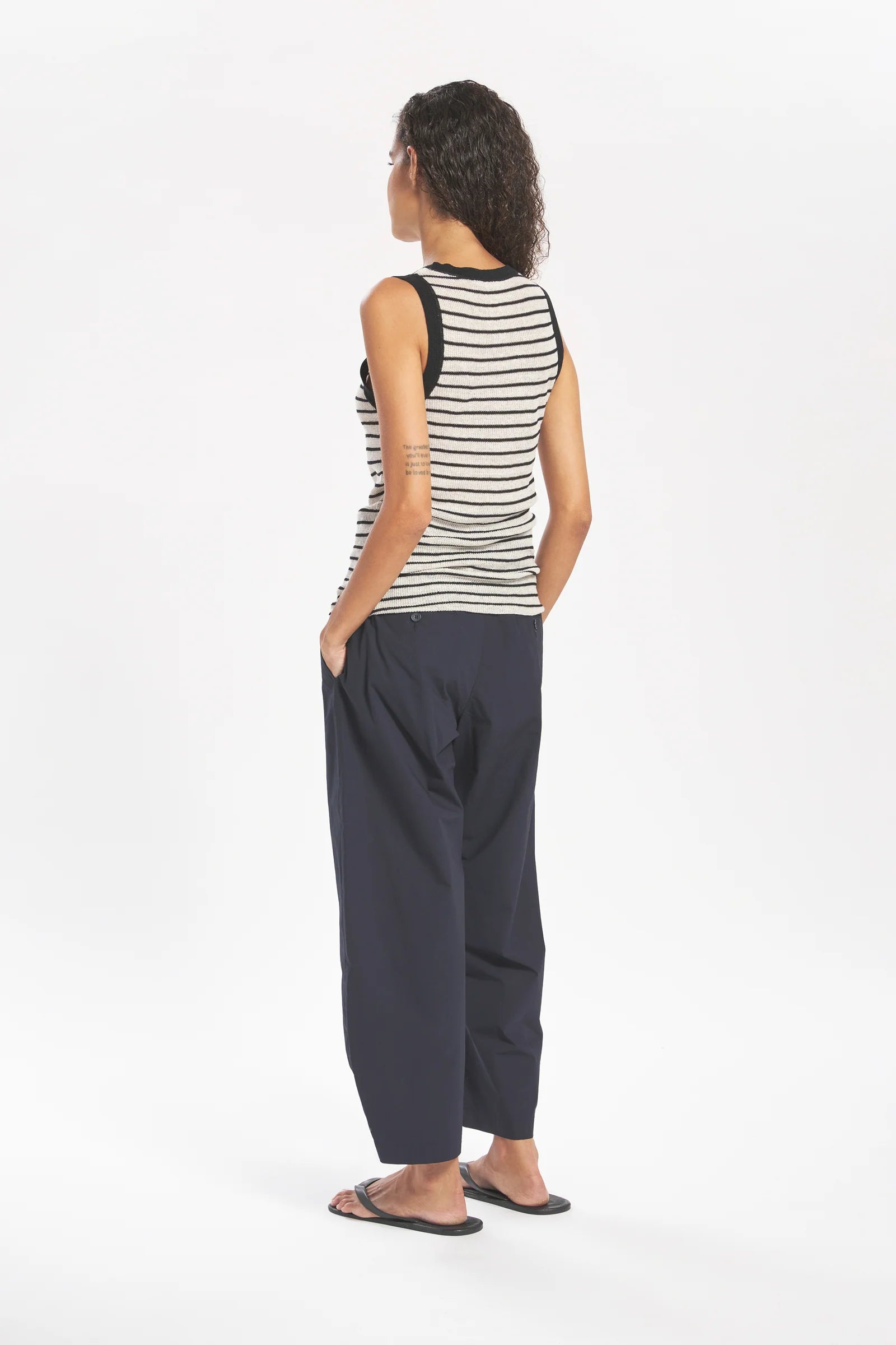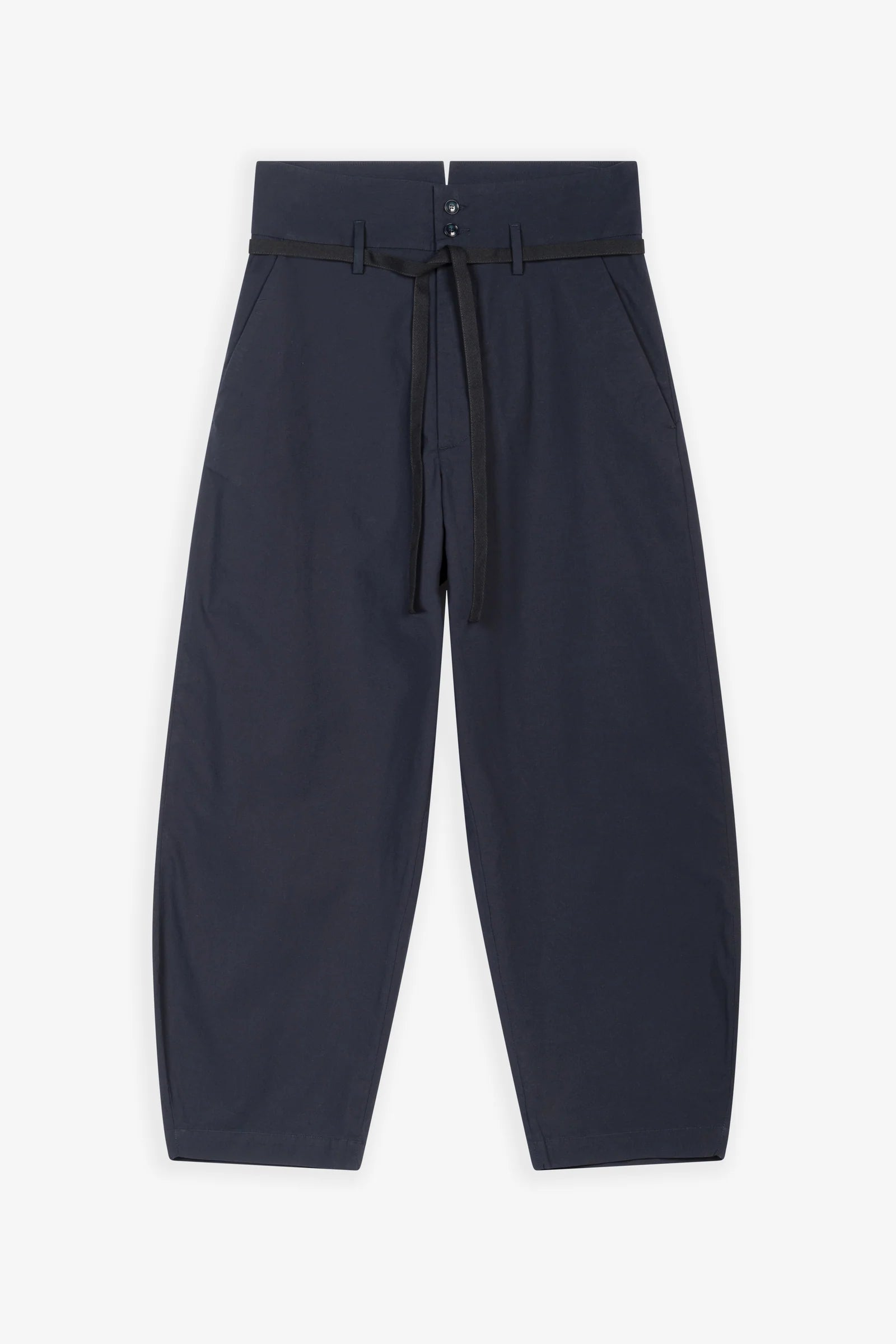 These high-waisted trousers are characterised by a comfortable silhouette and a round-shaped leg. The stretch poplin, a lightweight fabric with a soft, smooth texture, adds a contemporary touch to the Candiano trousers, enhancing their versatility and making them suitable for both casual and refined occasions. A cotton black string is included. Composition: 97% Cotton, 3% Elastane