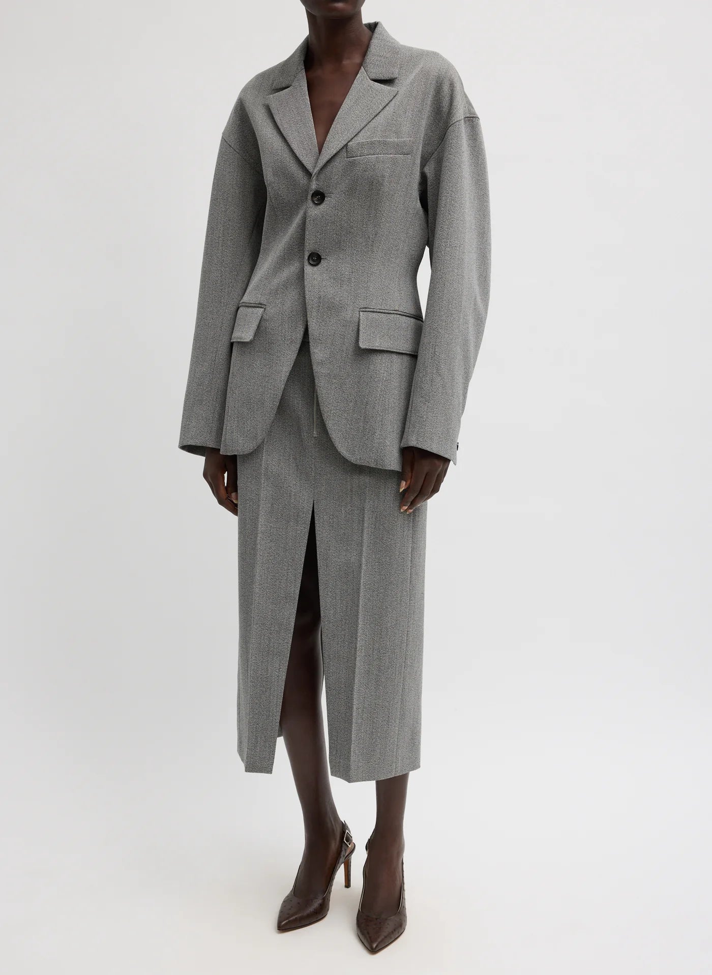 The Structured Wool Zip Front Midi Skirt brings movement and edge to classic tailoring. Crafted from the same firm, refined wool, it features high slits at both the front and back for ease, fluidity, and visual impact. Designed with a zip-front closure, pockets, and belt loops, this skirt is easy to dress up or down. Pair it with the matching Structured Wool Blazer for a head-to-toe suiting moment, or style it back to coordinating tailoring for a more relaxed take.