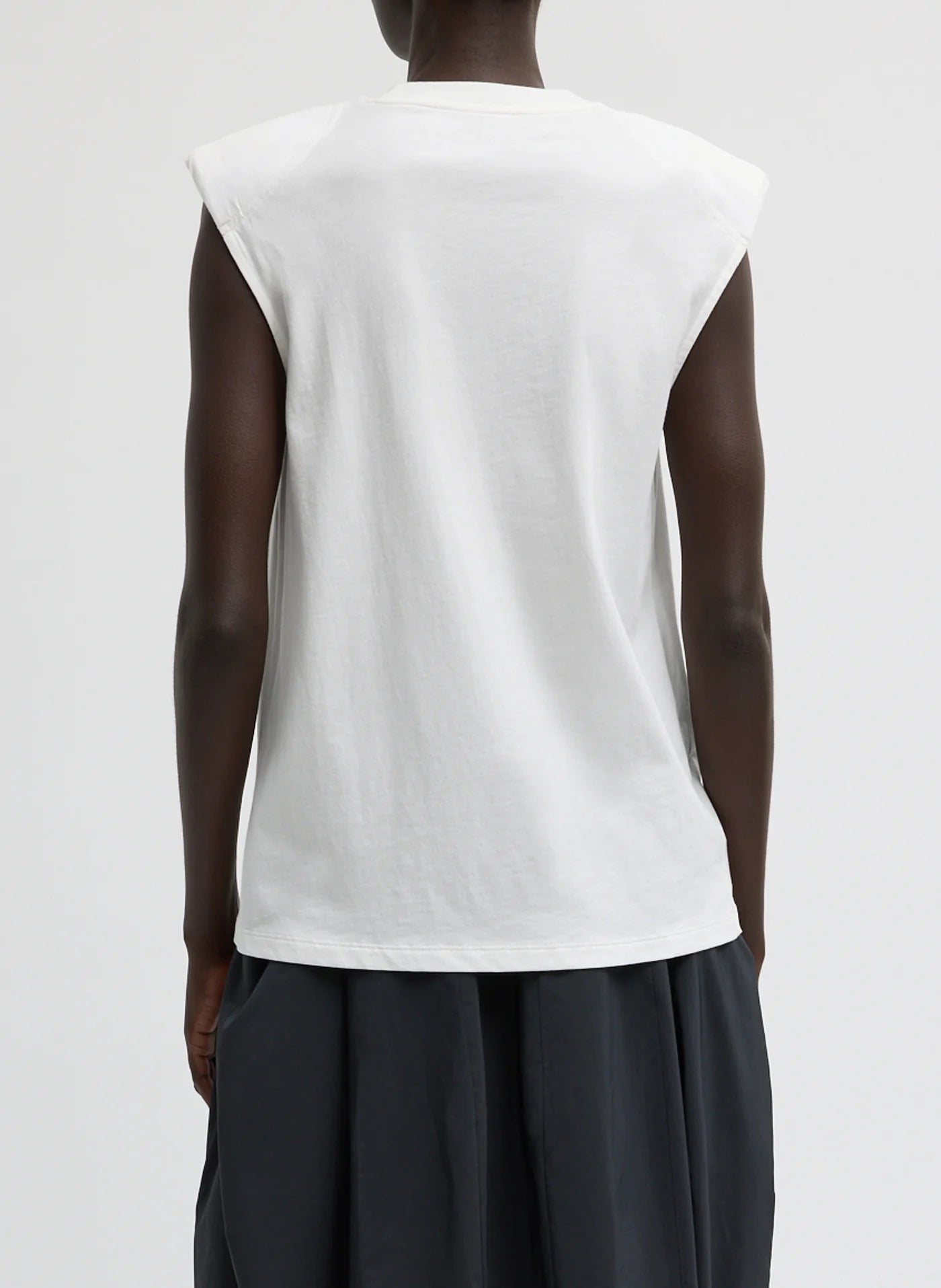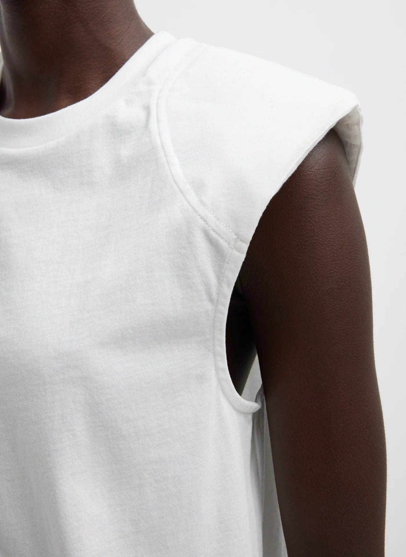 Made from medium-weight cotton jersey, the Padded Shoulder Sleeveless Top introduces subtle structure through built-in shoulder padding. The result is a silhouette that adds dimension without stiffness, making it effective worn alone with trousers or skirts or layered under blazers for a more defined shape. Designed for comfort and repeat wear, it brings intention to simple outfitting.