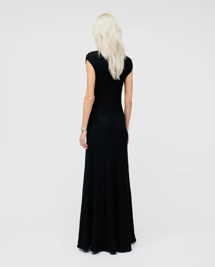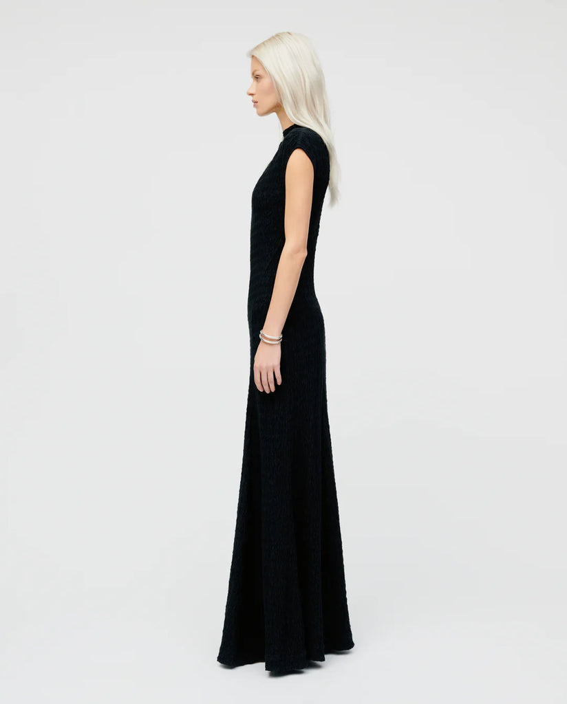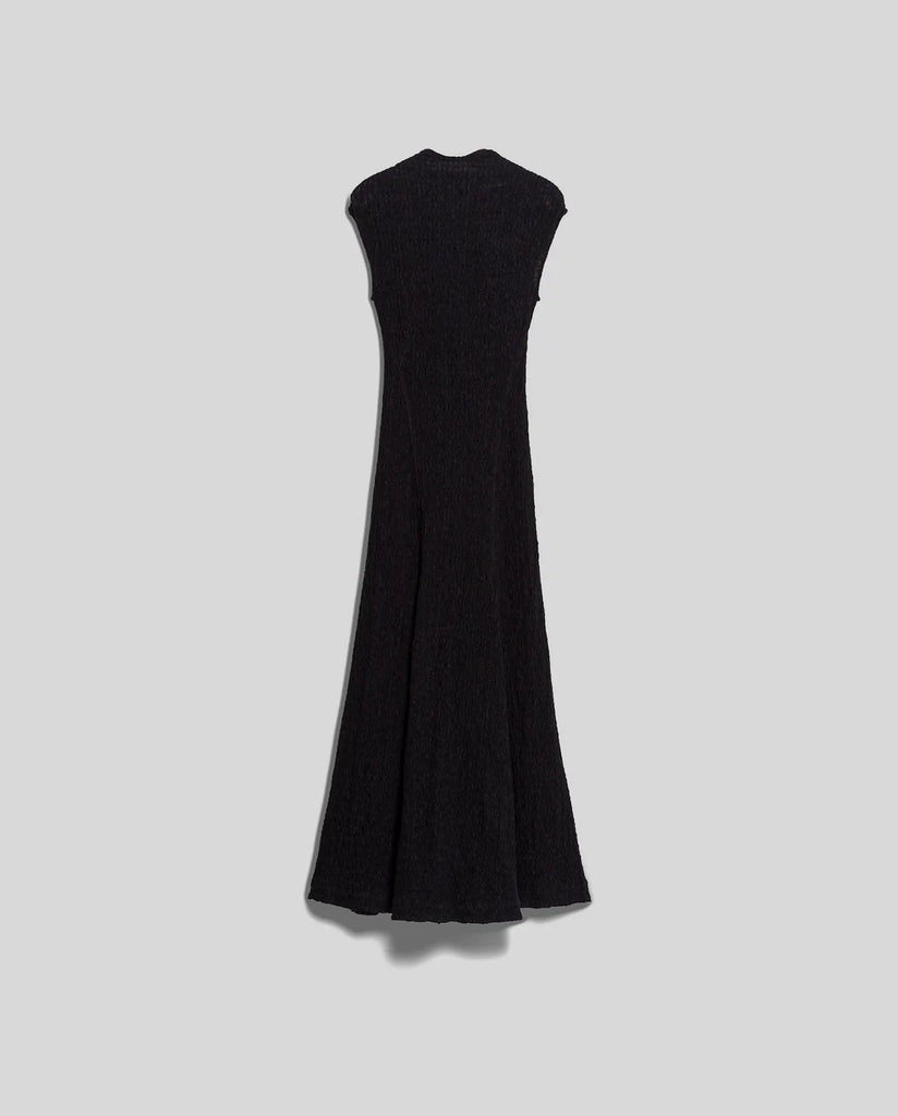 The ankle-length MARCELLA dress has a body-hugging fit at the top and a flowing skirt. It has a slight stand-up collar and a zip at the back. The material is elastic.