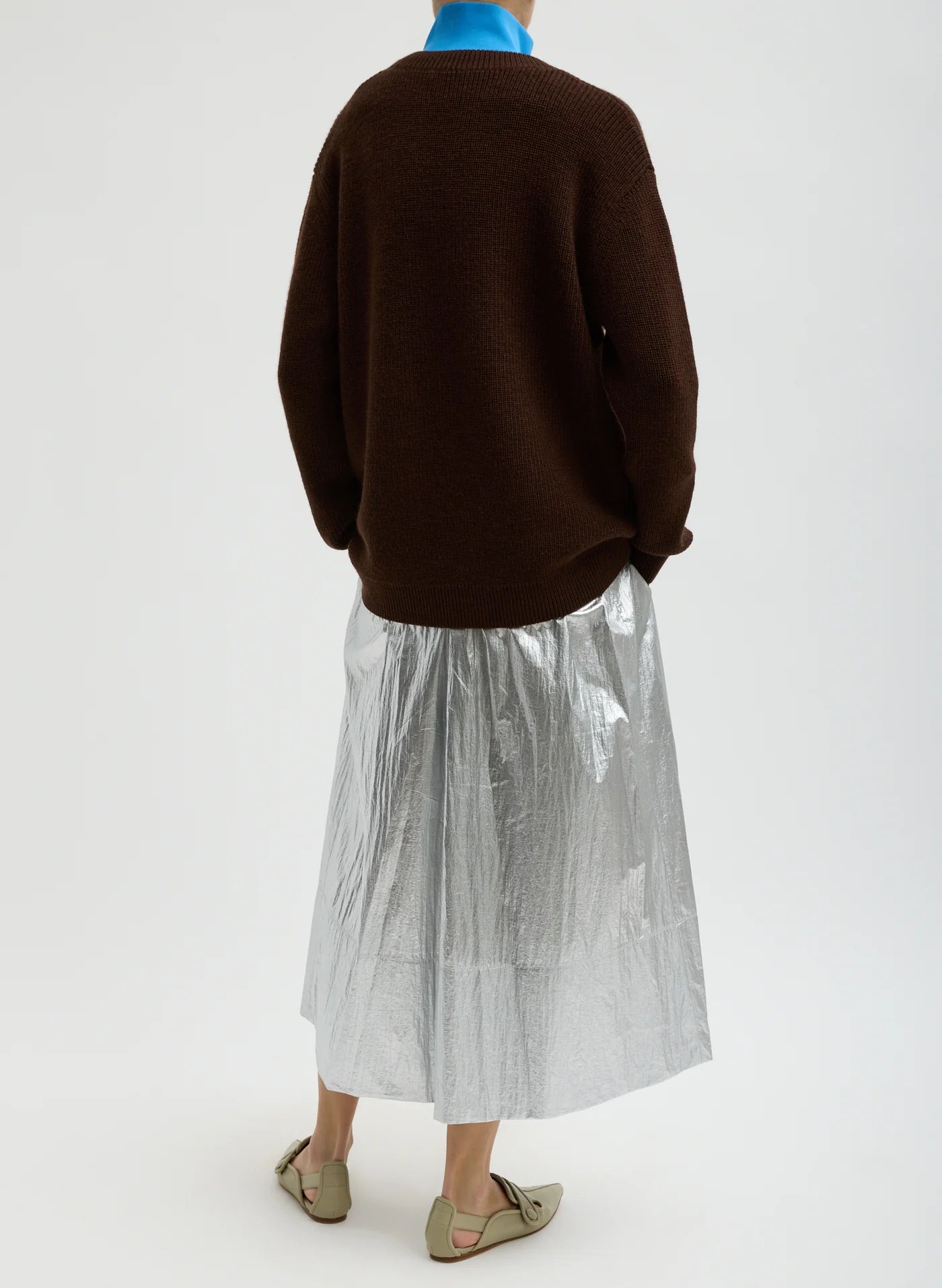 Crafted in a lightweight fabrication with a silver foil finish, the Metallic Nylon Pull-On Full Skirt brings ease and impact to every wardrobe. This best-selling silhouette features an elastic waistband and functional pockets for everyday wearability. Lightweight and packable, it’s the effortless throw-on-and-go piece that dresses up or down with ease. Pair it with the Metallic Mesh Ribbed Tank for a tonal look or with Cardigan Stitch Knits for a grounded take on metallic dressing.