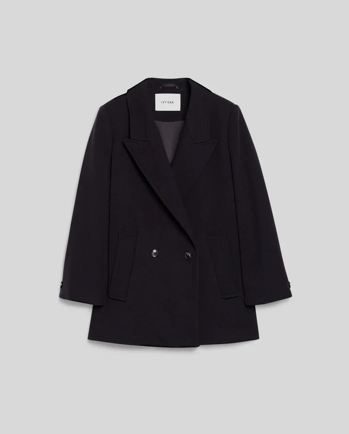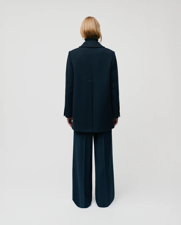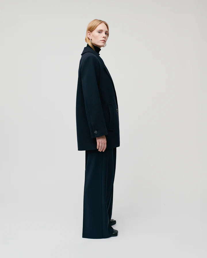 JENNA oversized boxy winter jacket crafted in a luxury Virgin Wool blend. Double breasted with wide shoulders, the jacket has a long slit with a hidden button in the back.