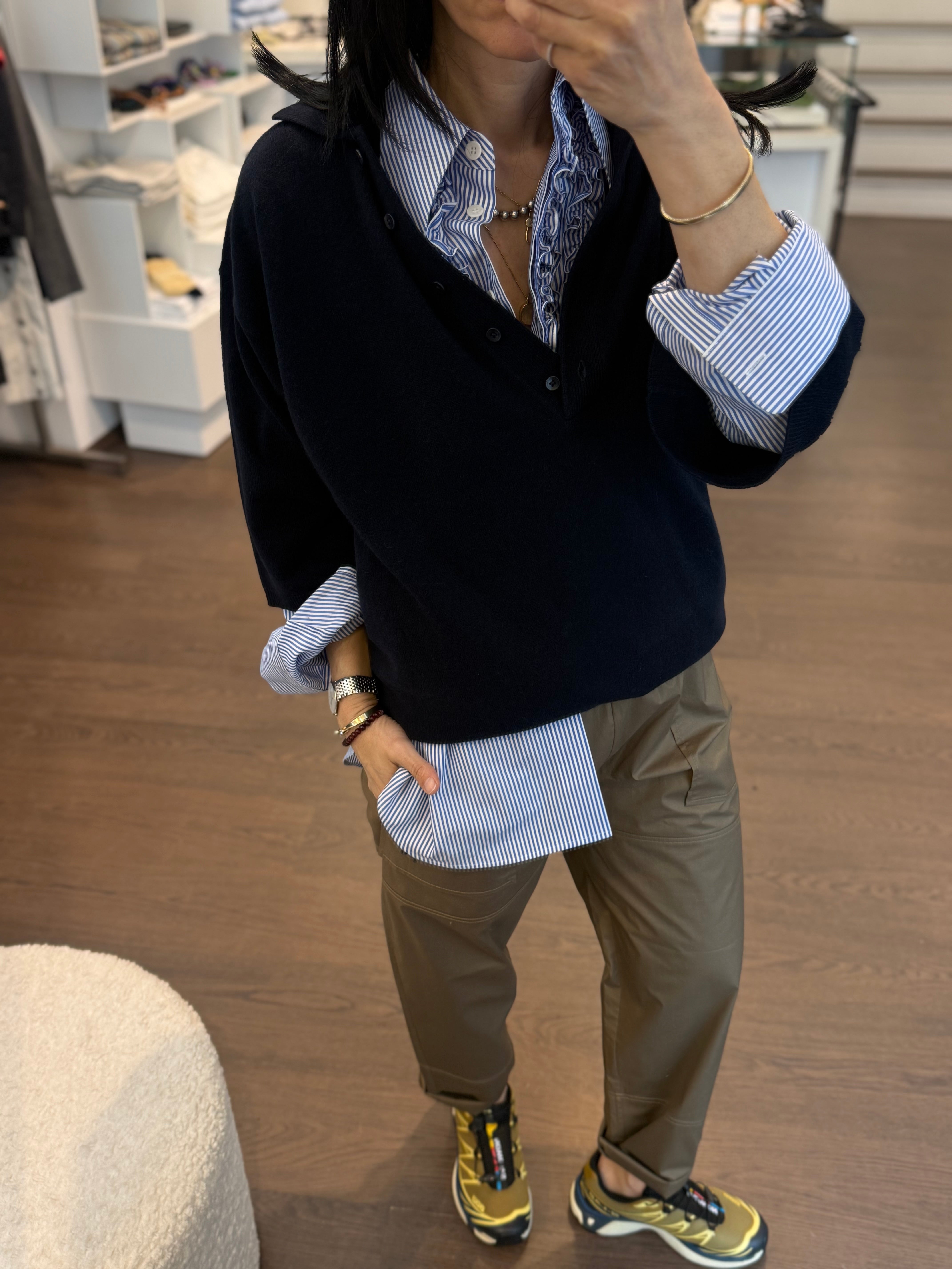 The garment is made from a fabric shaped by unique artisanal techniques.