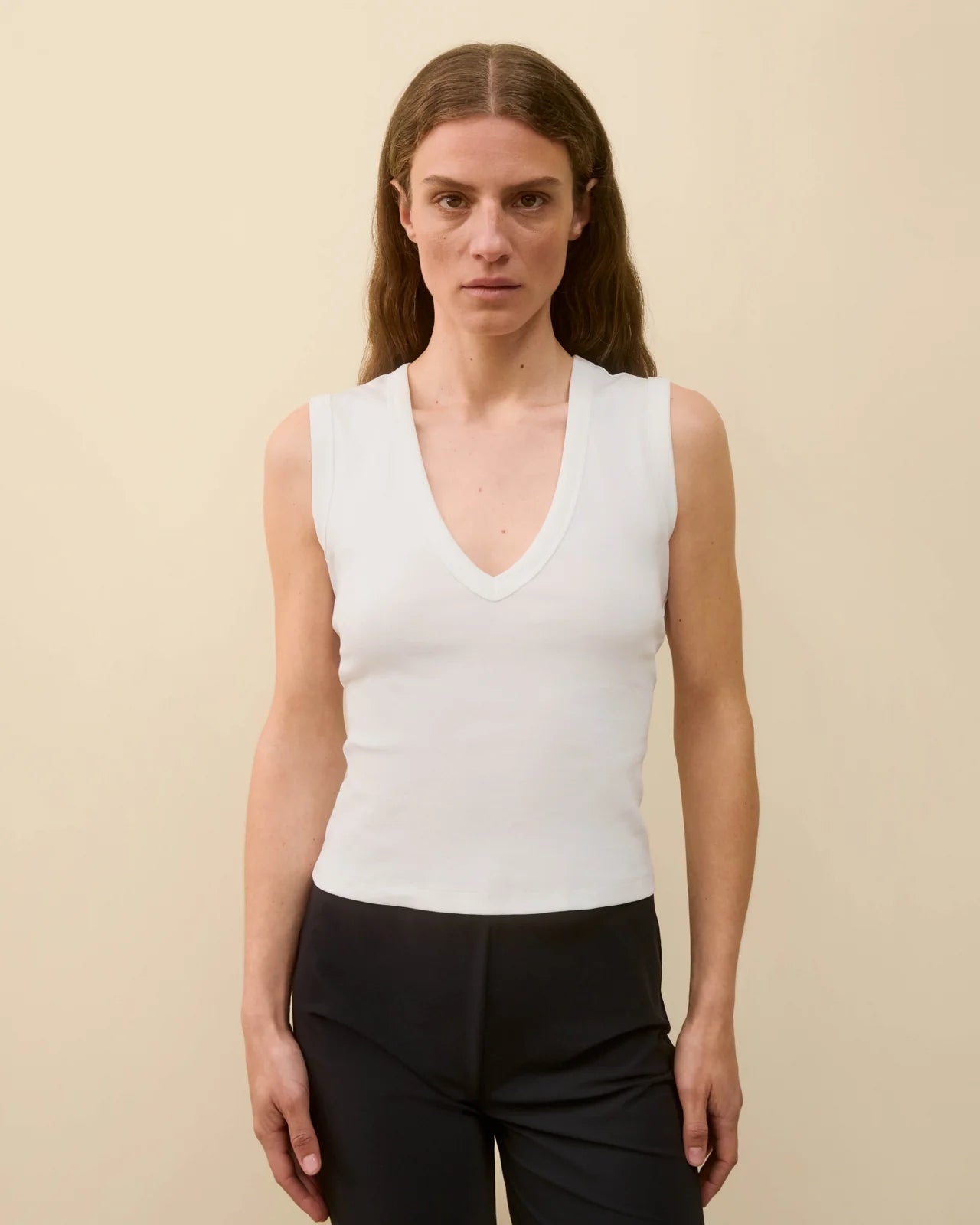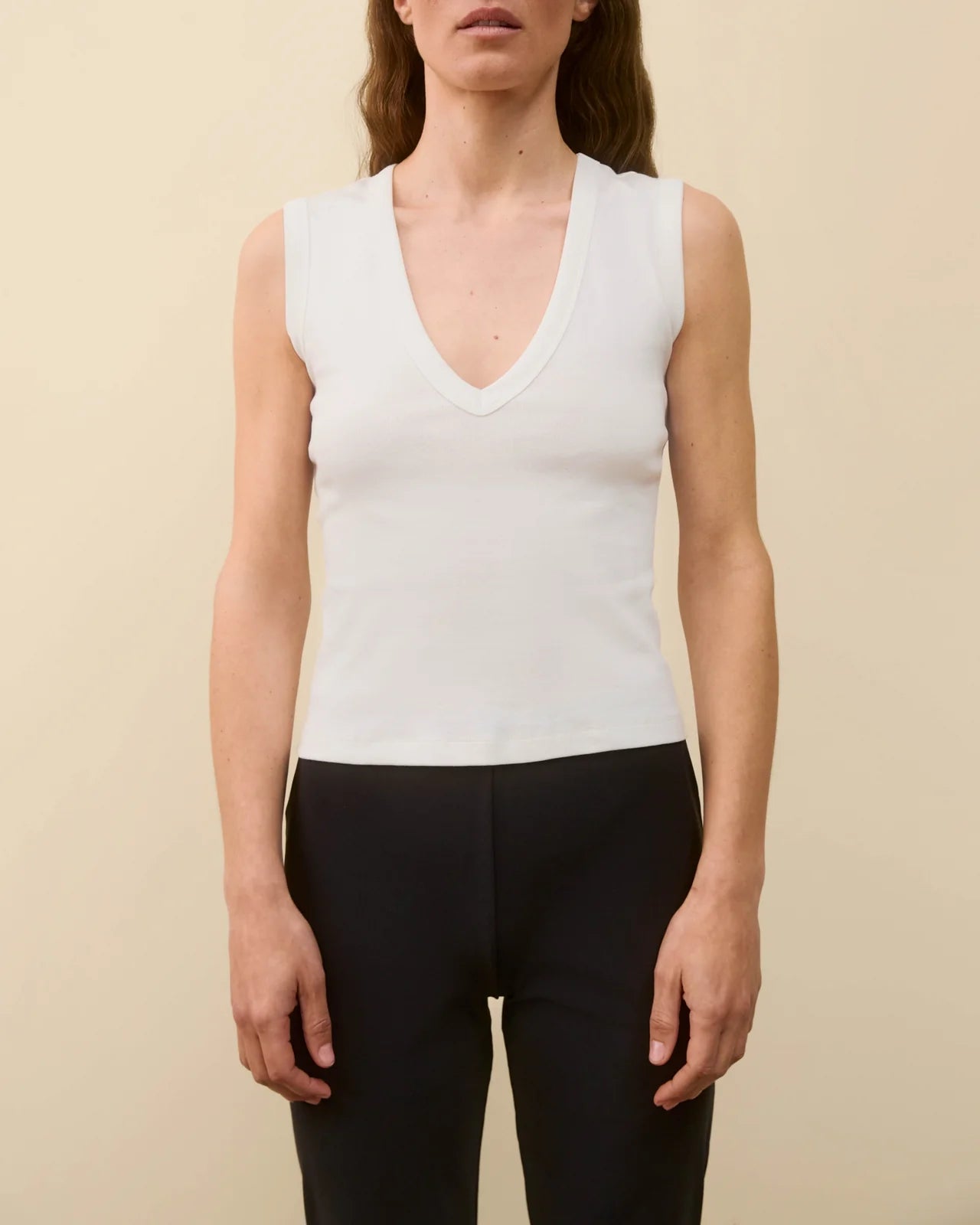 A deep v-neck tank with a scooped-out armhole designed for a modern look, made from medium-weight organic cotton. Designed to be worn with a bra, it pairs perfectly with a skirt or tailored trousers.