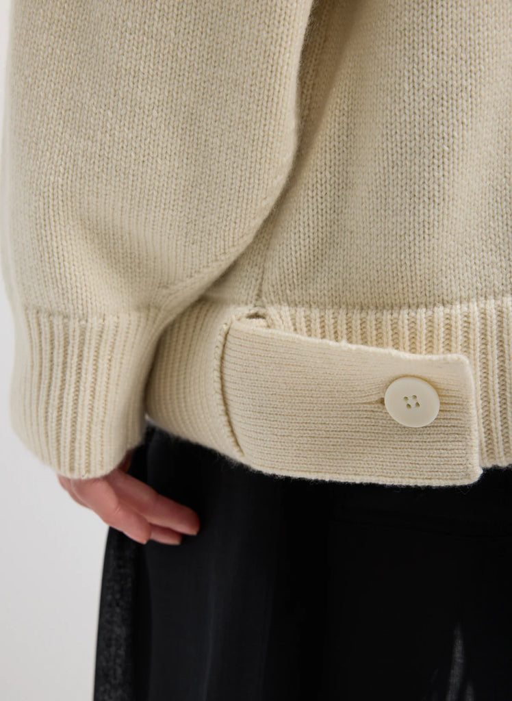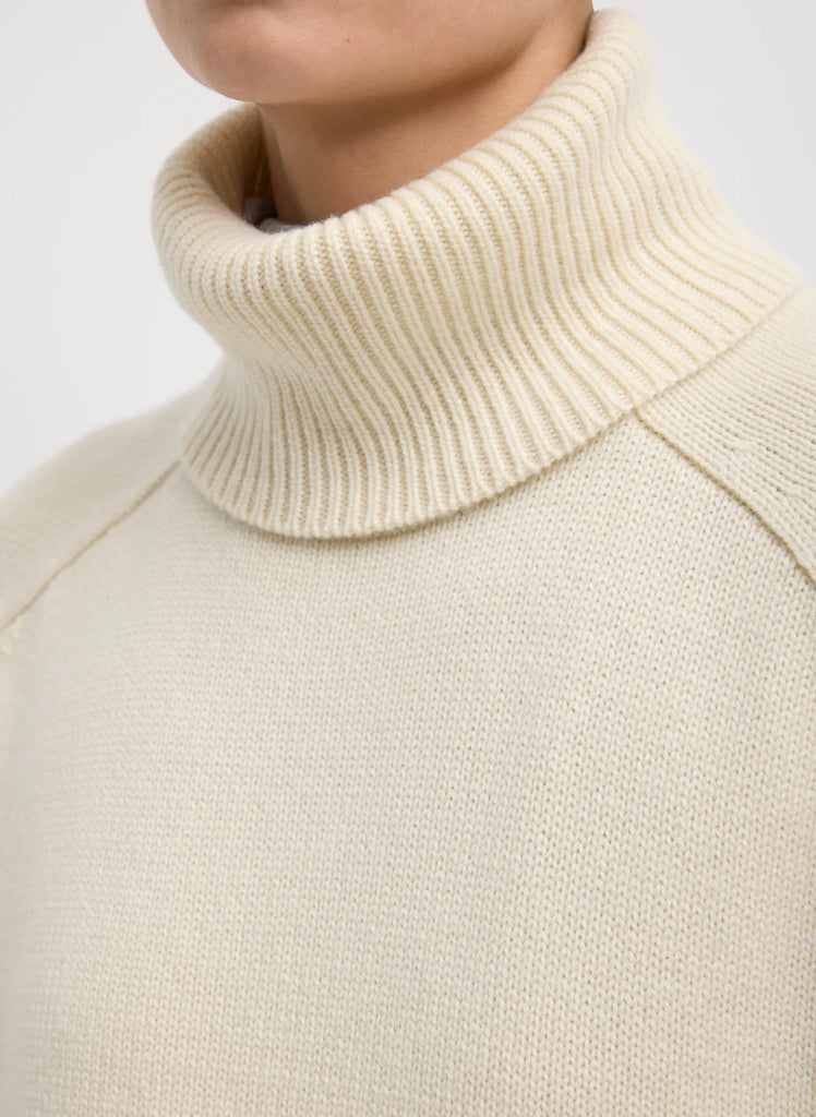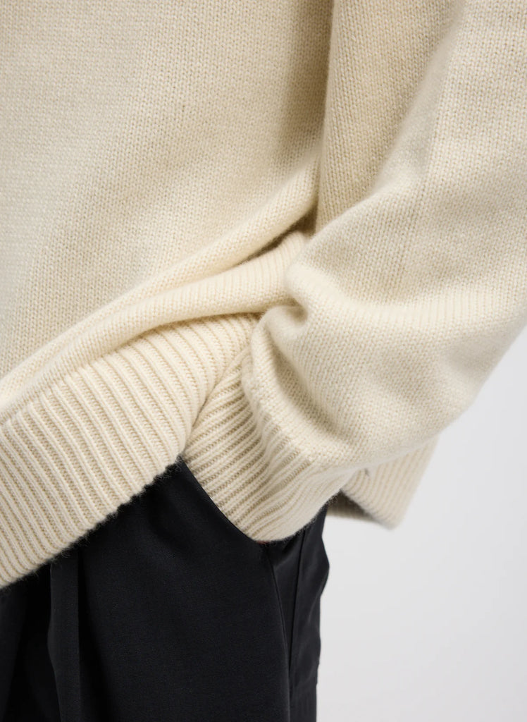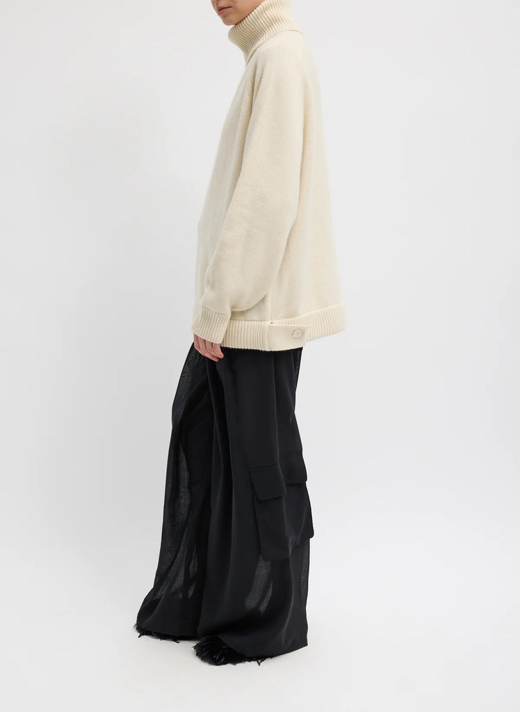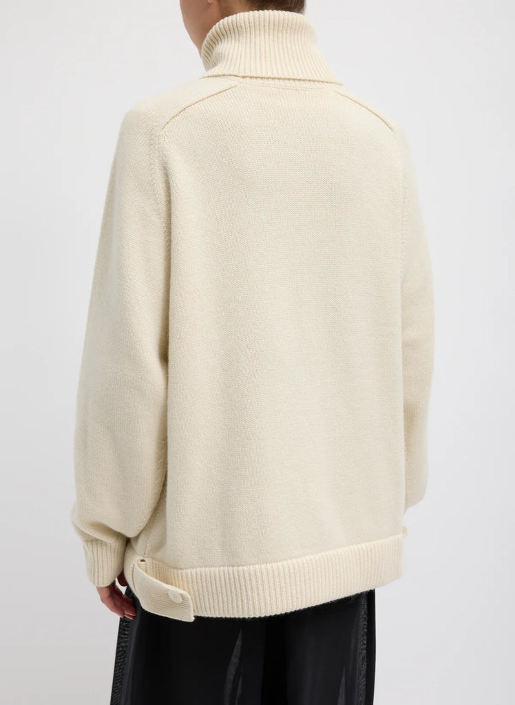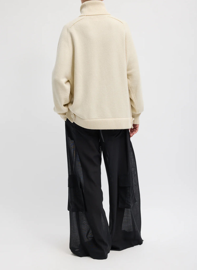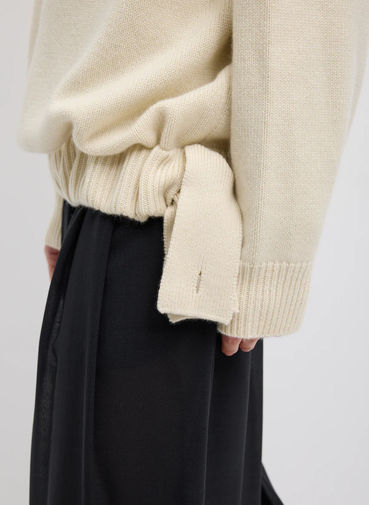 A forever knit designed with PDW in mind. Crafted from 100 percent cashmere spun from hypoallergenic yarns, this oversized turtleneck is featherweight yet warm, breathable yet cocooning. Tie details at the sides cinch for shape or release for ease, making it endlessly adaptable. A Ring 2 neutral, it pairs with the Sheer Wool Gauze Triple Pleat Pant for laid back polish or the Organza Skirt for unexpected texture play.