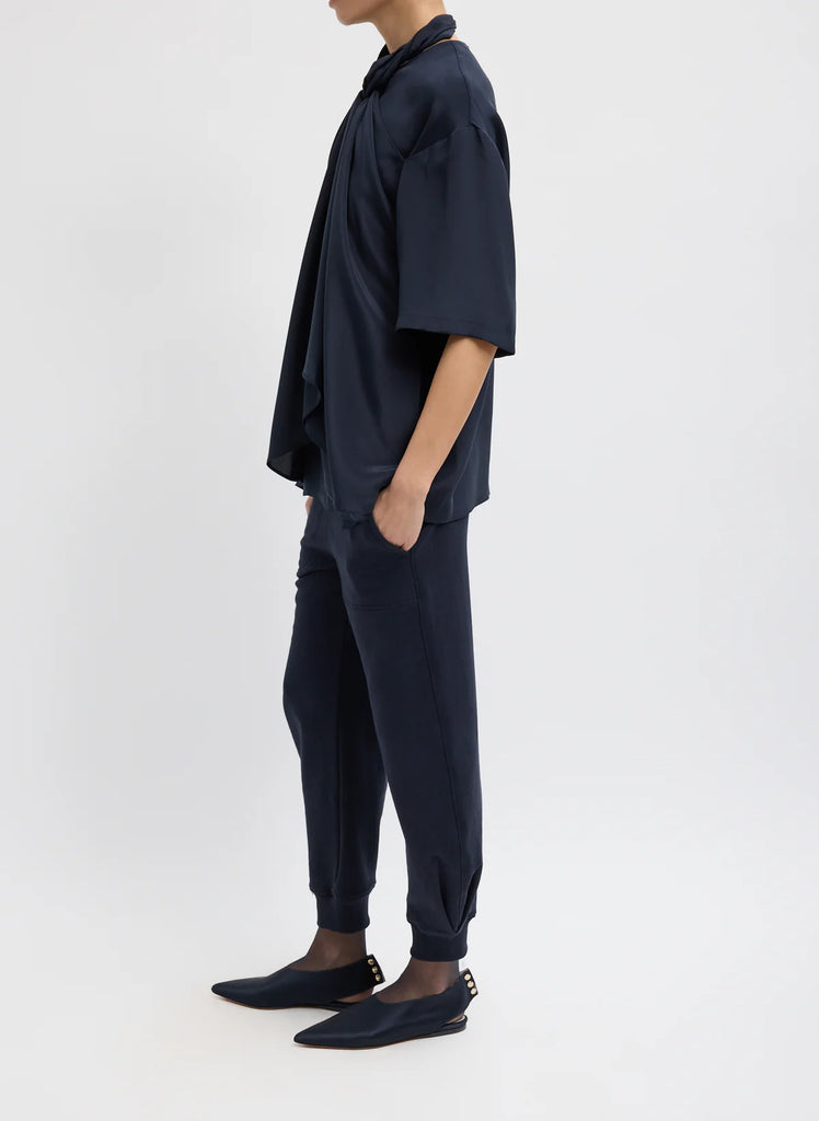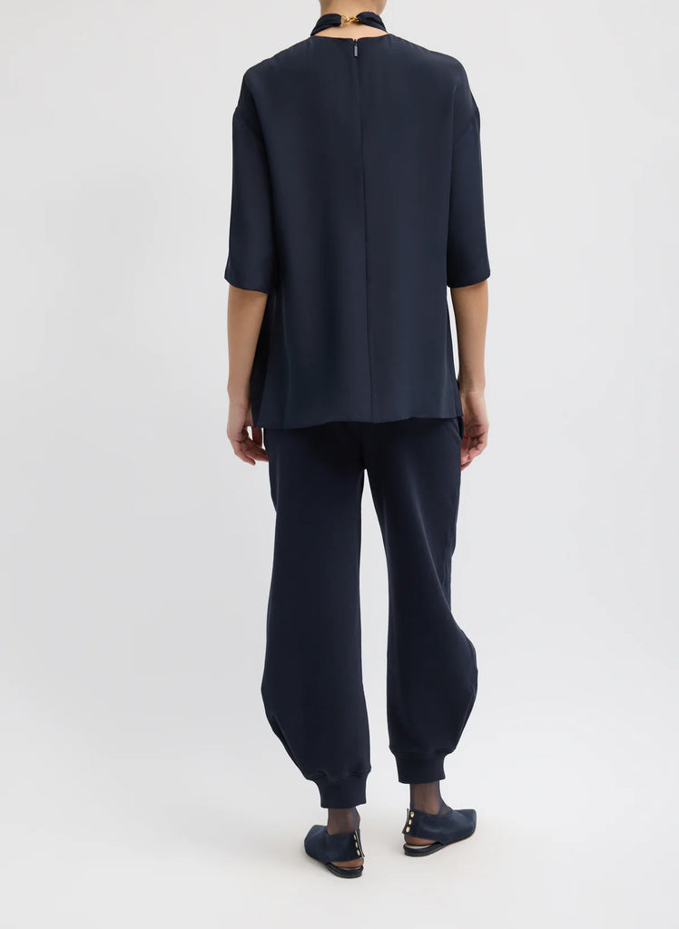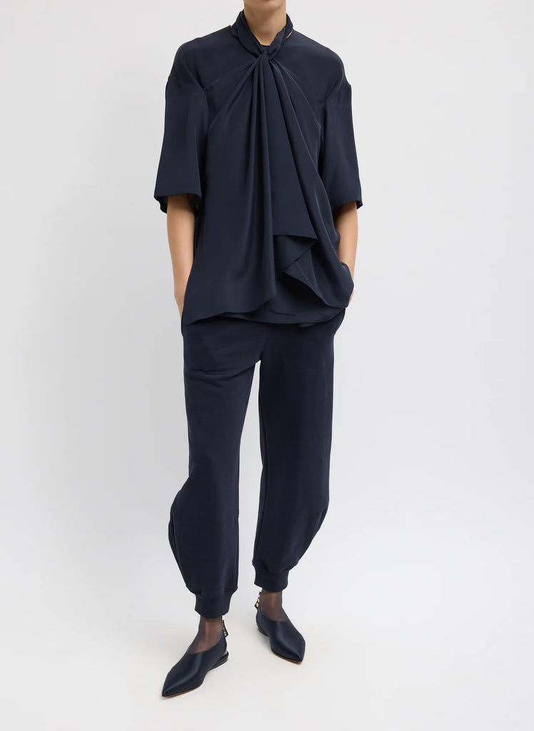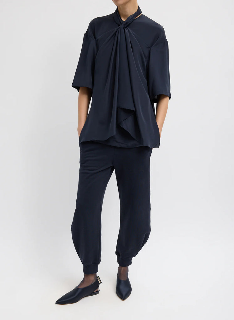 Crafted from sustainably produced 4 ply silk, the Tie Front Top features two draped ties that can be styled through the front loop and clasped behind the neck as a halter. A study in balance, it bridges highly pragmatic and highly creative. This is the piece that answers the what do I wear question for dressy nights and casual workdays alike. Pair it with the Calder Sweatpant for laid back ease or the Sheer Wool Gauze Triple Pleat Pant for an elevated take. A Ring 2 favorite you will reach for again and again.