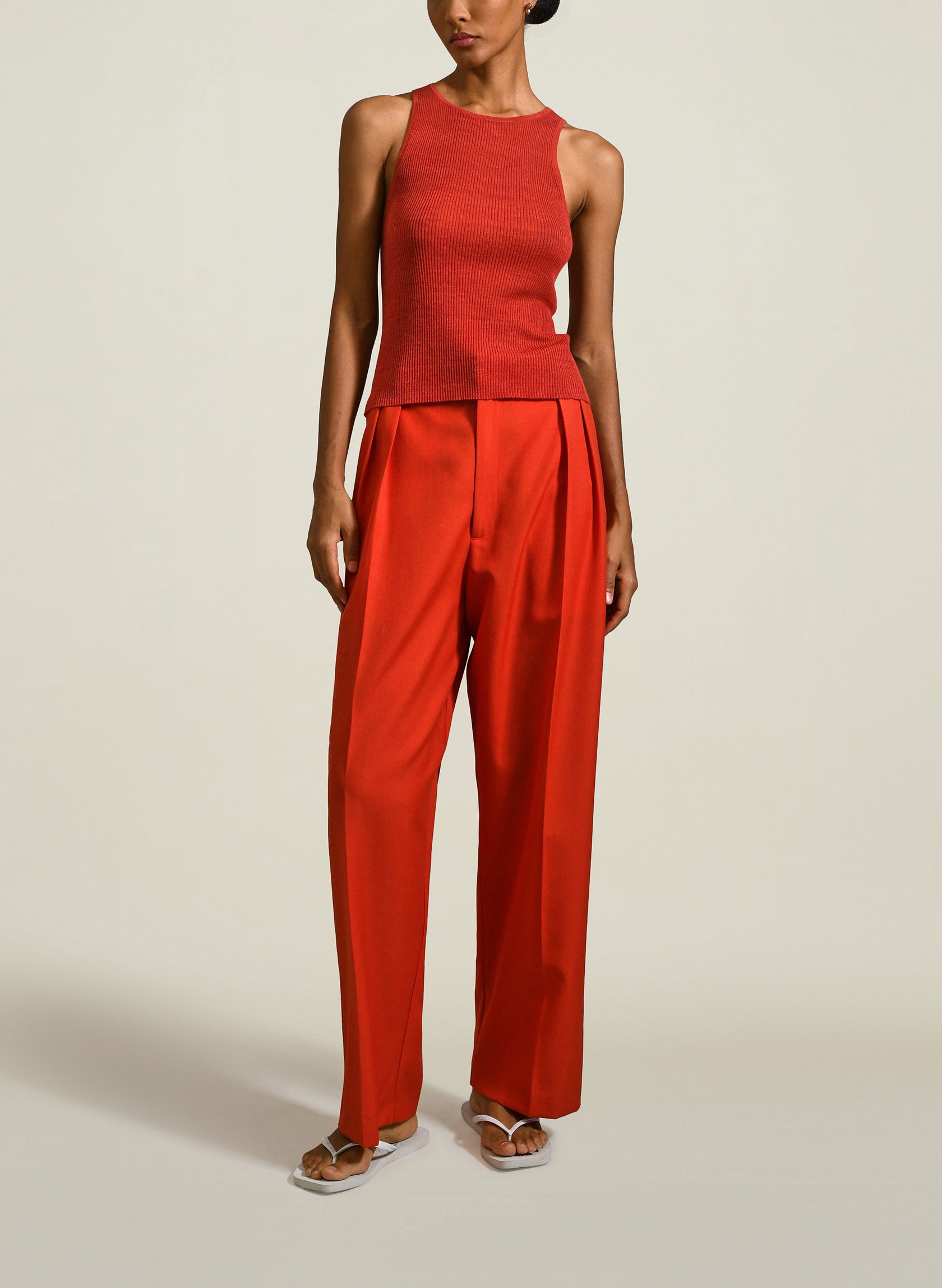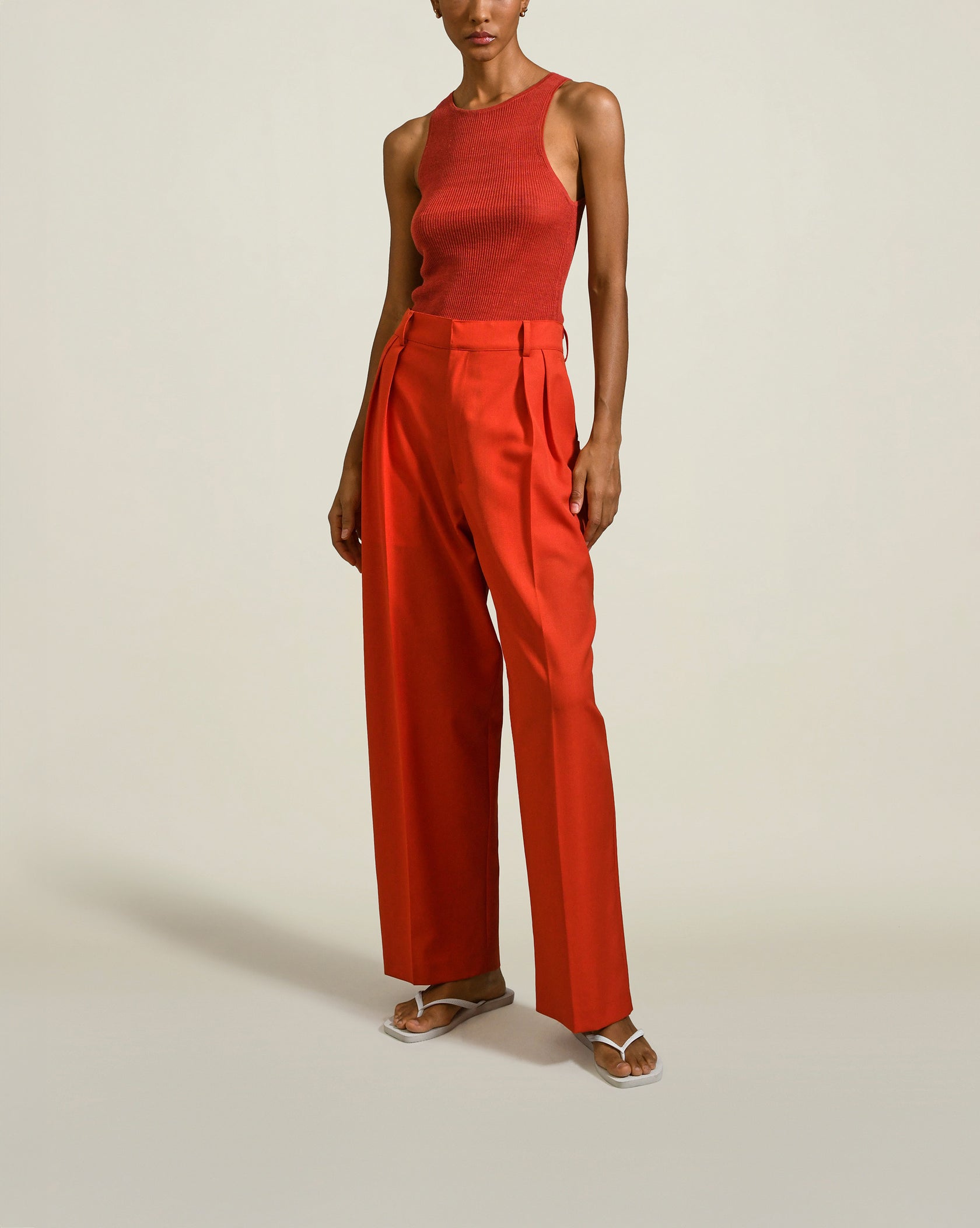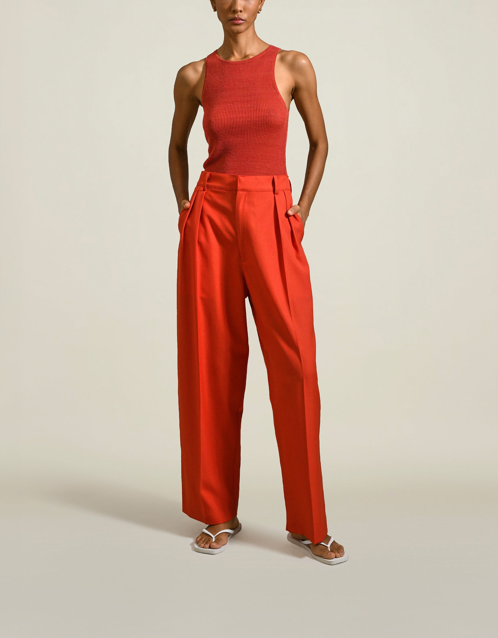 Vintage inspired relaxed-fit pleated trouser. Beautiful chemical-free Tropical Wool. Mid rise. Elongating double pleated crease front leg. Impeccably tailored. Side seam pockets. Two button-close back welt pockets. Wide looped waistband. Bright and cool tomato tropical wool suiting.