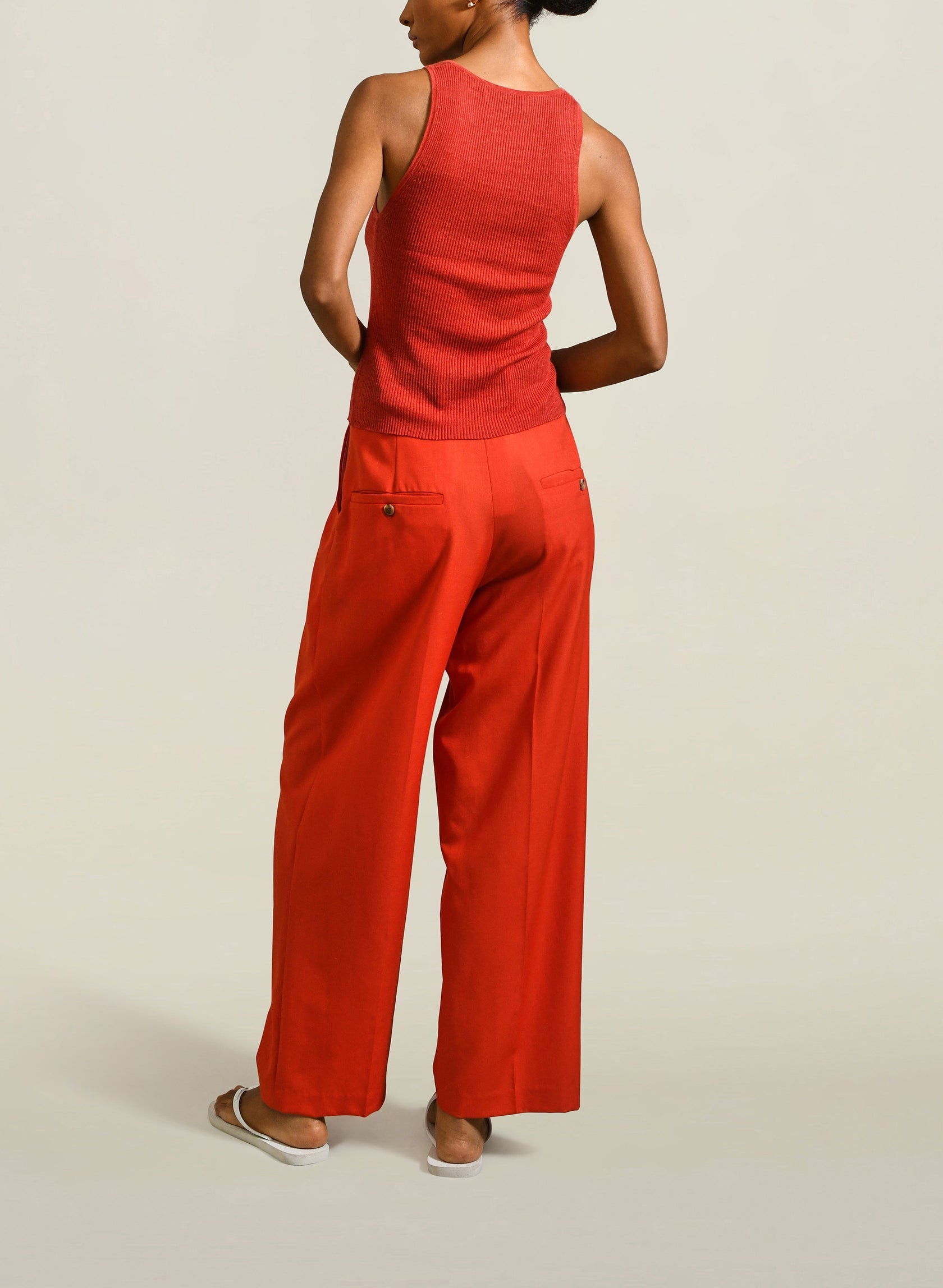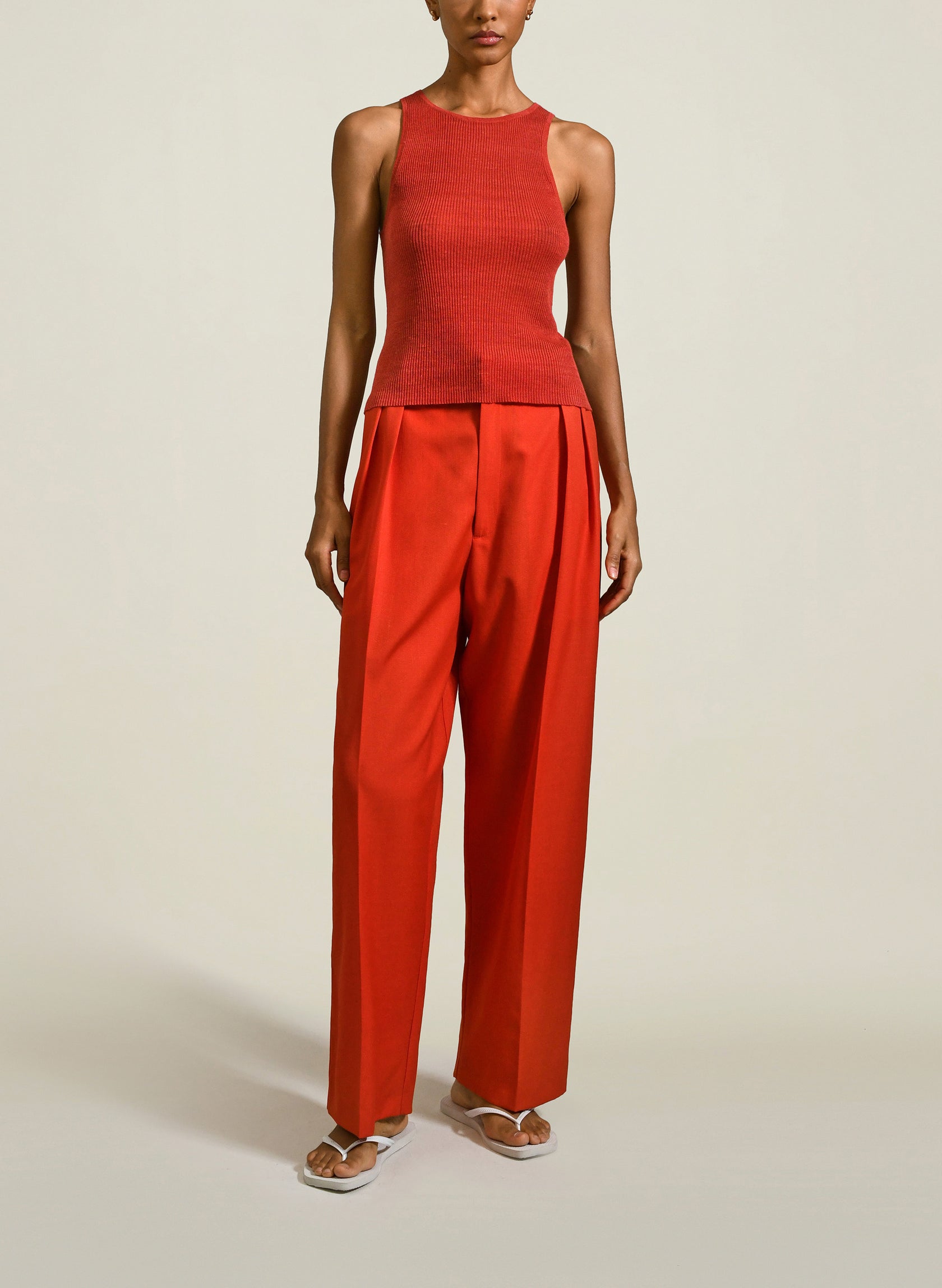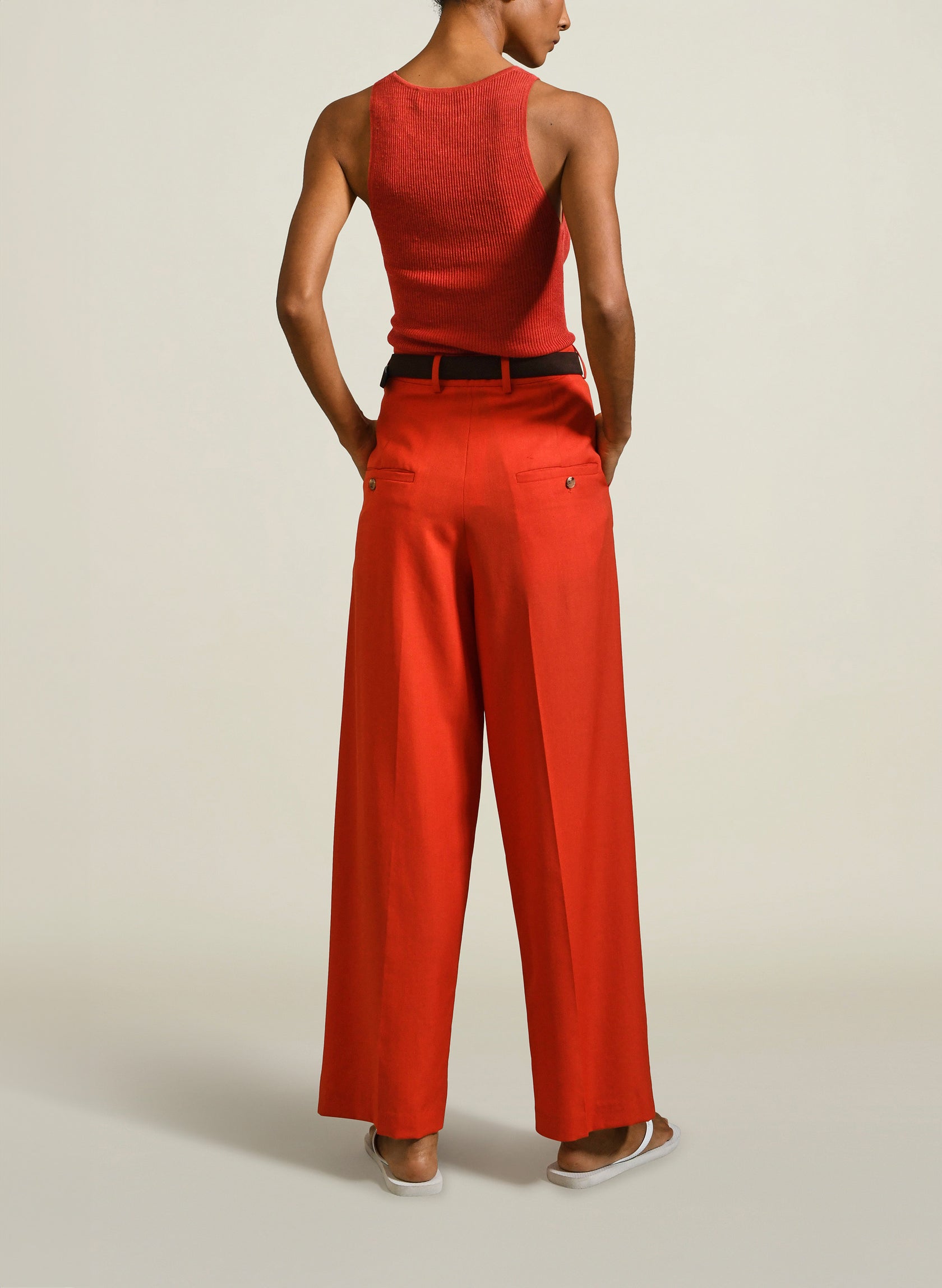 Vintage inspired relaxed-fit pleated trouser. Beautiful chemical-free Tropical Wool. Mid rise. Elongating double pleated crease front leg. Impeccably tailored. Side seam pockets. Two button-close back welt pockets. Wide looped waistband. Bright and cool tomato tropical wool suiting.