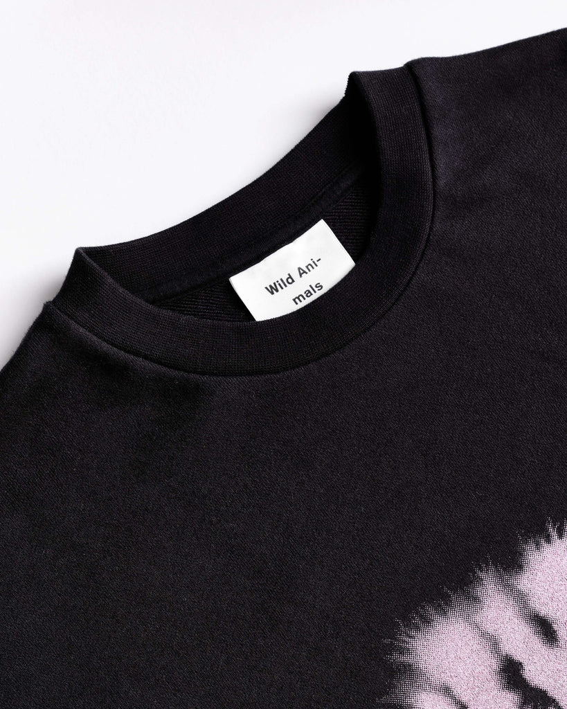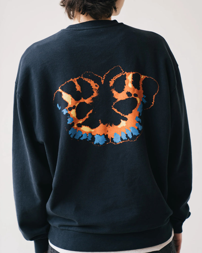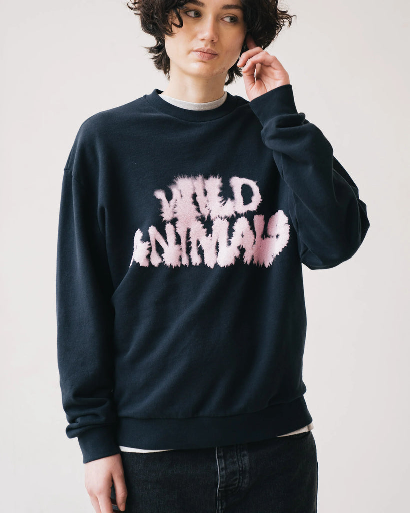 A unisex black sweater featuring a silkscreen print of the Wild Animals logo on the front, and a butterfly on the back. The fabric used to make this sweater is certified by GOTS.