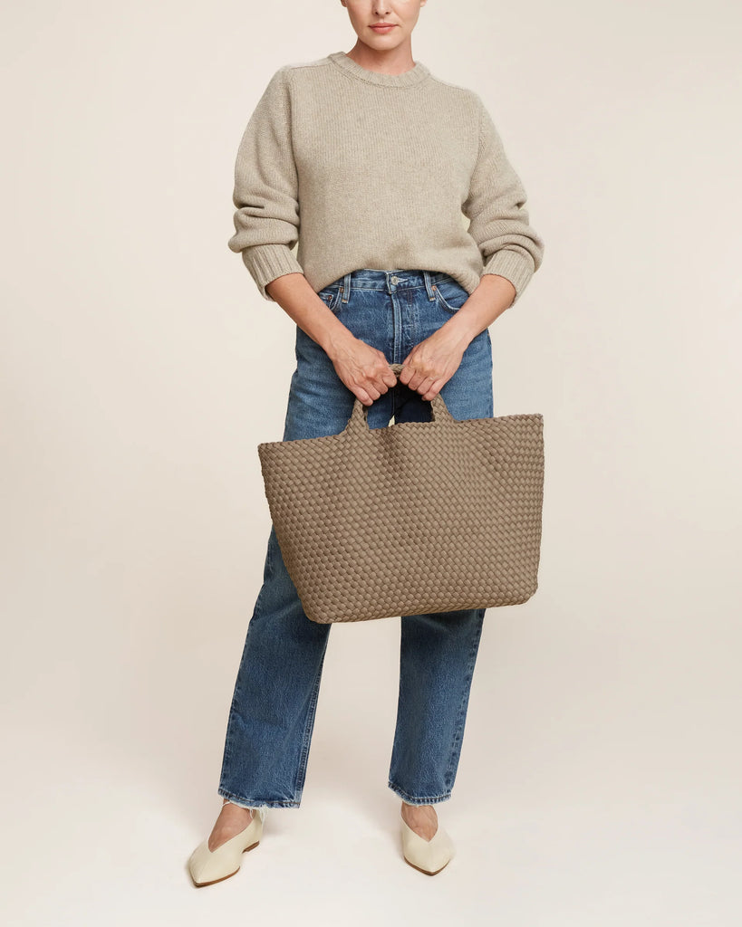 Handwoven neoprene in taupe. The St. Barths Large Tote is a lightweight and versatile classic, ideal for travel.