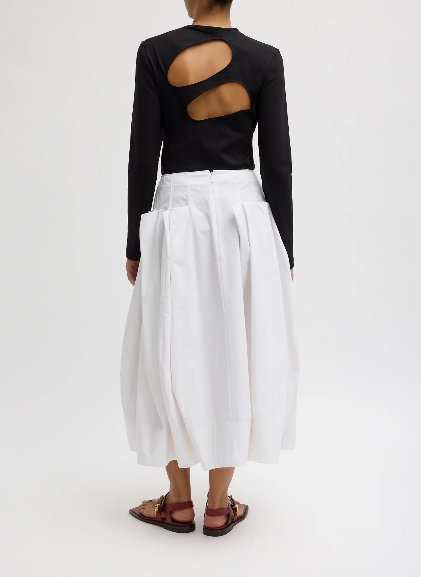 Crafted from our signature Compact Eco Poplin, this full skirt is designed to maintain its voluminous shape without losing control. The compact weave allows the skirt to stand away from the body, while pinched pleating provides shape without excess bulk. Functional pockets reinforce everyday utility. Designed to function independently or as part of a set, supporting modular dressing and long term wardrobe building. Wear it with the coordinating Cropped Square Top for a considered head-to-toe look, or style it back to a ribbed tank and sandal for everyday spring occasions.