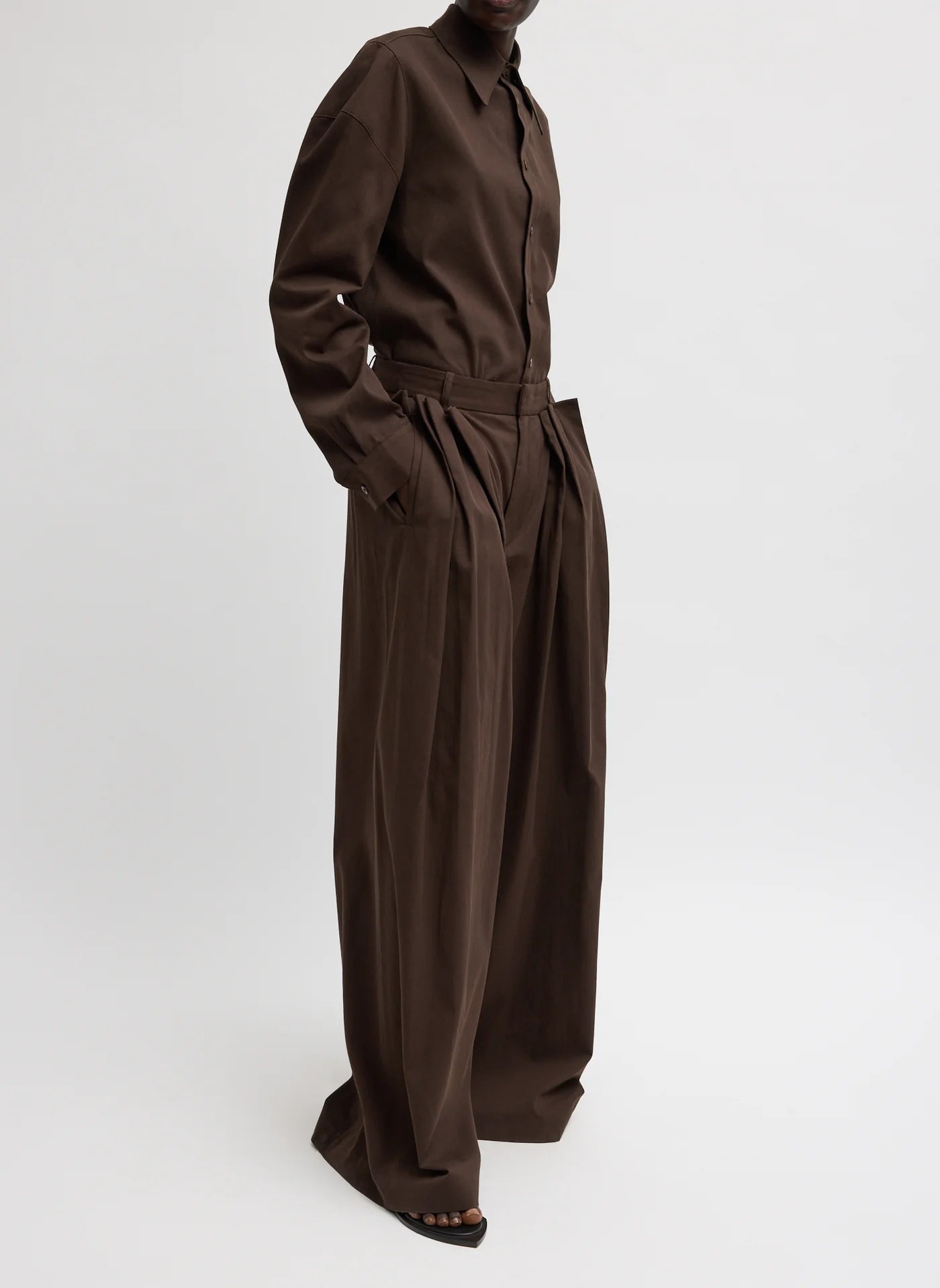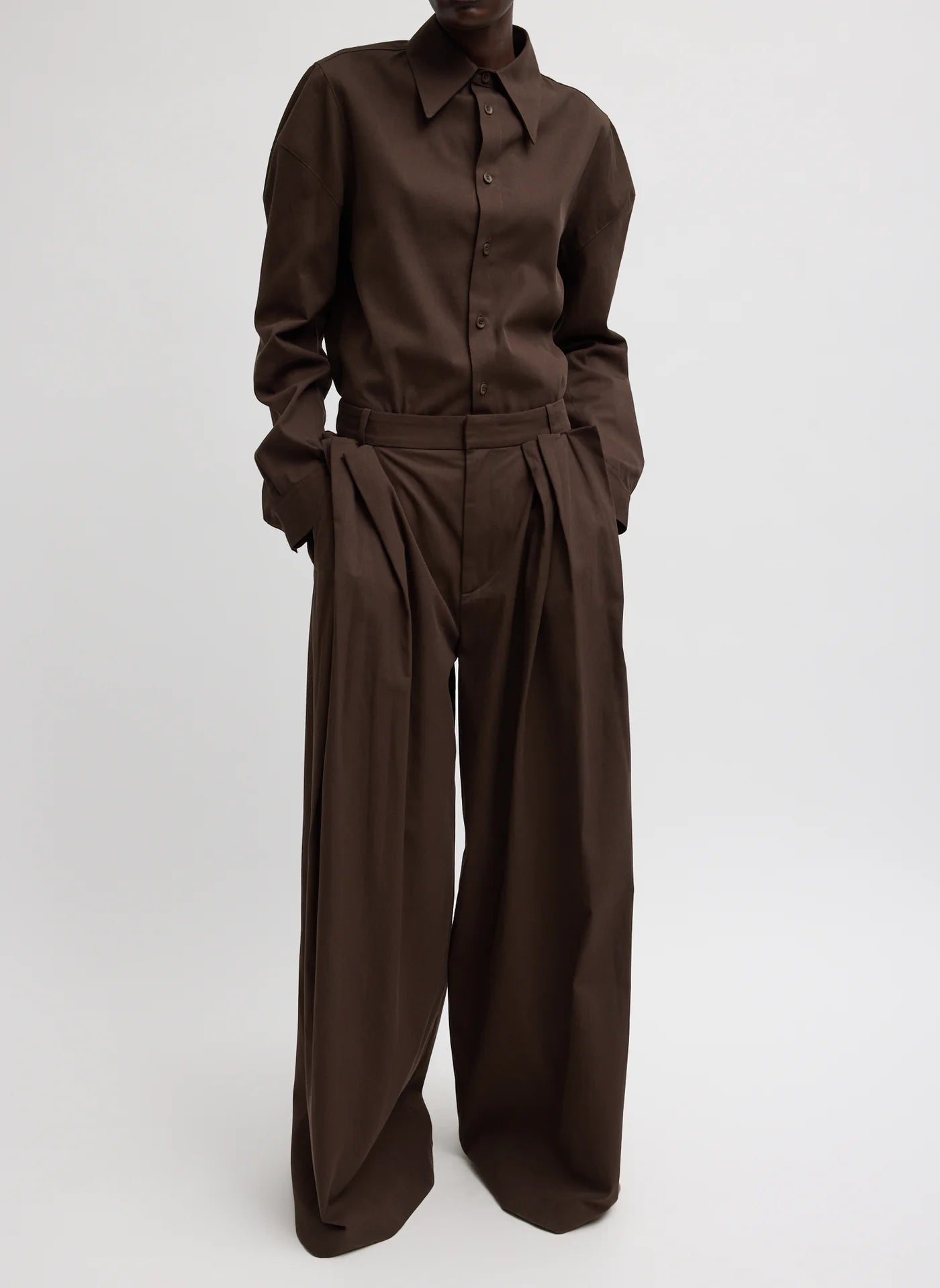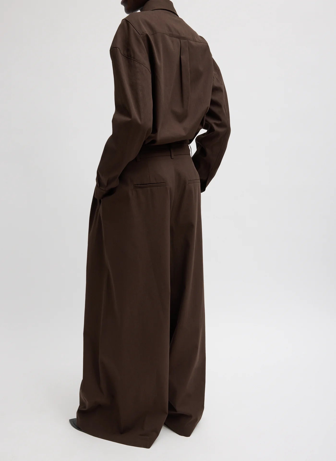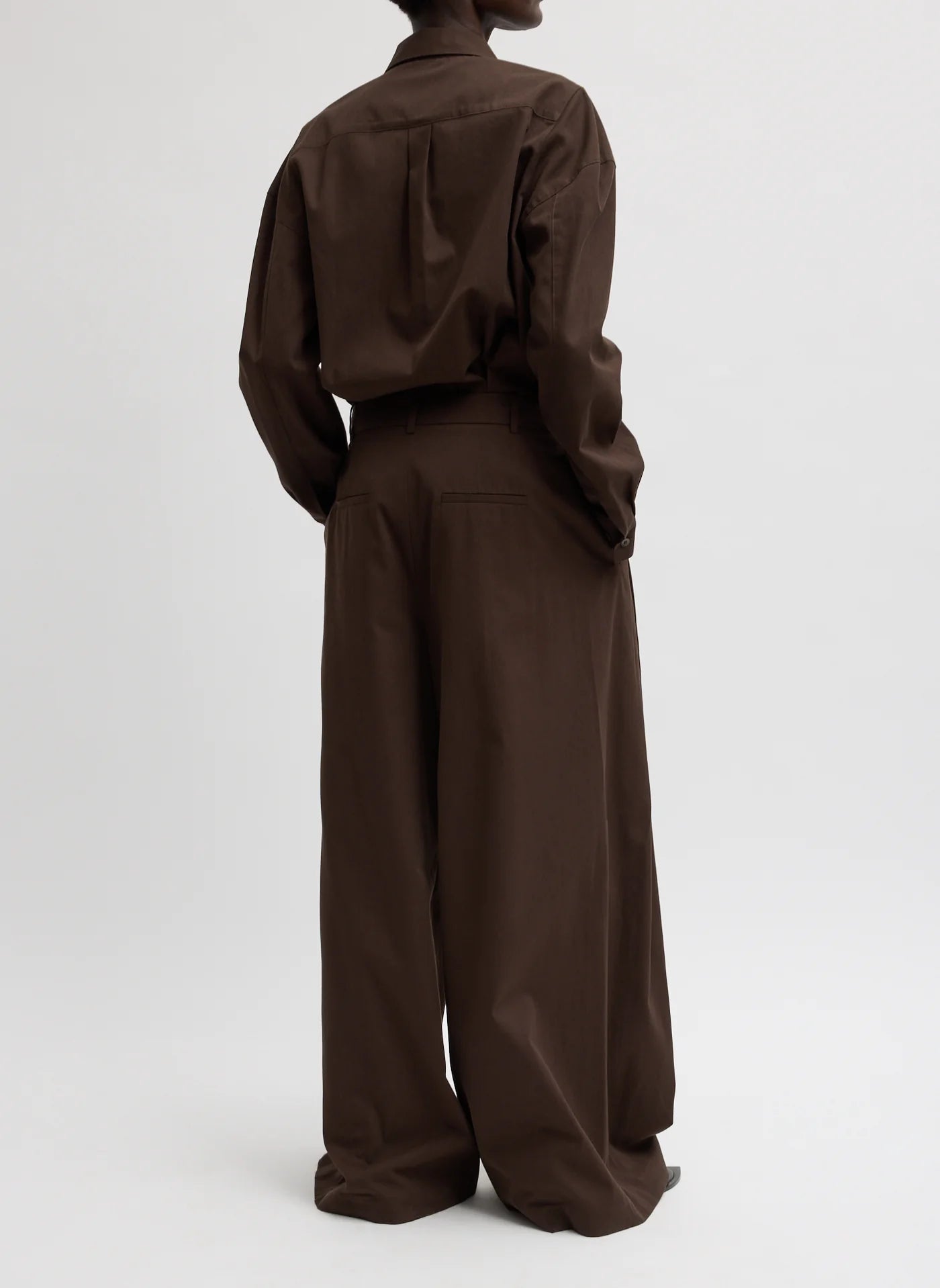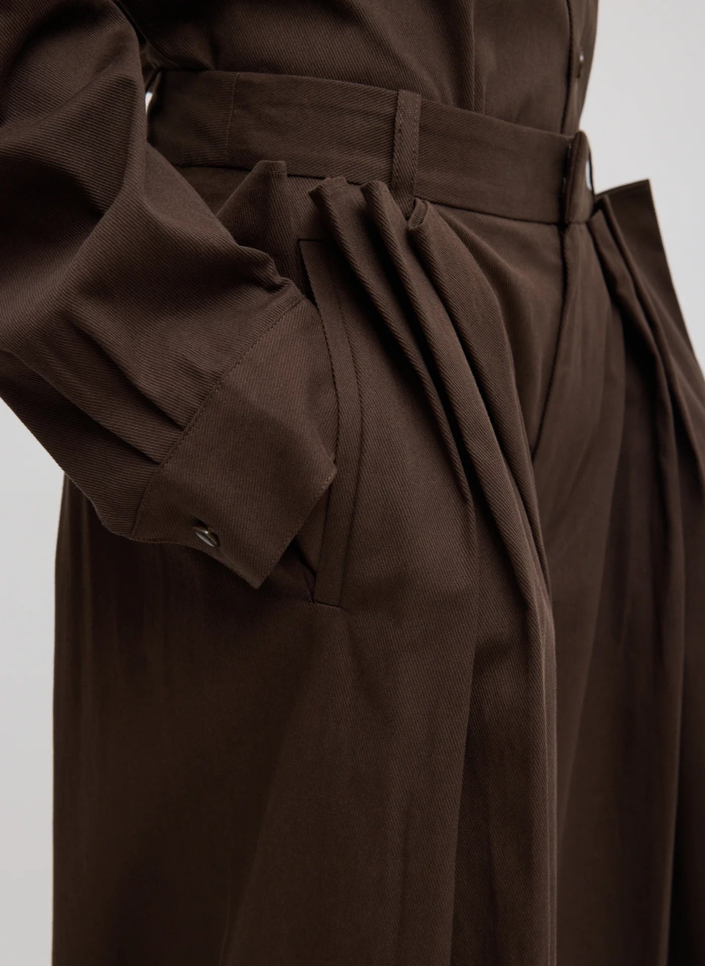 A reimagined take on classic trouser pants. The Luxe Spring Twill Tucked Pleated Wide Leg Trouser is designed with a modern, wide-leg silhouette and considered detailing throughout. Available in Hickory Brown and Taupe, it offers a grounded neutral palette that works seamlessly across seasons. Thoughtful features include pleated detailing at the hips for shape, belt loops for styling flexibility, and functional pockets—finished with oversized patch pockets for added utility. Snaps at the hem allow the wearer to adjust the length on the go, making this trouser as adaptable as it is elevated. Style it back to the coordinating Hinged Sleeve Shirt or Bomber Jacket for a head-to-toe look, or pair it with everyday essentials to balance structure with ease.