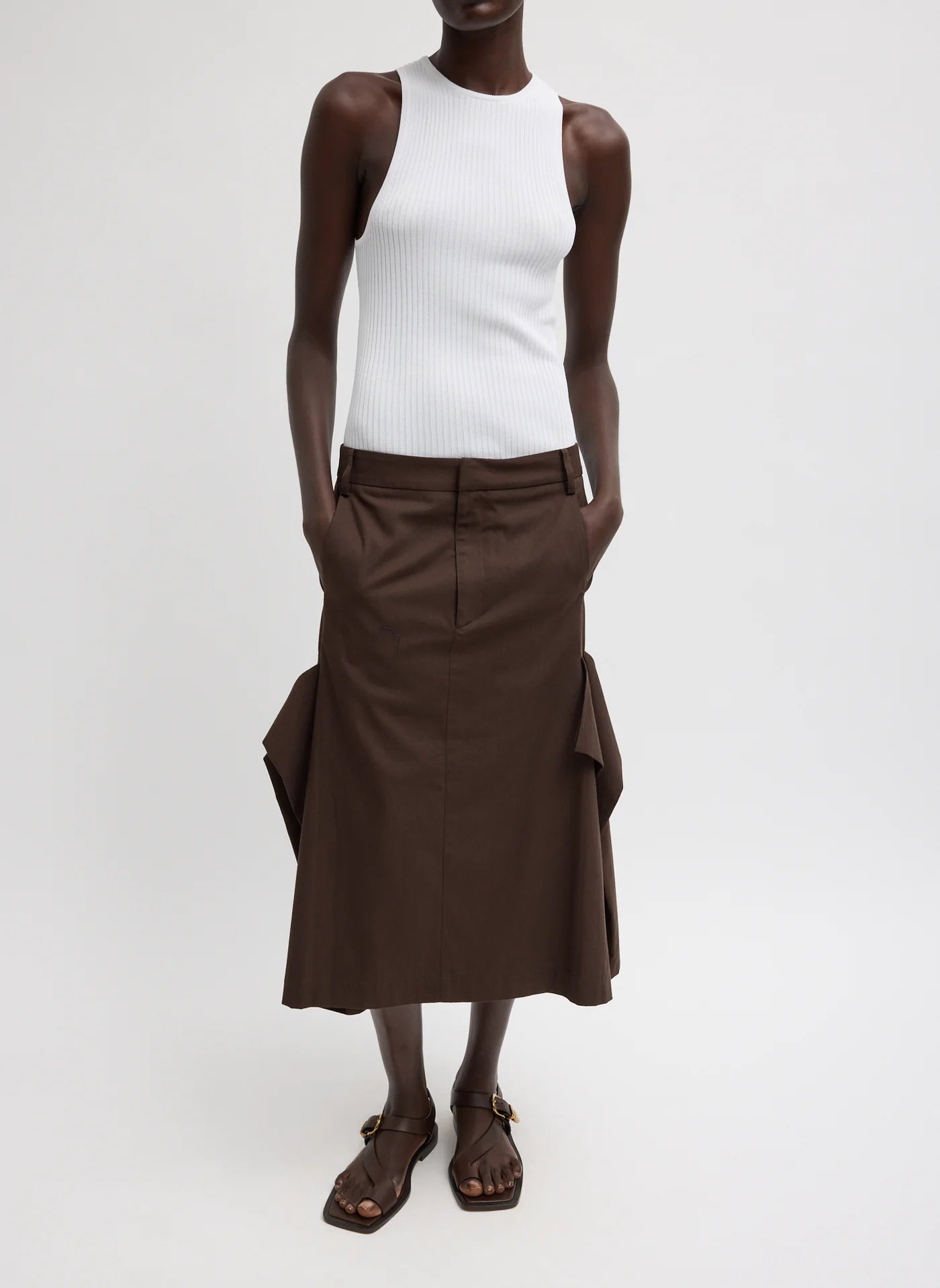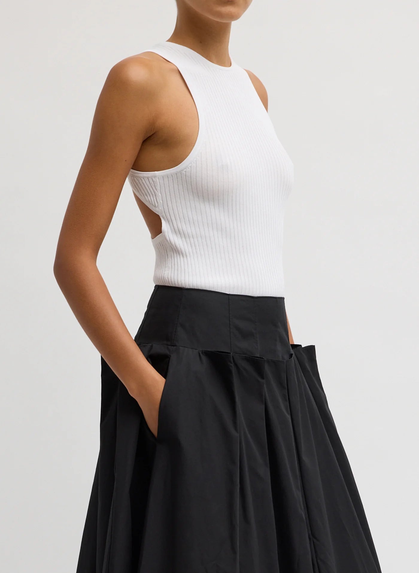 The Ribbed Sweater Cut Out Tank brings subtle edge to a foundational knit. Crafted from the same strong, stretchy ribbed sweater fabric, it features racerback cutouts at the back for an unexpected detail that feels considered, not overdone. Available in Hickory Brown, Navy, and White, it works effortlessly on its own or layered under the coordinating Slim Cardigan for a streamlined matching set.