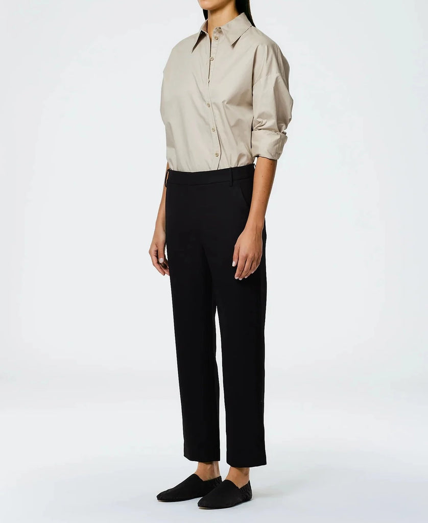 Crafted from 100% virgin wool with a luxurious superfine basket weave texture, this evergreen trouser lends itself to countless occasions for wear…again and again. Nodding to slim 90’s tailoring–in the best way–this flat front pant creates long and lean lines that will ground even the most novelty of tops.