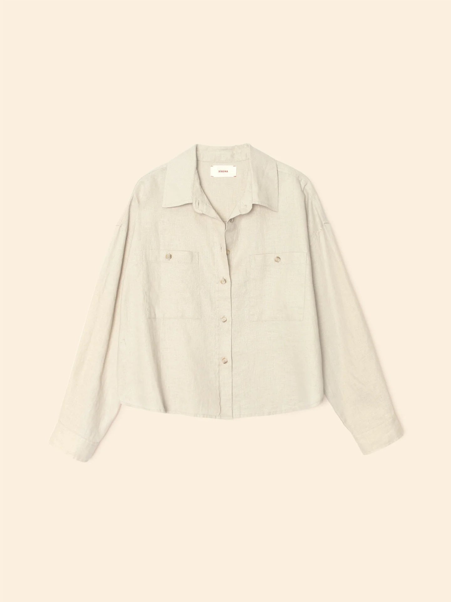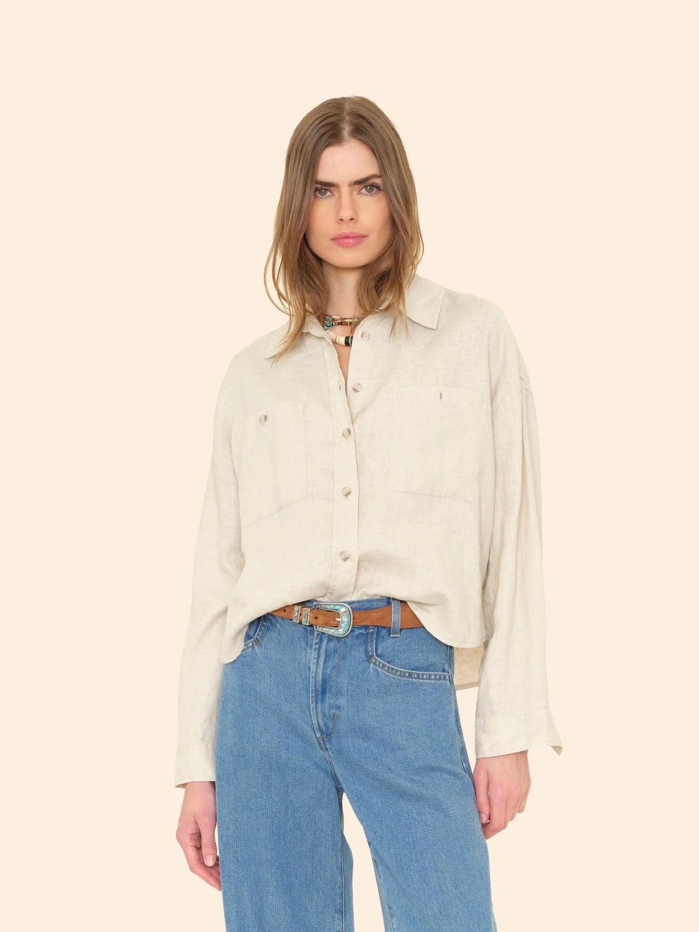 Vacation Mode. Brittan is new this season in our lightweight linen. This button-front shirt is slightly cropped and features two