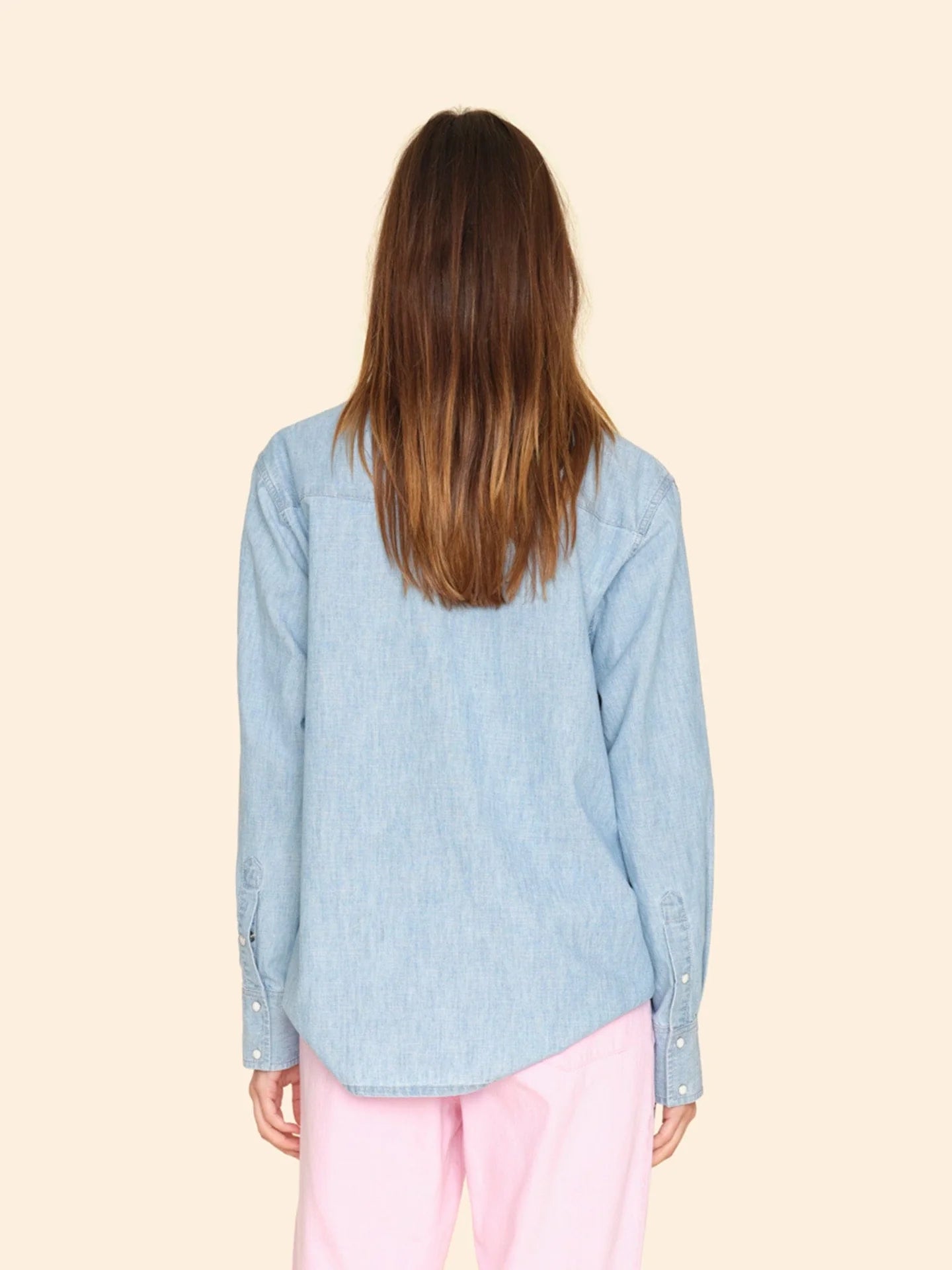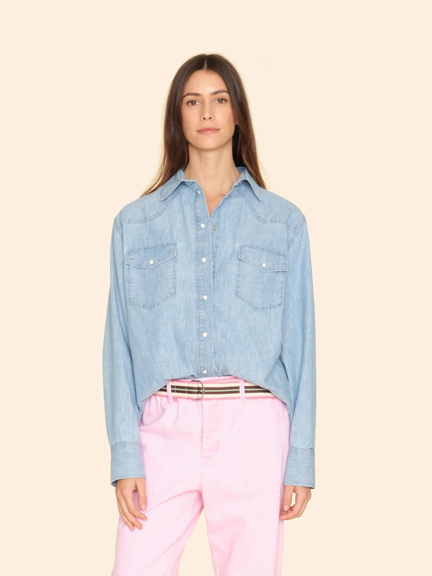 Be Cool. Griffen is new this season in our lightweight, soft-woven cotton chambray in a classic light blue wash. Griffen is a button-front shirt with a Western-inspired yoke, pearlized snap buttons, and two front chest pockets with a snap button closure.