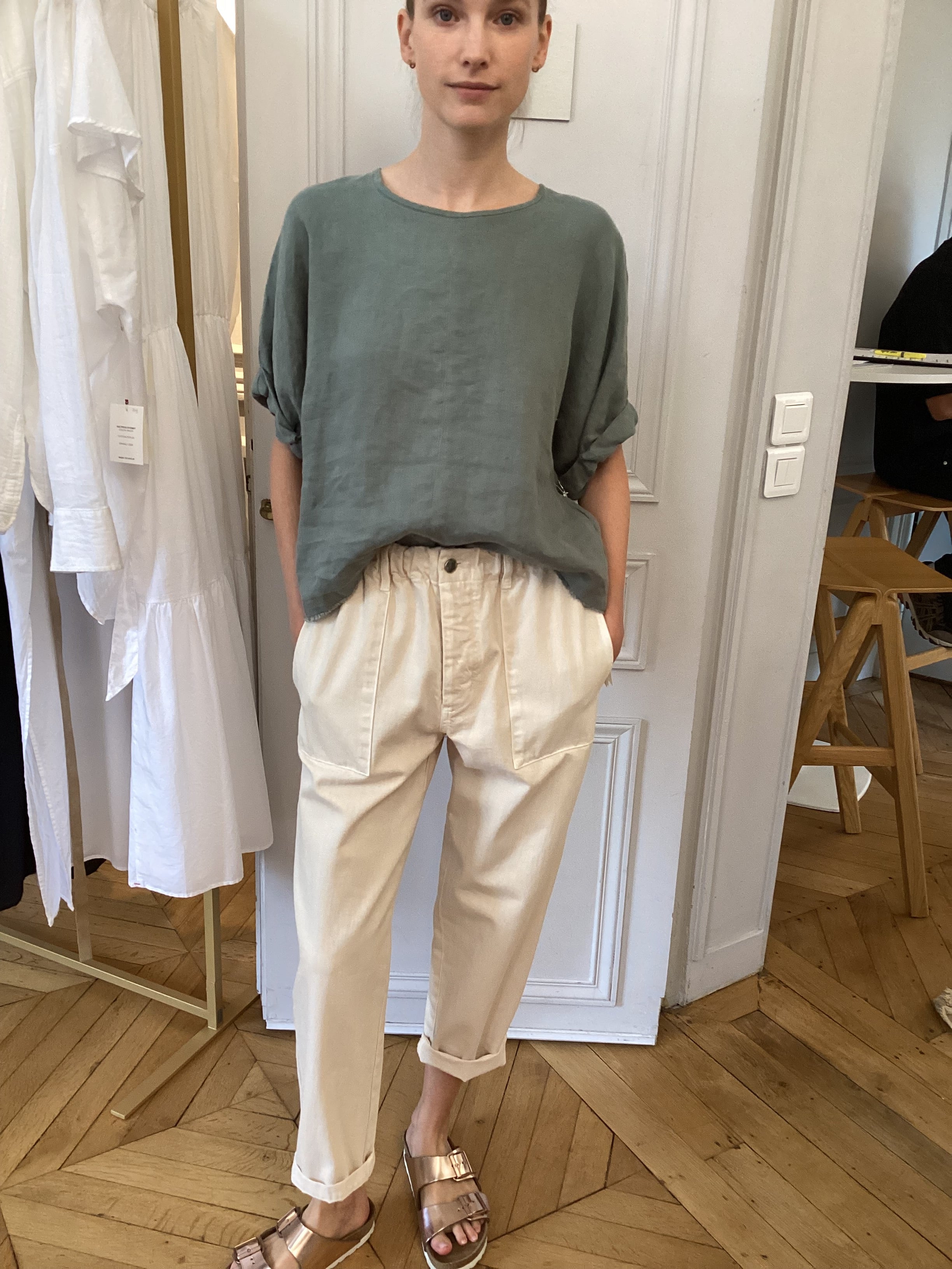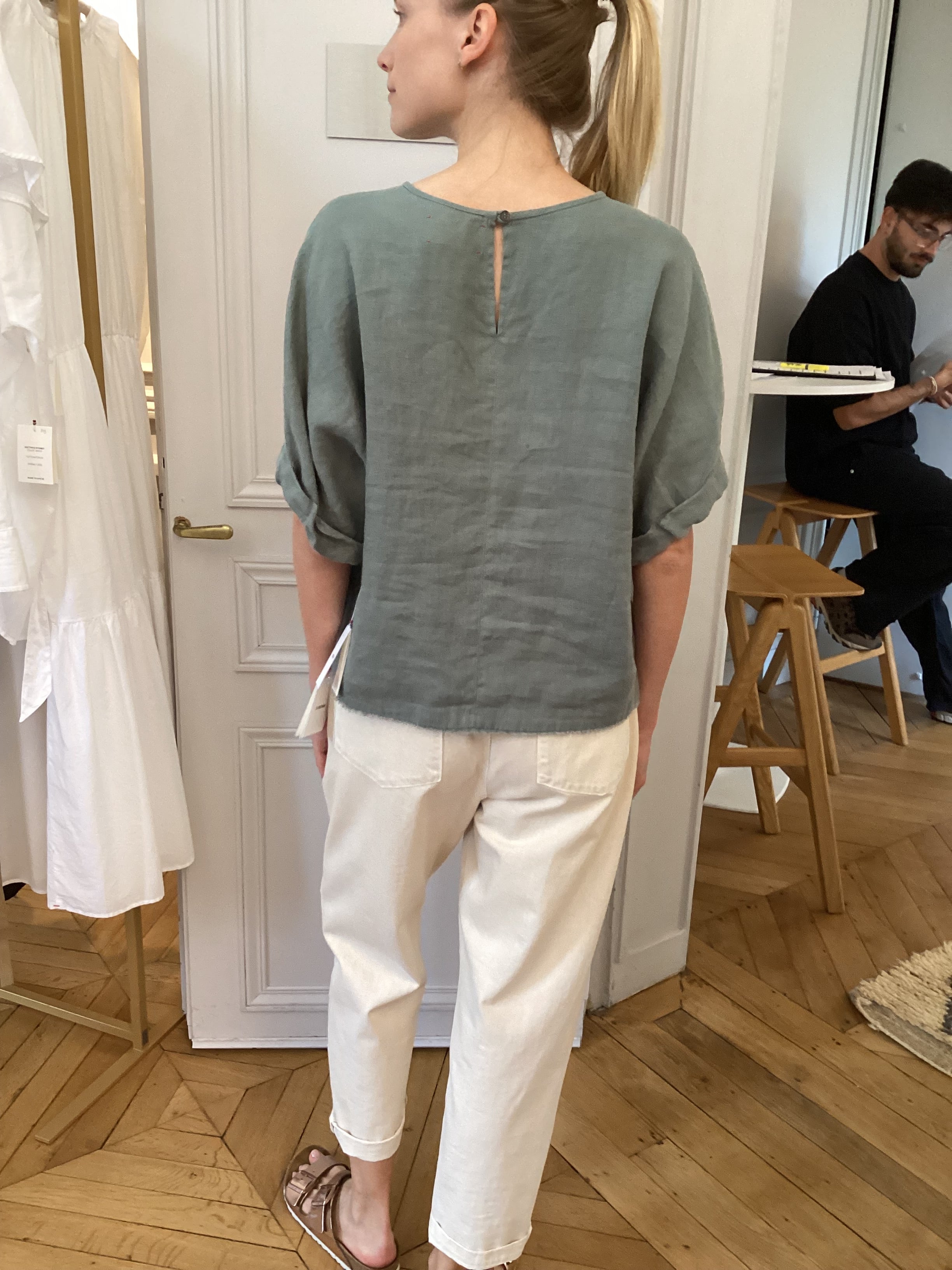 Vacation Mode. Savoye is new this season in our lightweight linen. This easy pullover top features stitched rolled sleeves, raw edge hem, and a keyhole button-back.