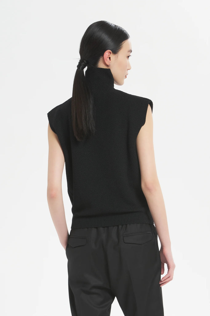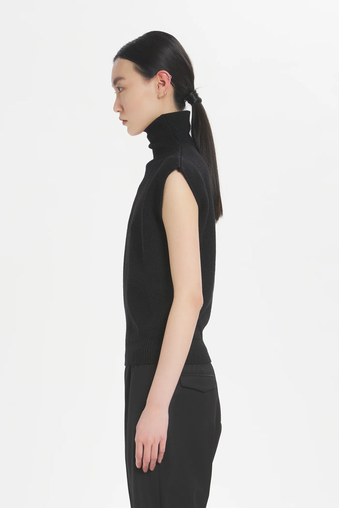 Blending comfort with an elevated, modern look, this sleeveless high-collar knitwear is crafted from seed stitch knit, featuring a unique textured pattern that adds depth and sophistication. Composition: 100% Extrafine Merino Wool