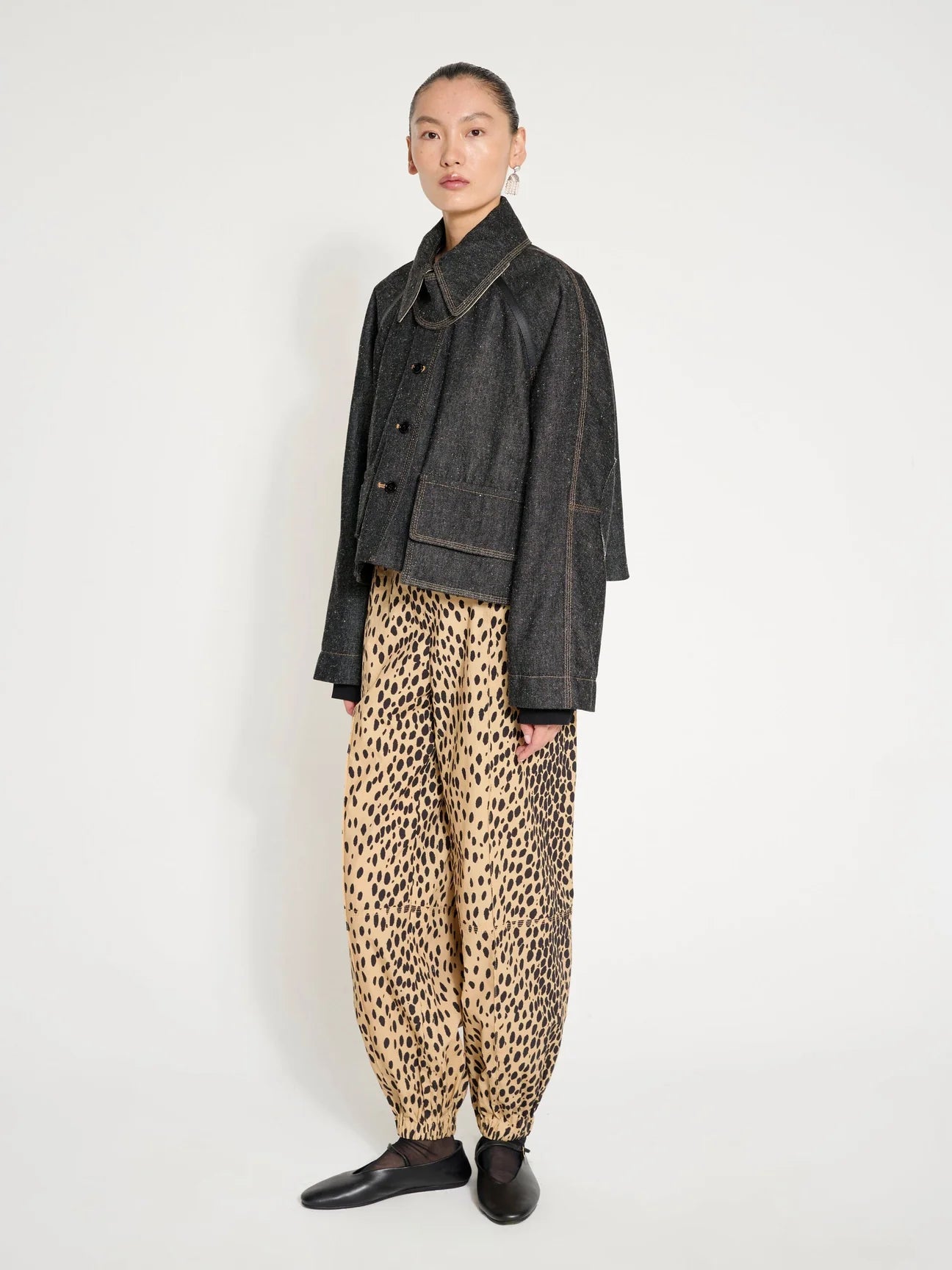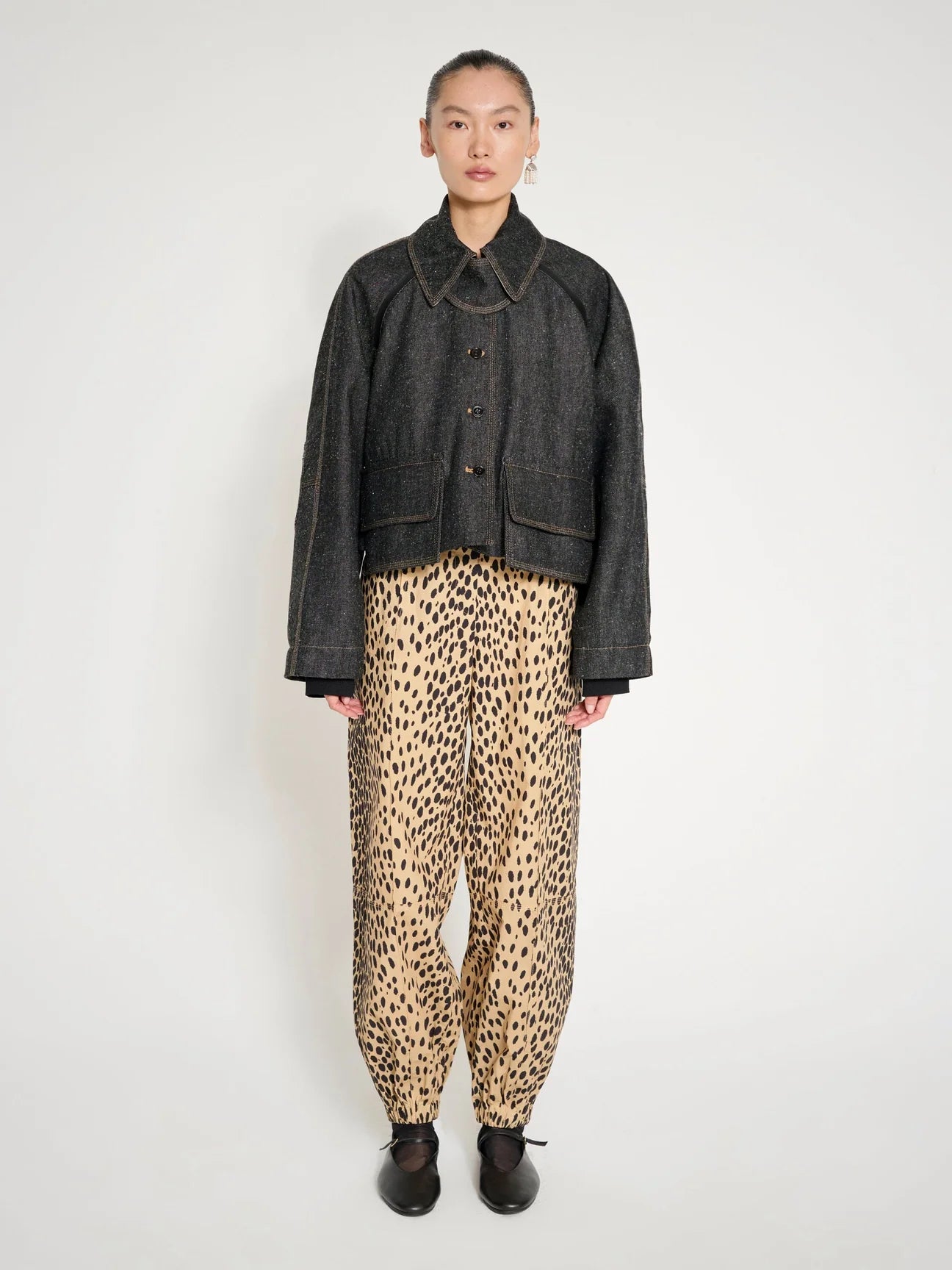 A wide, statement collar and curved front placket add a touch of dramatic tailoring, while the boxy silhouette and dropped shoulders create a relaxed yet sophisticated fit. Oversized front pockets and carefully placed seam details give the jacket a utility-inspired edge without sacrificing elegance.