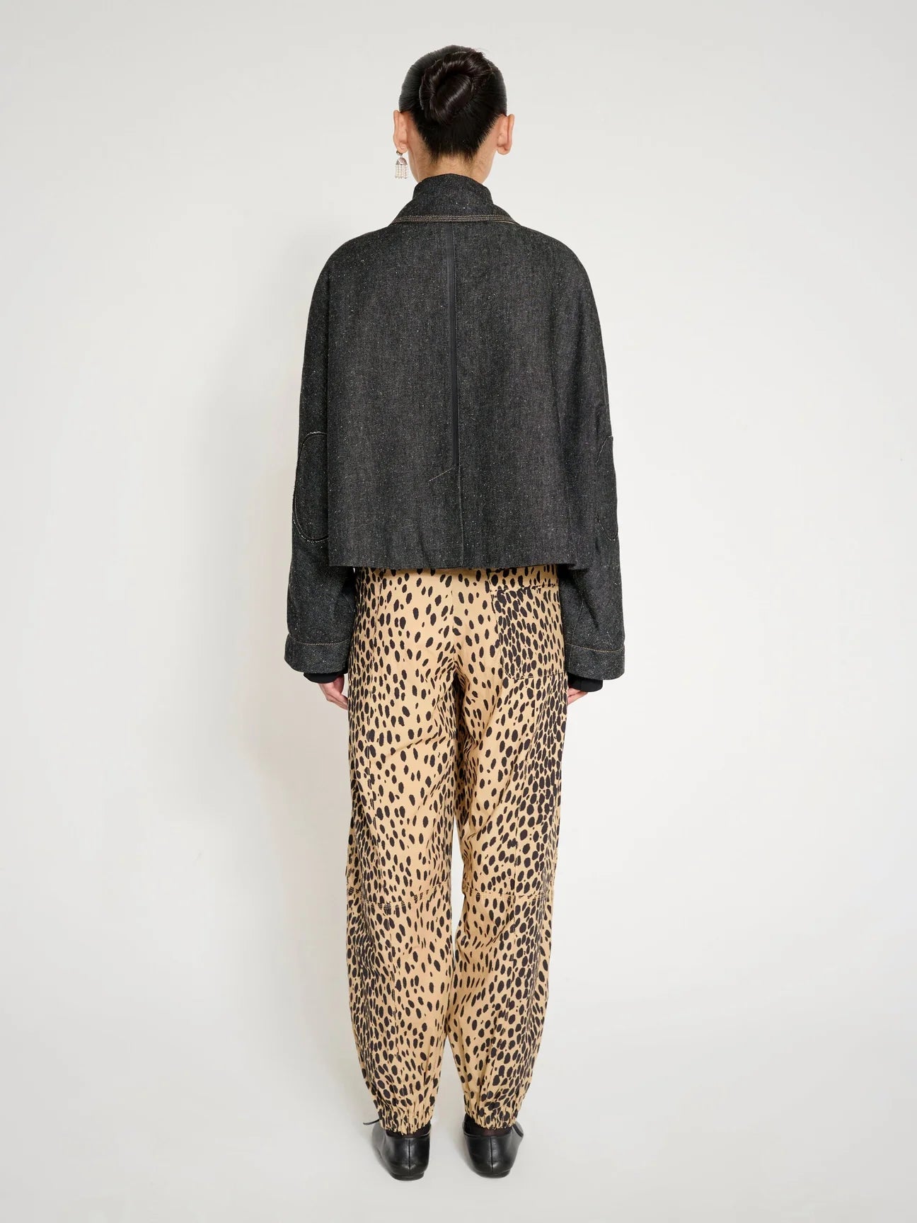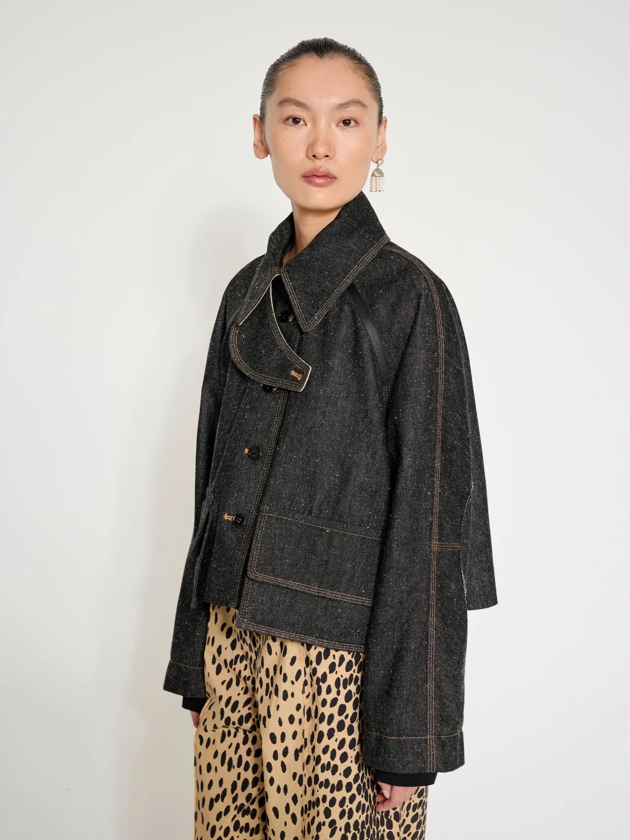 This distinctive cropped jacket from the Istanbul-based label Nackiyé blends sculptural design with artisanal detail. Crafted from a beautifully textured, speckled wool fabric, it offers warmth, structure, and a uniquely tactile look. The deep charcoal tone is elevated by contrasting stitching that highlights the jacket’s architectural lines and refined craftsmanship.