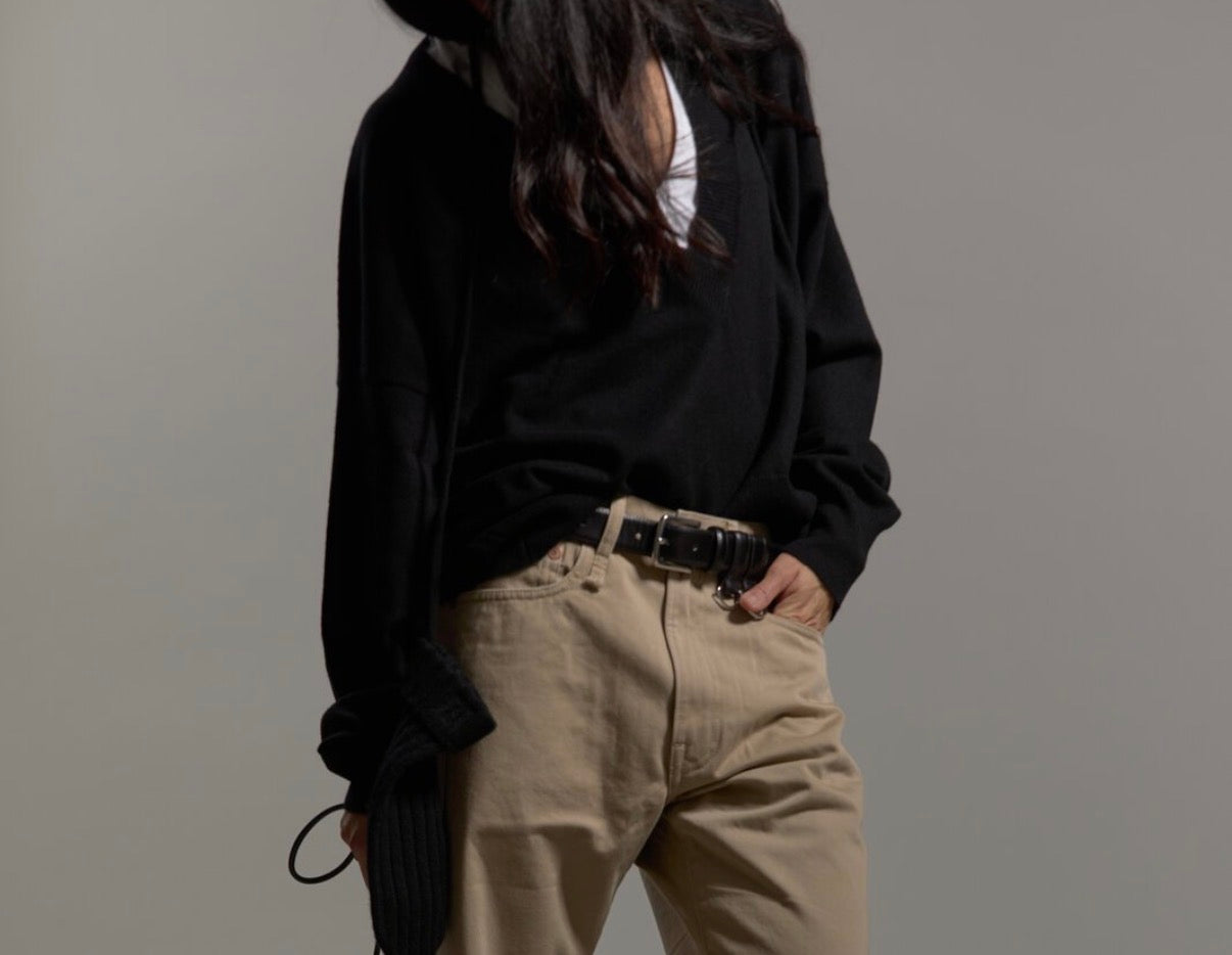 Boxy Pullover with a very deep v-neck in 100% Cashmere. The staple piece which brings you from cozy mornings to fancy dinners in the evening.
