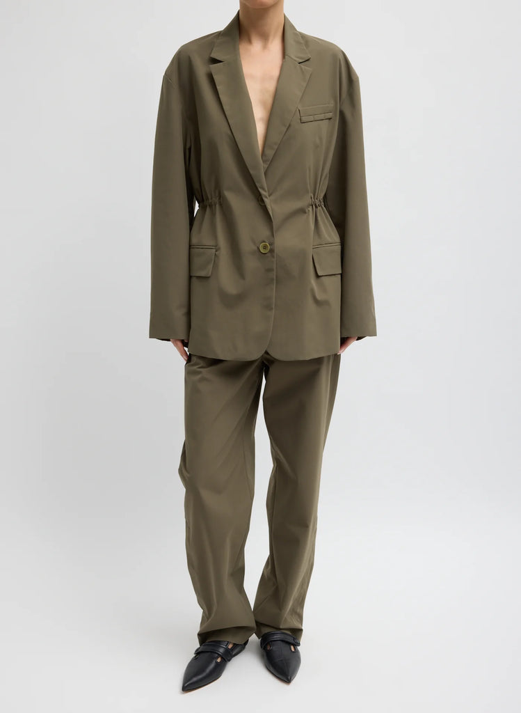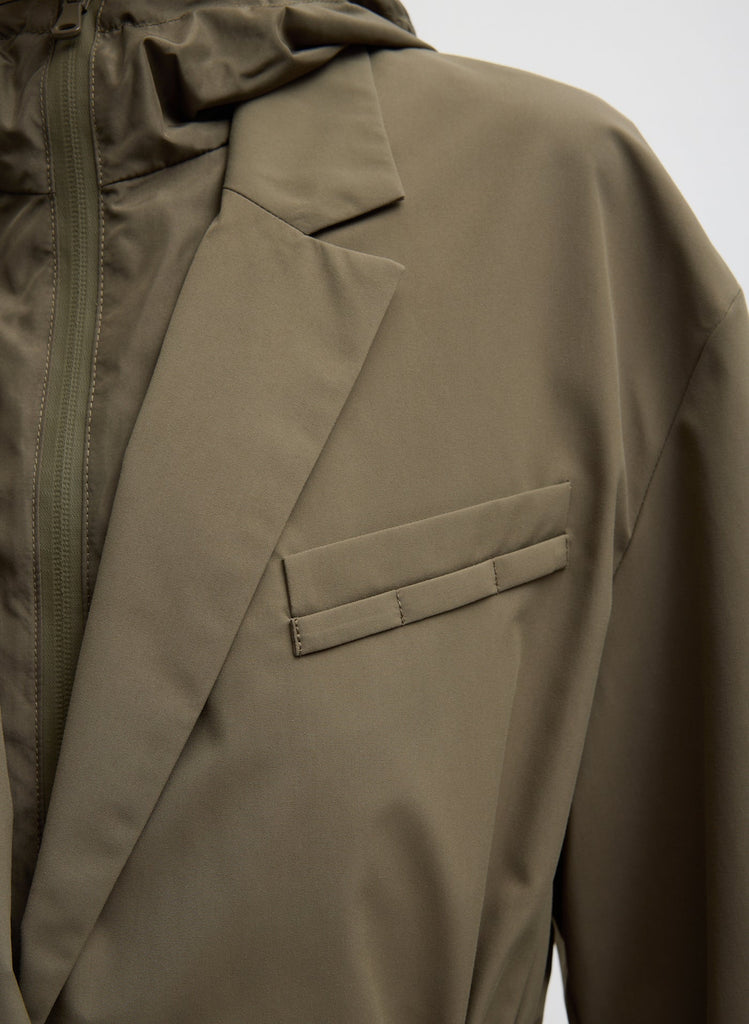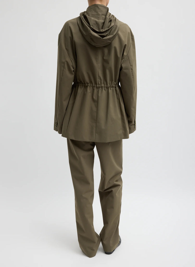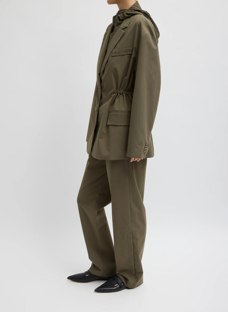 The Tech Suiting Anorak Blazer redefines functional tailoring. Crafted from waterproof bonded nylon with a smooth, durable finish, this style includes a detachable hood and adjustable waist cords that cinch to create a peplum effect. Available in Black and Dark Hazelnut, it pairs effortlessly with the Mark Trouser or Asymmetrical Skirt for a full suit that blends precision and practicality—or wear it solo as outerwear for transitional weather.