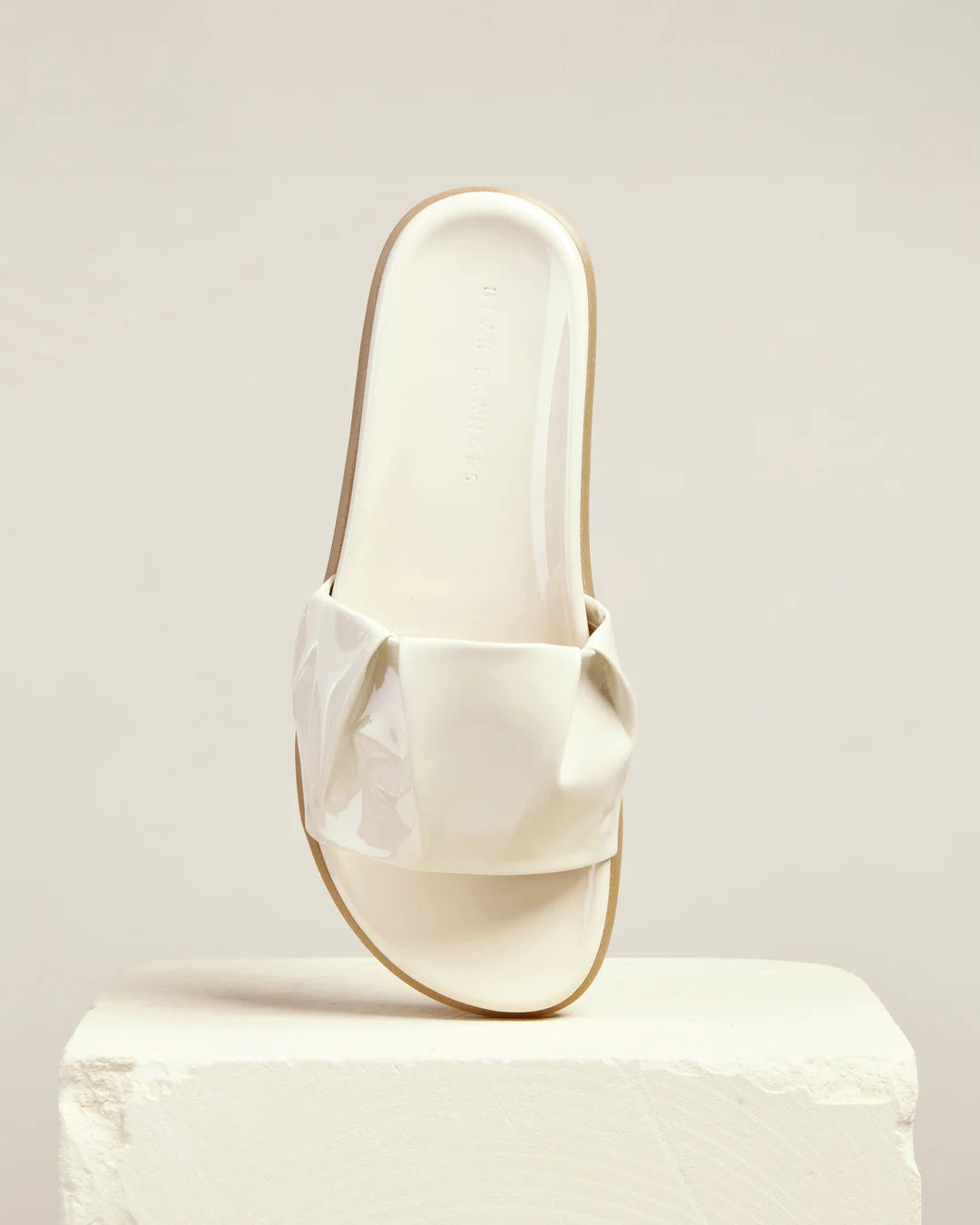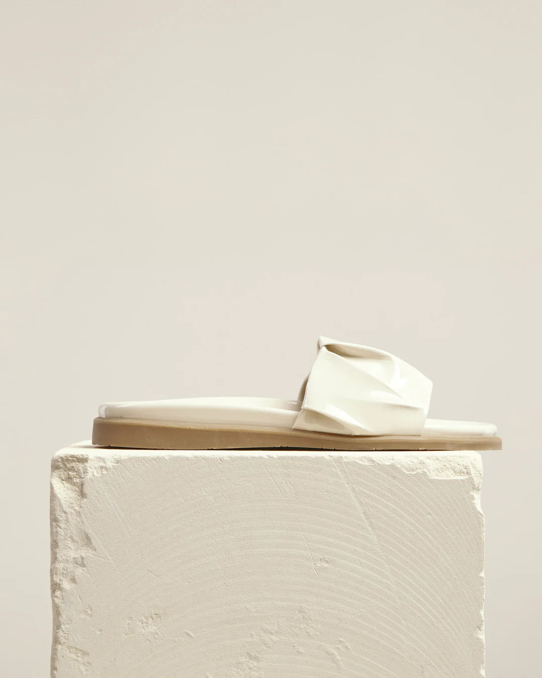 Relaxed yet refined, Pino is our high-shine slider with a laid-back spirit. In gathered patent leather, its generous strap is grounded with a squidgy soft sole, which comfortably embraces the foot for beach getaways and beyond. Enduring in this shade of sand.