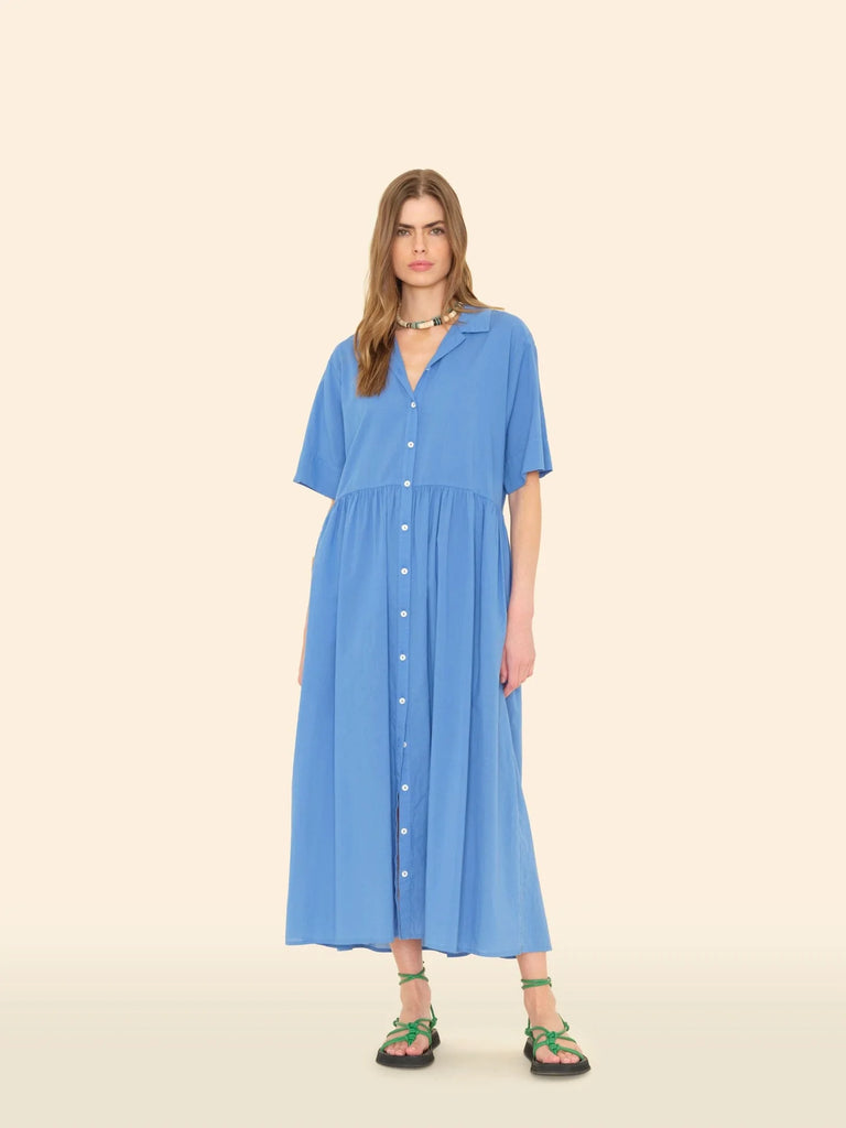 Vacation Mode. Dayton is new this season in Xirenas classic lightweight woven cotton poplin for a lived-in look and feel. Dayton is a fresh take on the classic shirtdress and features a slight drop waist, button-front, elbow sleeves, shirred skirt, and side seam pockets.
