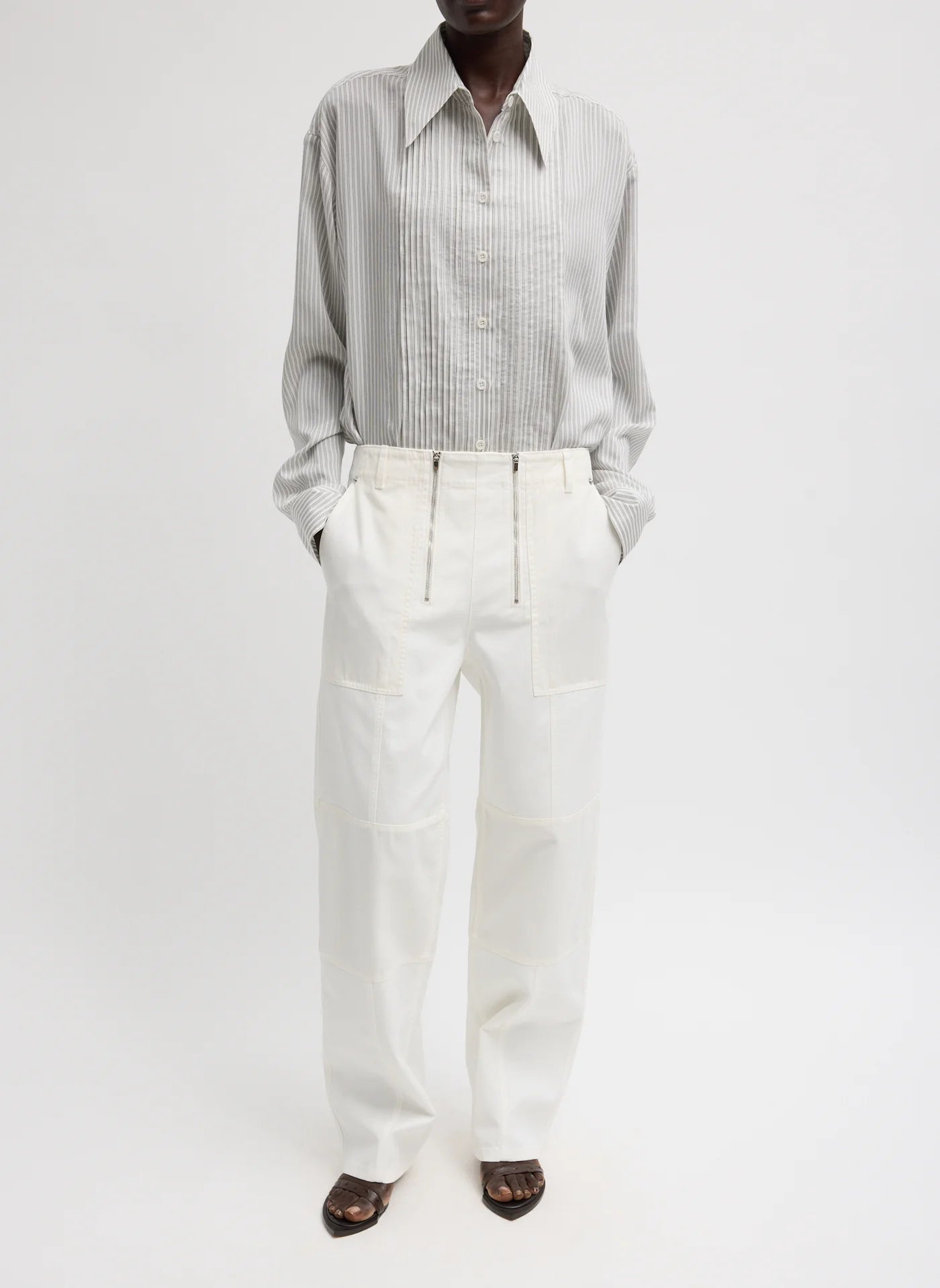 Crafted from ultra light silk Tencel, this striped pintucked shirt has a soft hand feel with subtle sheen and fluid drape. Lightweight and breathable, it is designed to feel effortless while still reading polished. Finished with a classic collar, button front closure, and pintuck detailing, this is a go to top you will reach for again and again. Easy on its own, refined under tailoring, and relaxed with denim.