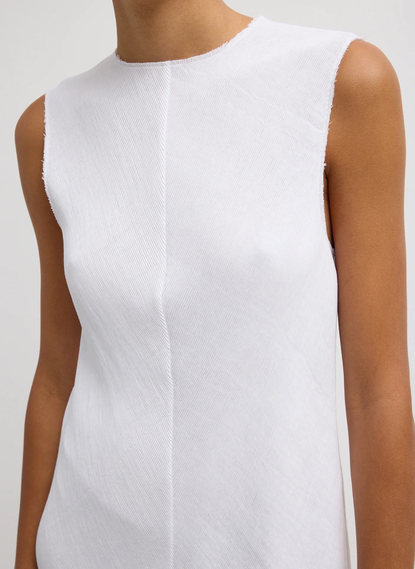 A shorter take on a runway-seen silhouette, the Viscose Plissé Sleeveless Bias Short Tunic Dress is crafted from the same luxe, sustainably sourced viscose plissé. Lightweight with elegant movement, it delivers versatility in a more compact proportion. Finished with a bias cut and back zipper closure, it works equally well worn alone or layered back to coordinating bottoms. Available in Black, White, and Ring 4 Pea Pod.