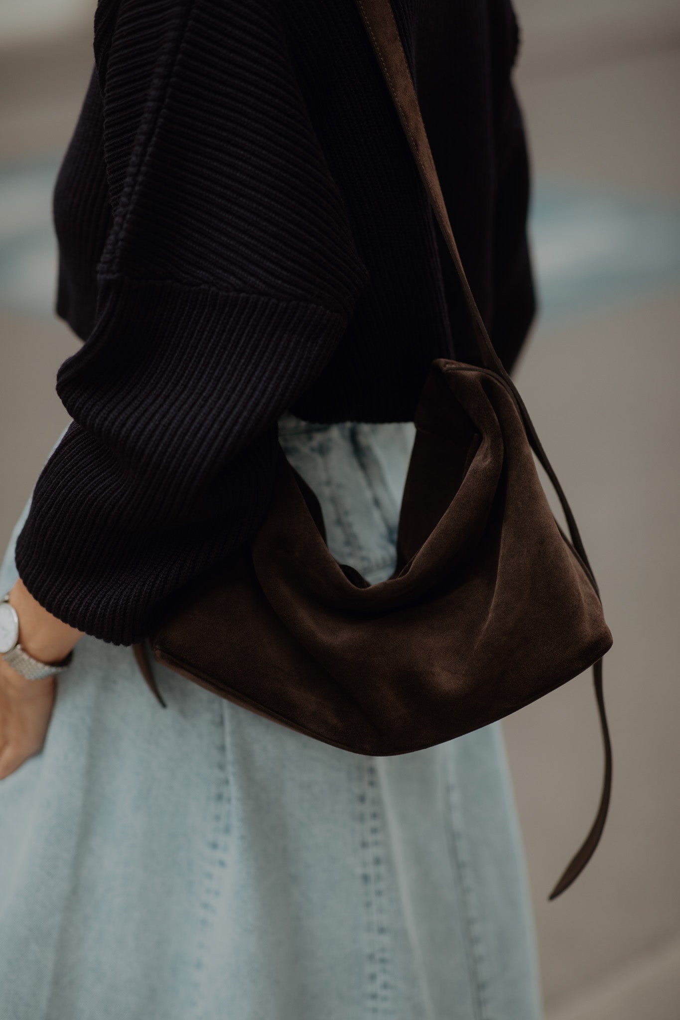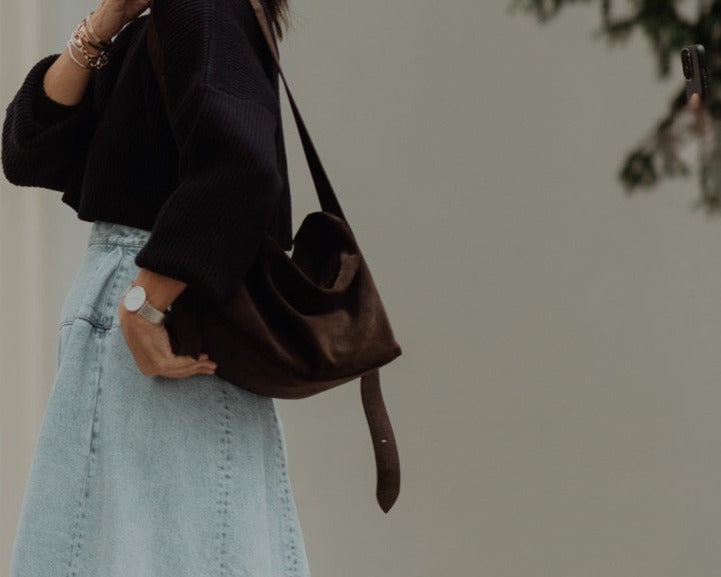 A tribute to a beloved keepsake, the Dee Bag embodies a deep longing for relaxed luxury that is immediately visible and tangible in every stitch. The silky smooth Italian suede hugs the body intuitively, while the bag rests naturally on the shoulder and can be effortlessly opened and closed with one hand thanks to the concealed magnetic closure. The adjustable strap in both suede and smooth leather easily transforms the Dee Bag into a crossbody, offering monochromatic elegance or subtle contrast between the leather sides. The synthesis of the deliberate absence of a logo, meticulous attention to detail and exceptional comfort creates a natural lightness that makes the Dee Bag an indispensable companion. For every style and every day.