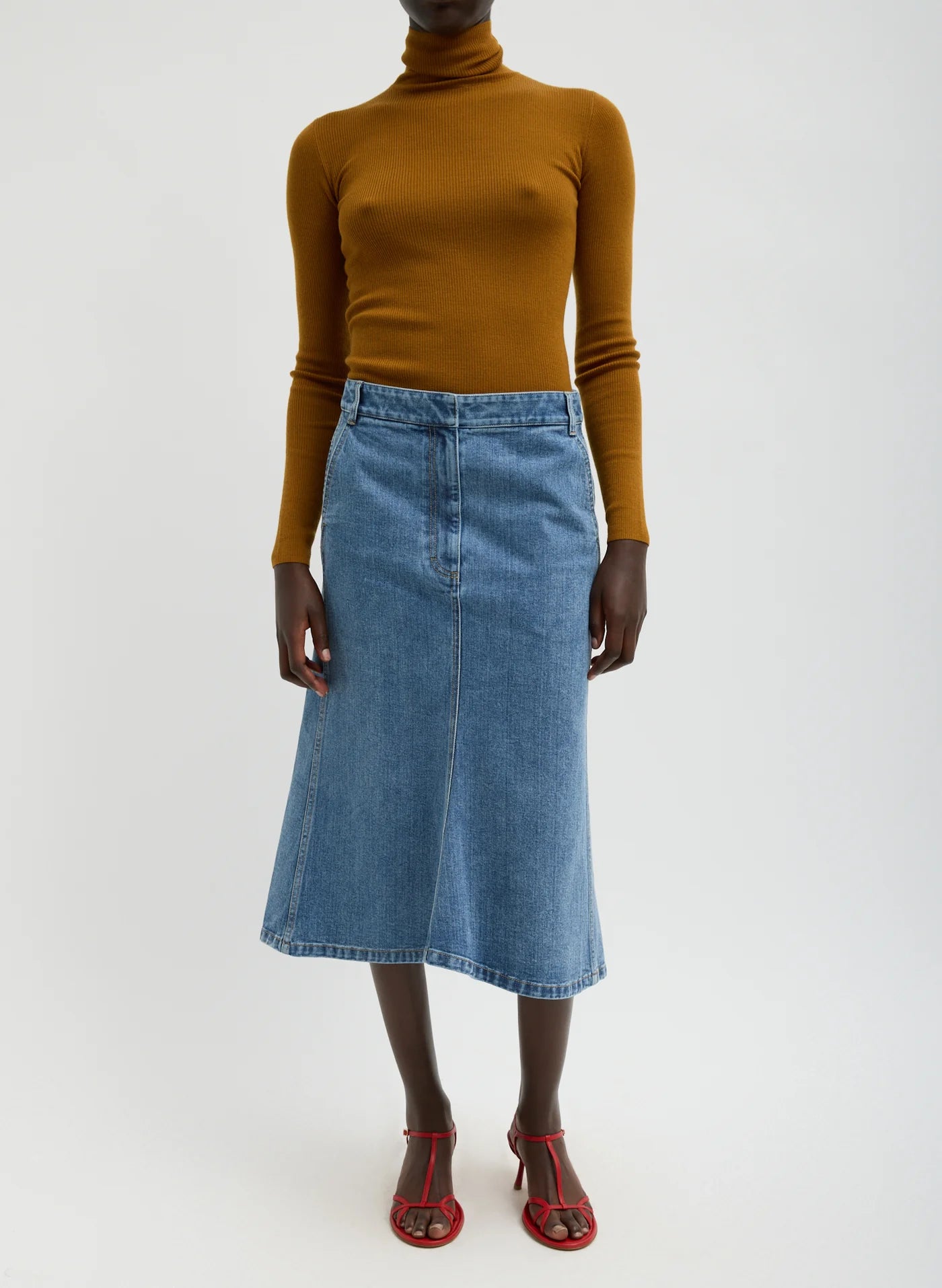 A sculpted silhouette with built-in versatility, the Classic Denim Sculpted Silke Skirt is crafted from a refined Japanese denim that holds its shape while allowing for ease of movement. Midi-length with a fluted hem, pockets at front and back, and functional belt loops, it strikes the perfect balance of structure and softness. Pair it back to the coordinating Moto Bomber for a modern denim set, or style it with the Featherweight Turtleneck Sweaters for a refined contrast in texture and color.