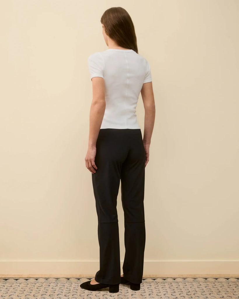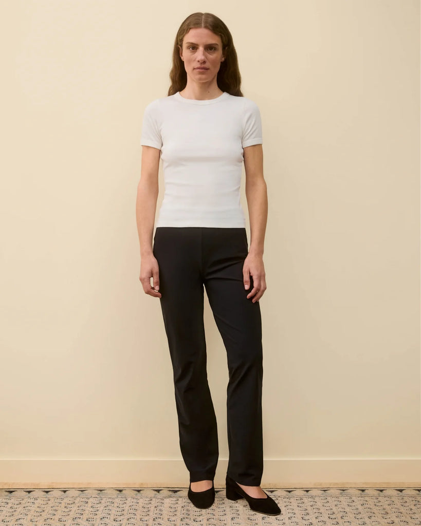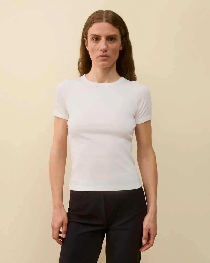 A fitted tee with a lengthened short sleeve, round bindings, and a double-stiched cut-off seam on the back. Made from soft, medium-weight organic cotton rib.