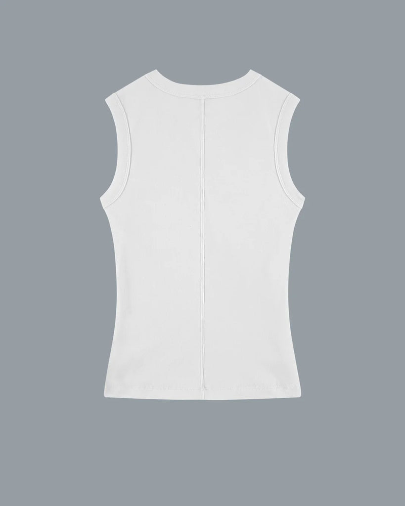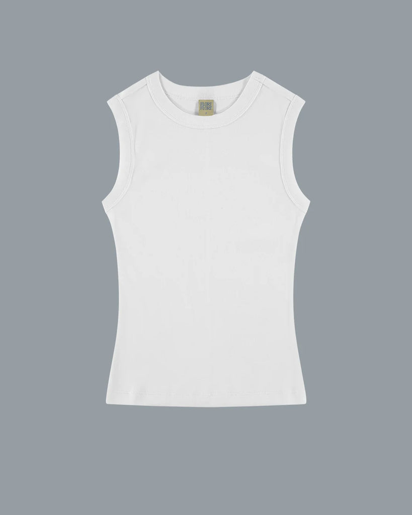 A fitted crew neck tank with scooped-out armholes and a cut-off seam on the back, crafted from medium-weight organic cotton rib. Layer or wear on its own.