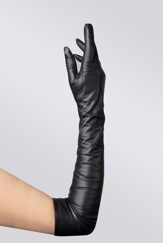 Our Essentials Extra Long Black opera gloves are made out of premium nappa leather from Italy. The gloves have silk lining for added comfort and warmth. Touchscreen functionality with each index finger. Snug fit.