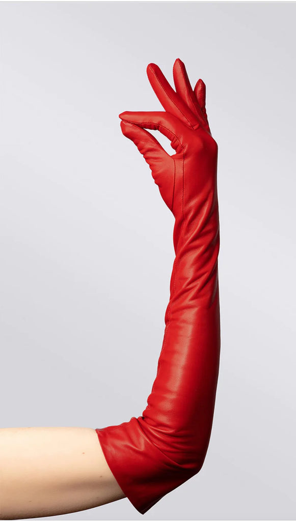 Our Essentials Extra Long Red opera gloves are made out of premium nappa leather from Italy. The gloves have silk lining for added comfort and warmth. Touchscreen functionality with each index finger. Snug fit.