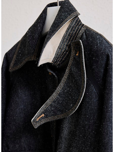 This distinctive cropped jacket from the Istanbul-based label Nackiyé blends sculptural design with artisanal detail. Crafted from a beautifully textured, speckled wool fabric, it offers warmth, structure, and a uniquely tactile look. The deep charcoal tone is elevated by contrasting stitching that highlights the jacket’s architectural lines and refined craftsmanship.