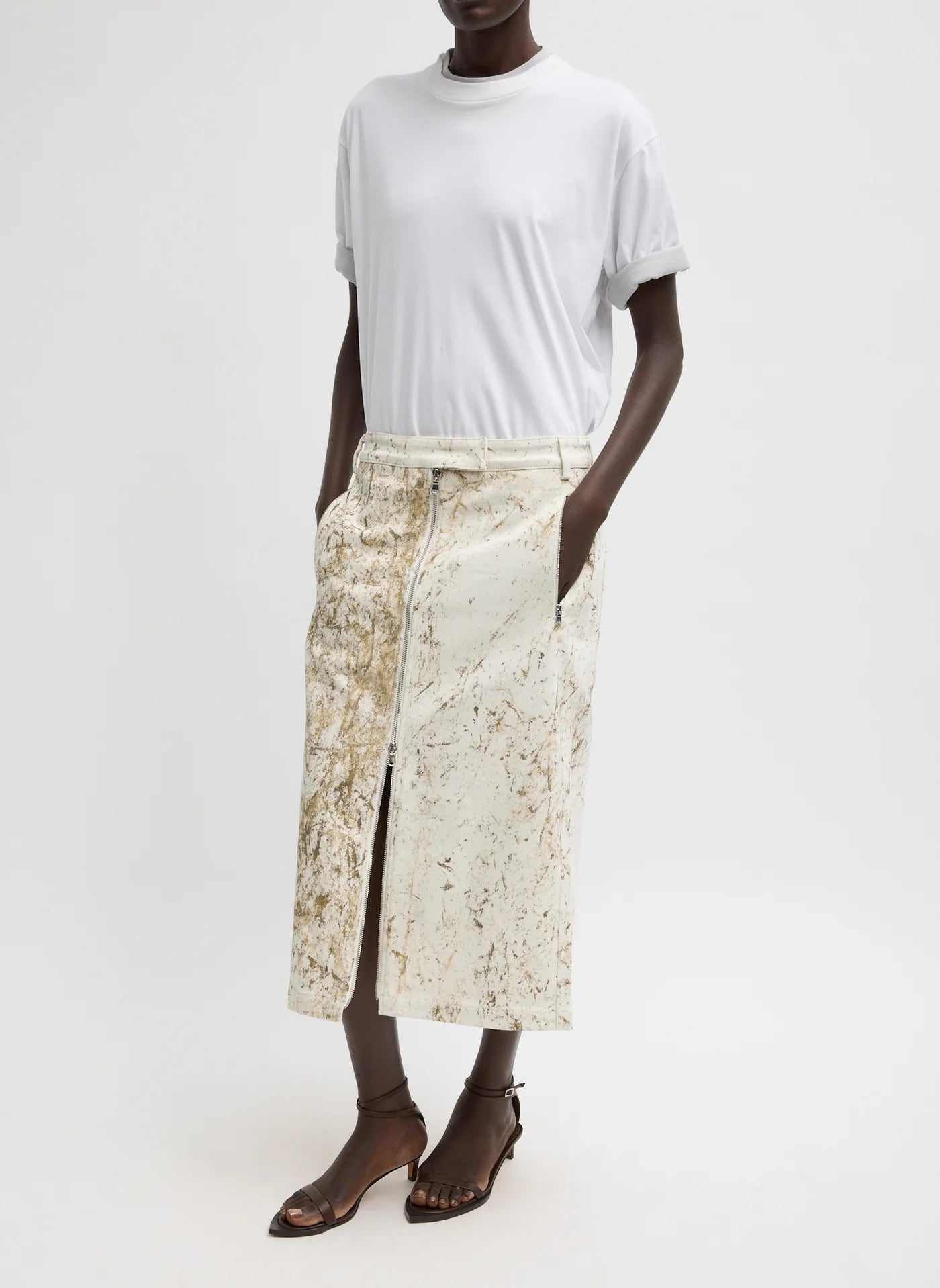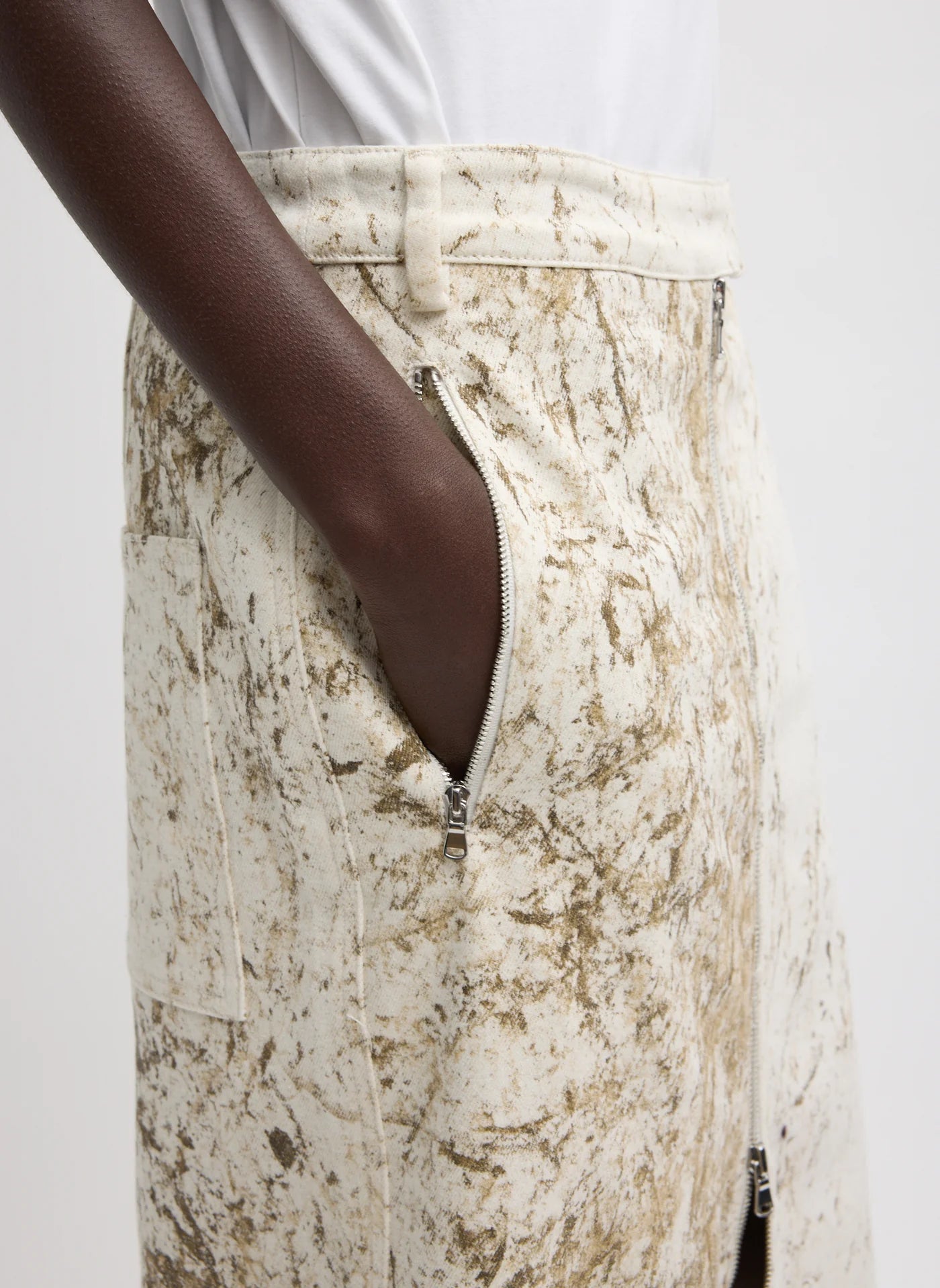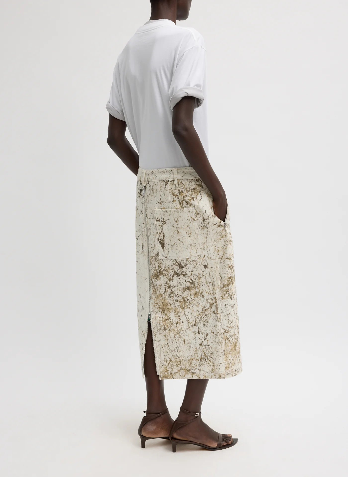 The Calcimin Denim Midi Trouser Zip Skirt offers a fresh take on the classic pencil silhouette. Cut with a slim shape, it features adjustable zipper details at the front and back that allow you to create slits and customize the look depending on how you wear it. Crafted from Calcimin denim, each piece is dyed and finished using a custom tumbling technique that creates subtle texture and depth—an artisanal finish, not a print—making every skirt unique. Finished with zip pocketing for added function, this style balance's structure and flexibility, giving you control over proportion, movement, and ease.