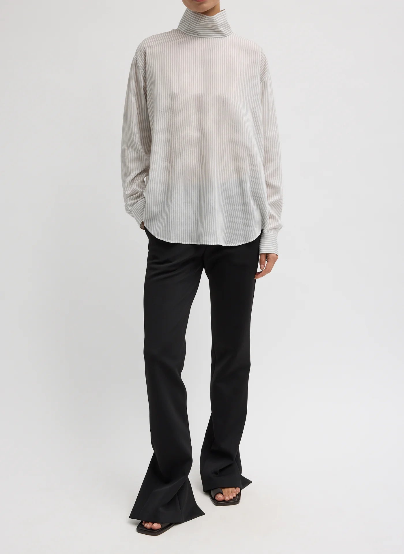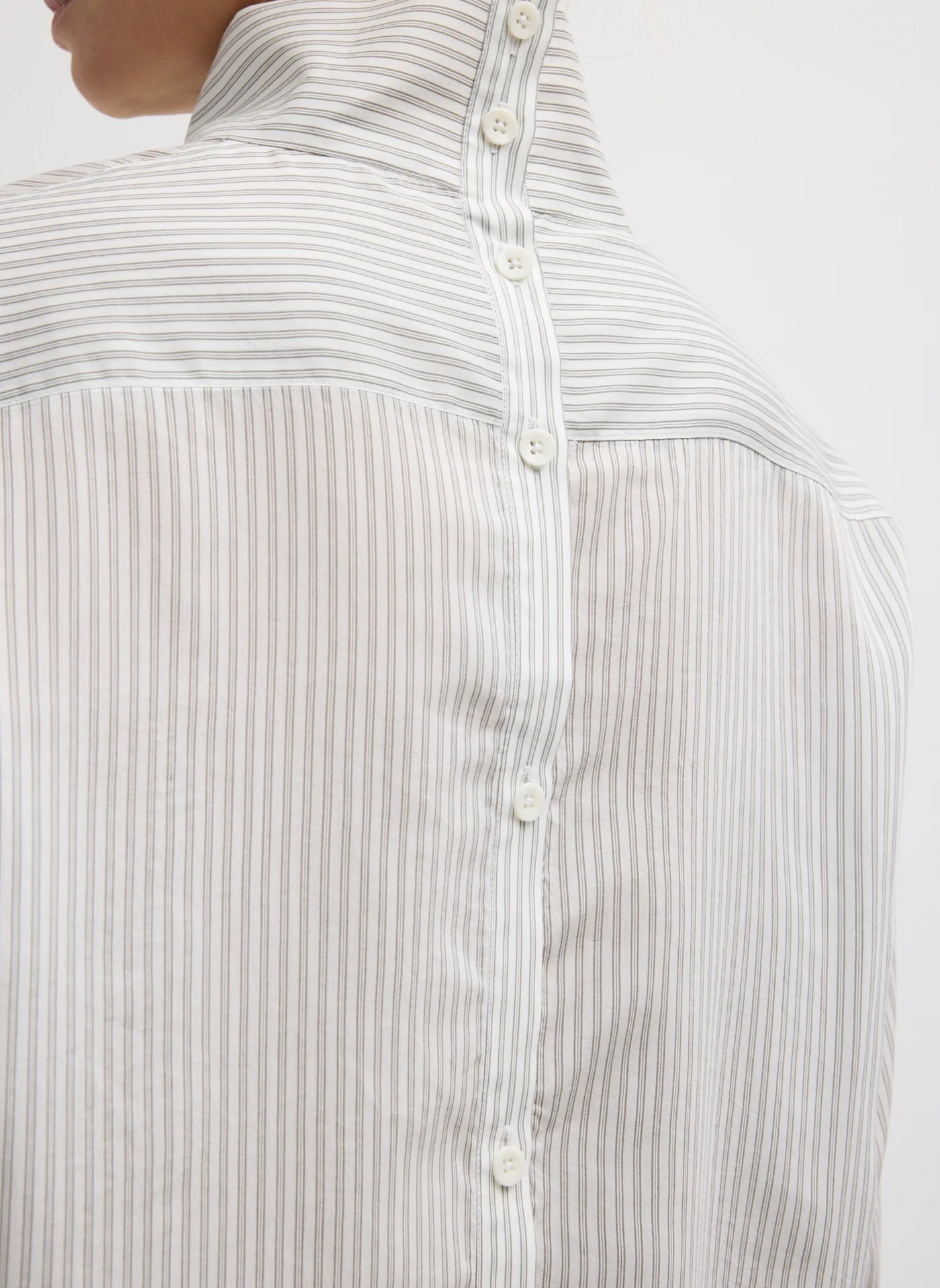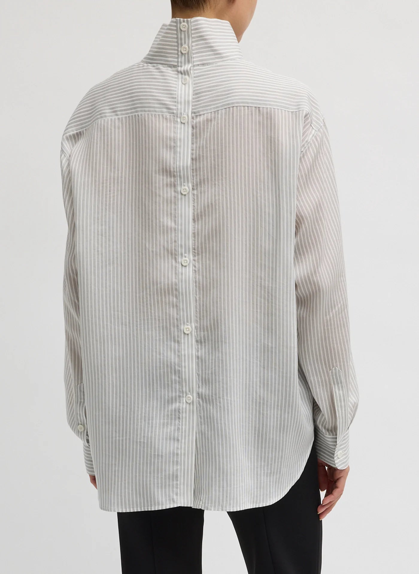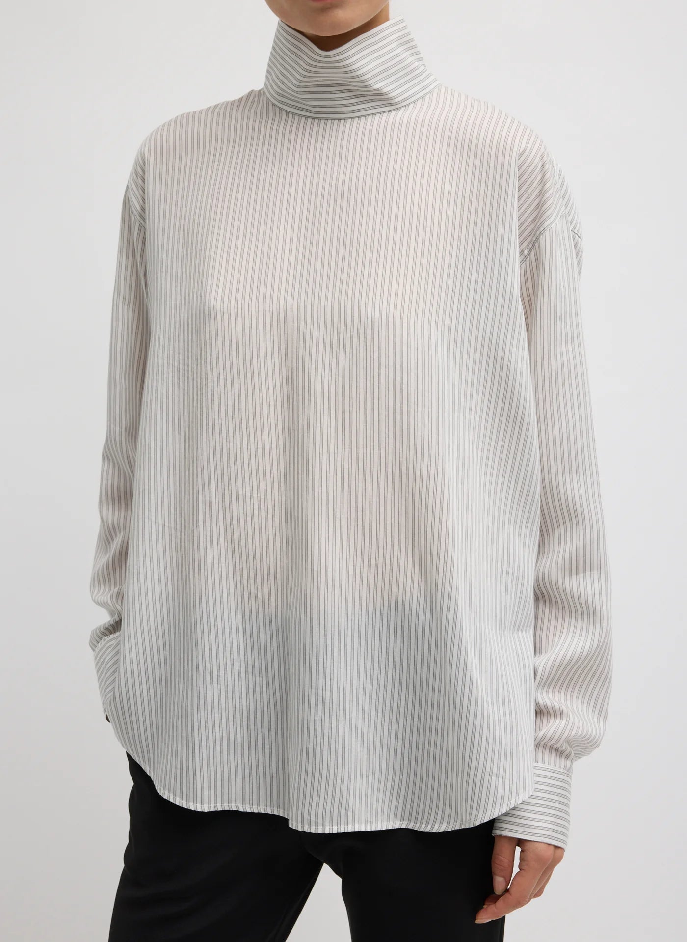The Ultra Light Silk Tencel Striped Funnel Neck Shirt is an elevated essential. Crafted from a lightweight silk blend with soft drape and subtle sheen, it offers ease with a modern edge. Featuring button-back detailing for versatile styling. Easy on its own, refined under tailoring, and relaxed with denim.